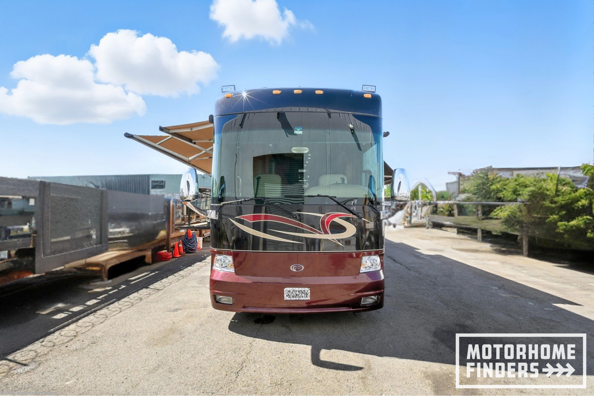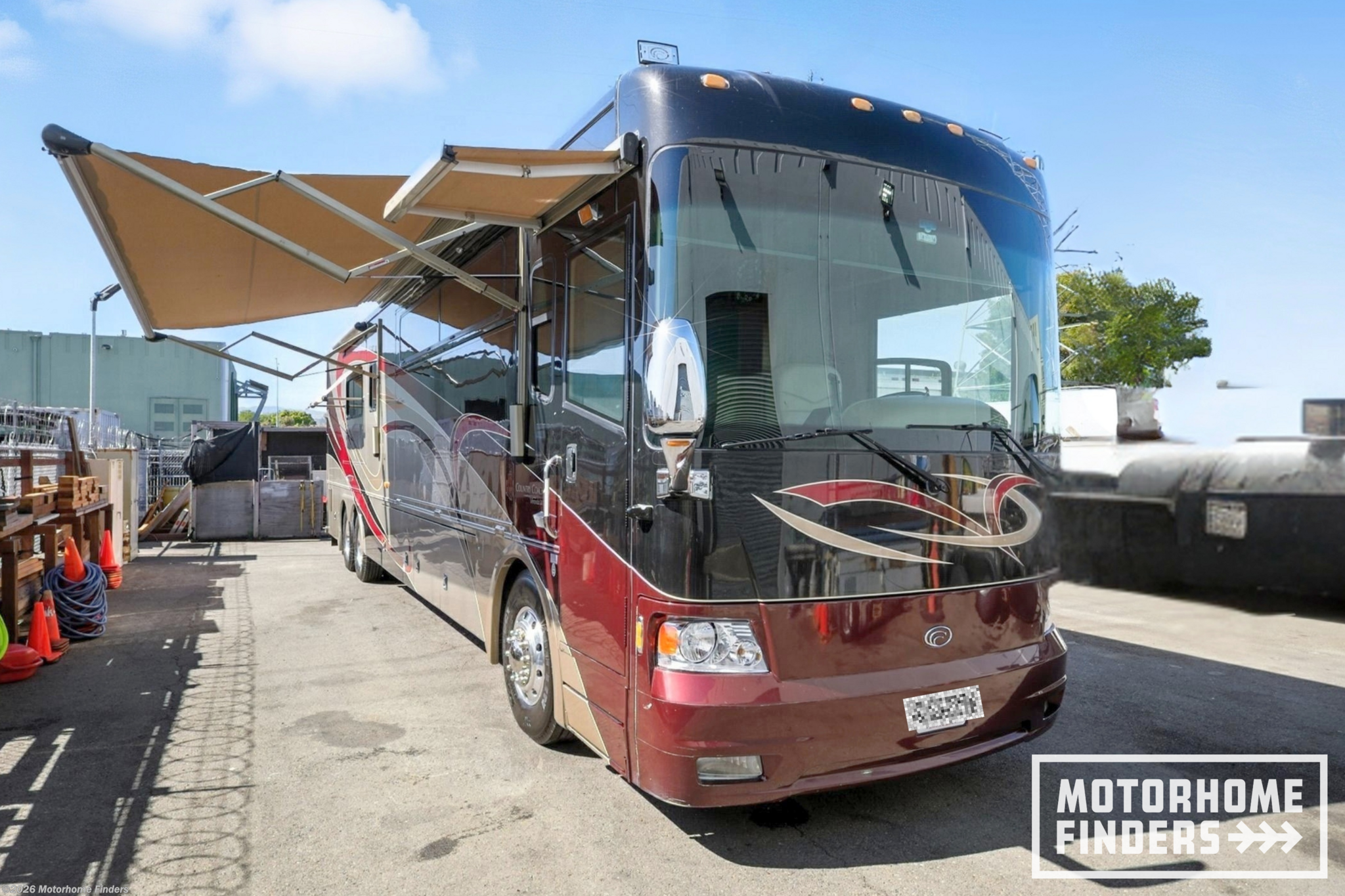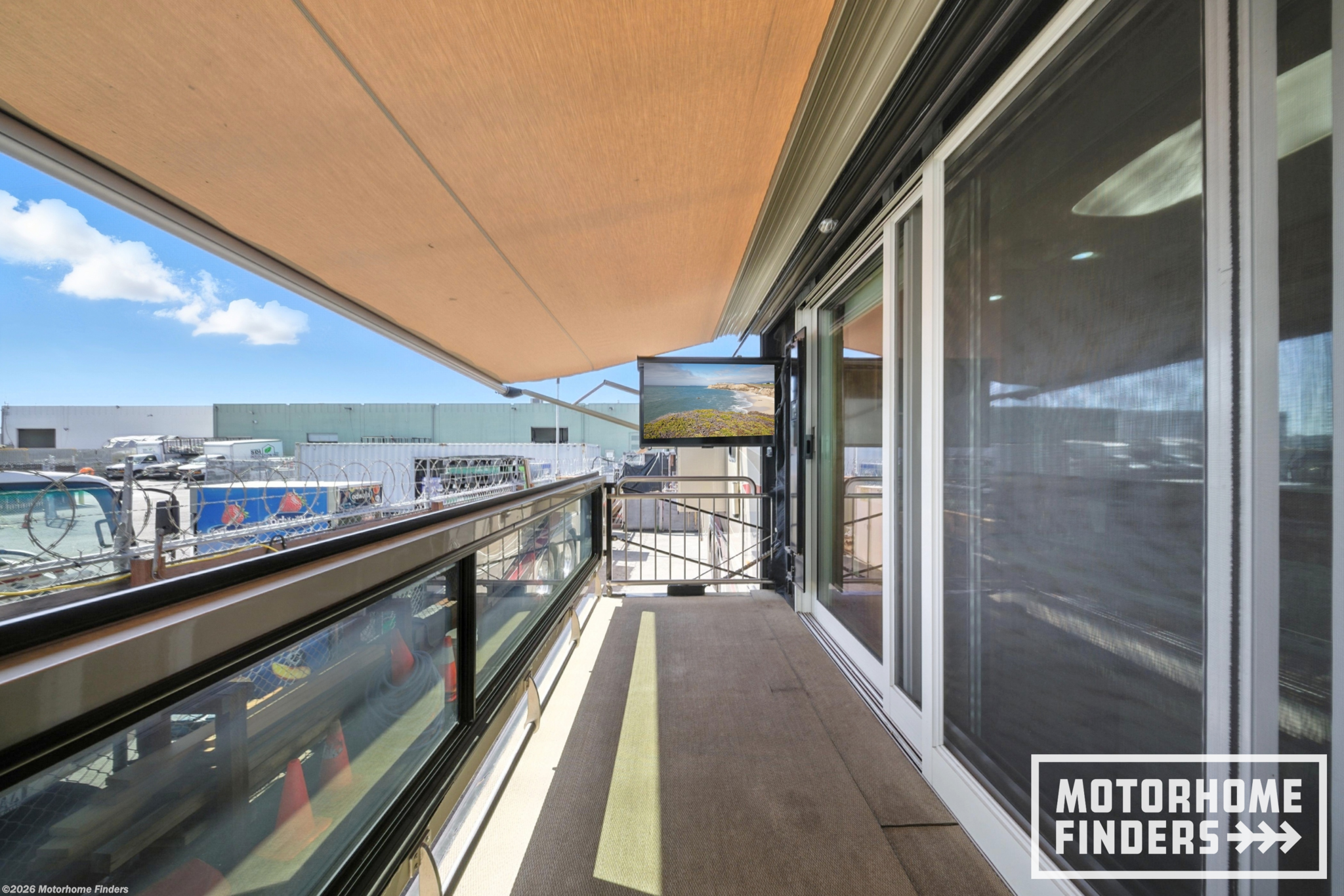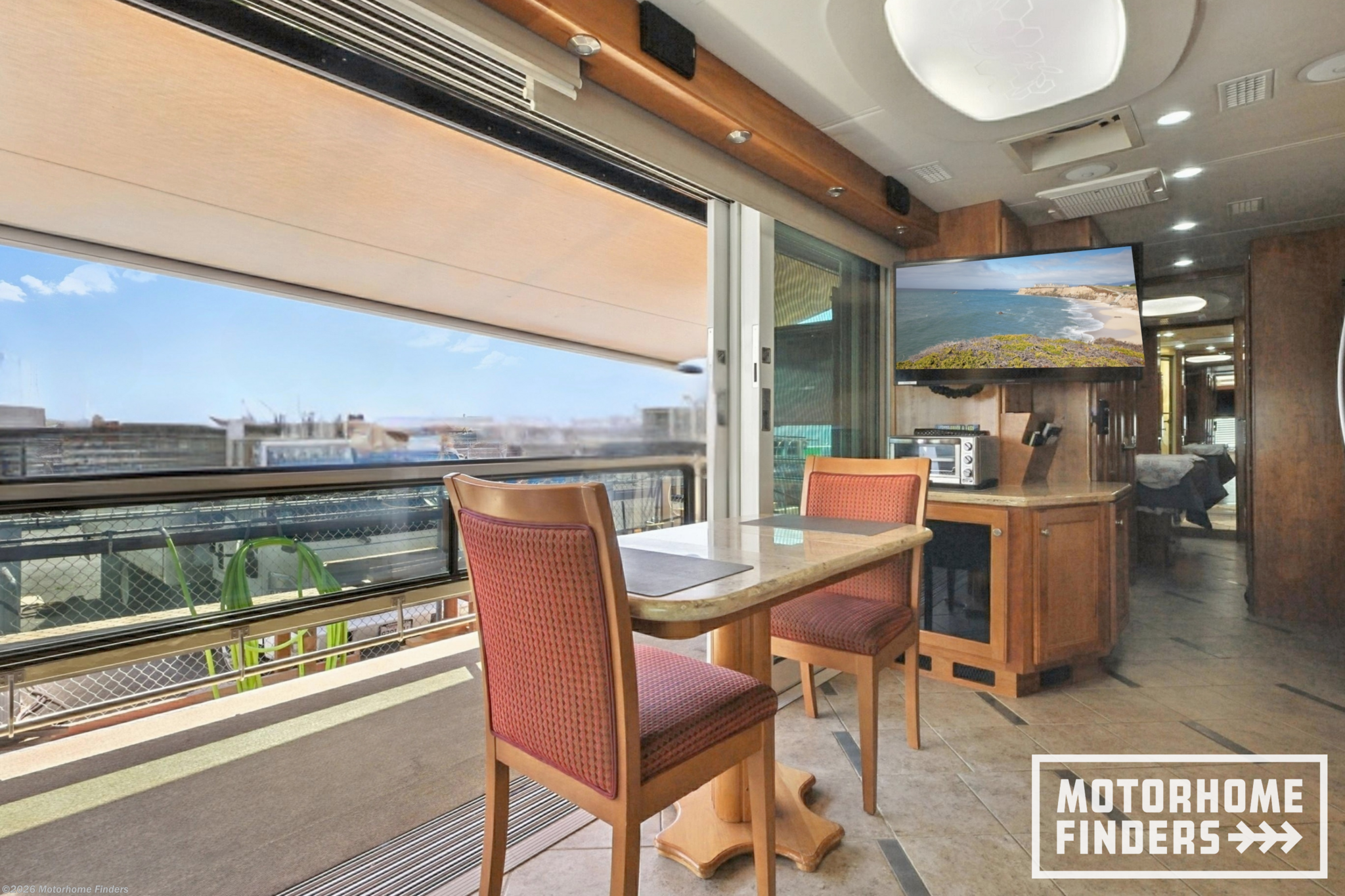 This one-of-a-kind luxury motorhome is one of only 30 built in 2009–2010, making it a true conversation piece wherever you travel. The hallmark feature is the hydraulic drop-down porch—bringing the outdoors in through three hurricane-rated sliding glass doors with screens for unmatched ventilation and panoramic views. Designed for comfort, style, and extended travel, this 43' diesel pusher blends high-end craftsmanship with rare functionality.