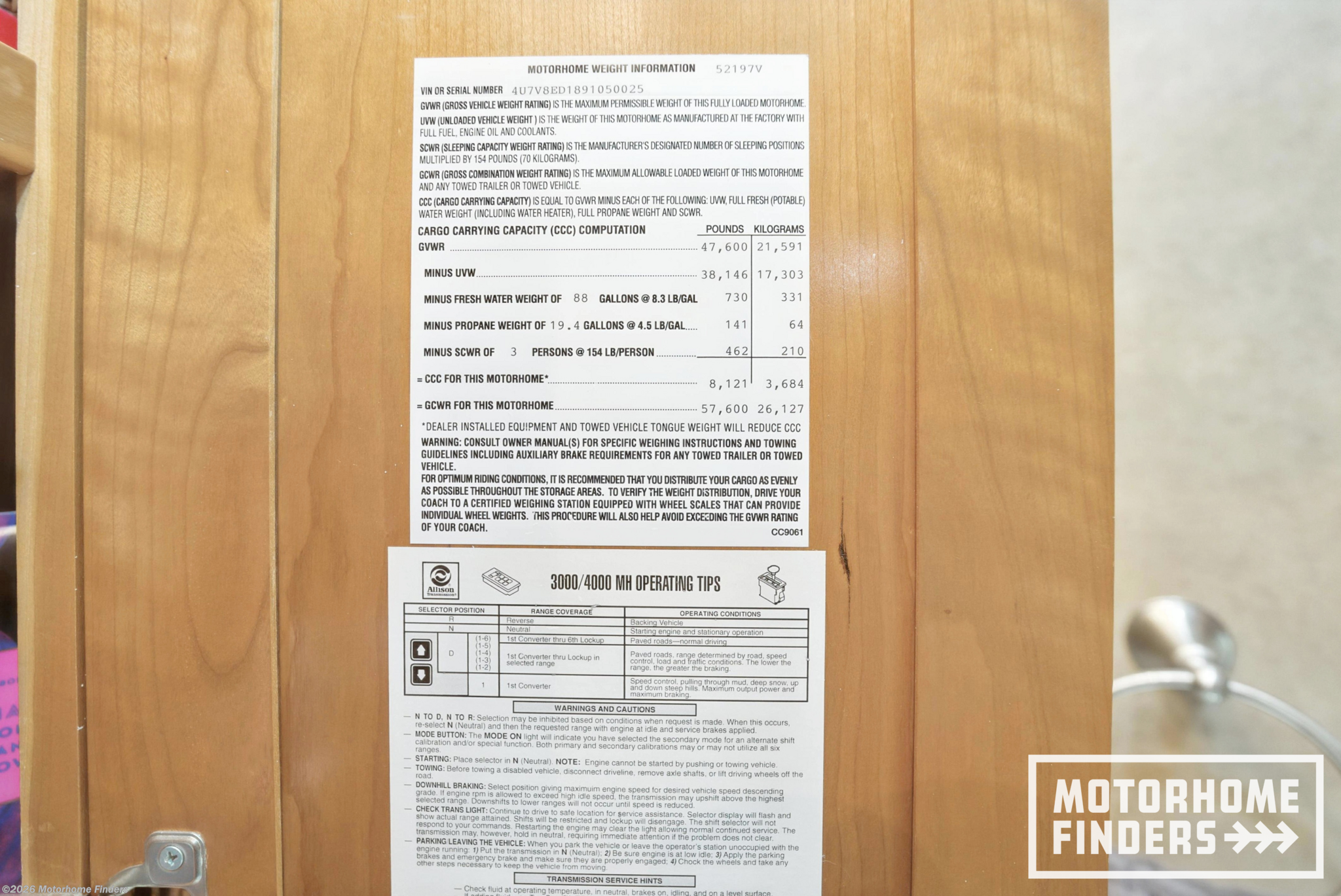 12,000 W Onan Diesel Generator & 2,000 W Inverter – Power your coach and electronics anywhere without hookups.