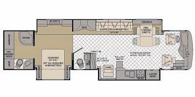 This is a bath and a half floor plan with three slides: one large slide encompassing the living area and the bedroom, and two slides on the passenger side (one in the living area and one in the bedroom).