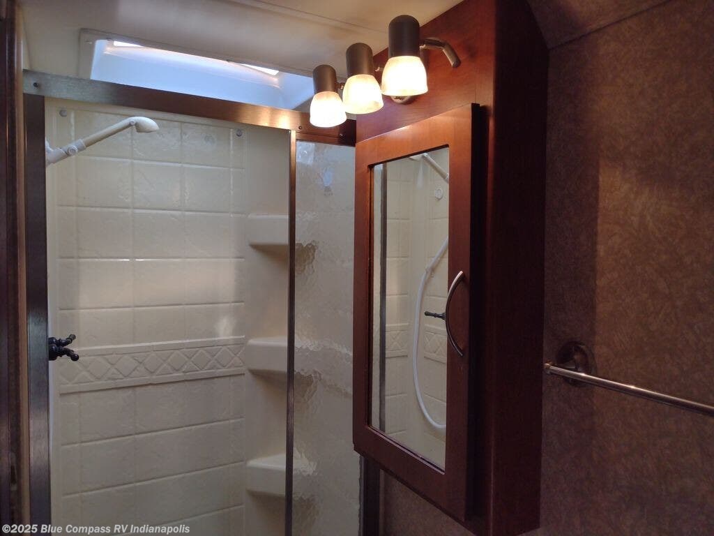 Rear corner bathroom with shower, vanity, and toilet for on-the-road convenience
