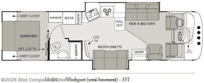 Double Slide Windsport w/Rear Queen Bed, Shirt Closets, Wardrobe, Refrigerator, Pantry, Double Kitchen Sink/3 Burner Range/Pull-Out Counter & Hide-A-Bed Sofa Slide, TV Above Cab Area, Lounge Chair, Slideout Booth Dinette, LCD TV, Shower, Lav., Choice of Engine & Chassis & Much More. Ford Specifications Area Shown. Workhorse Available.