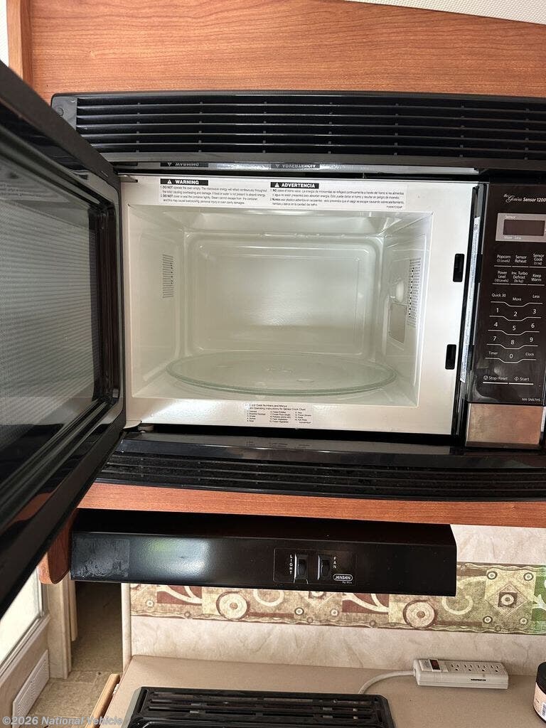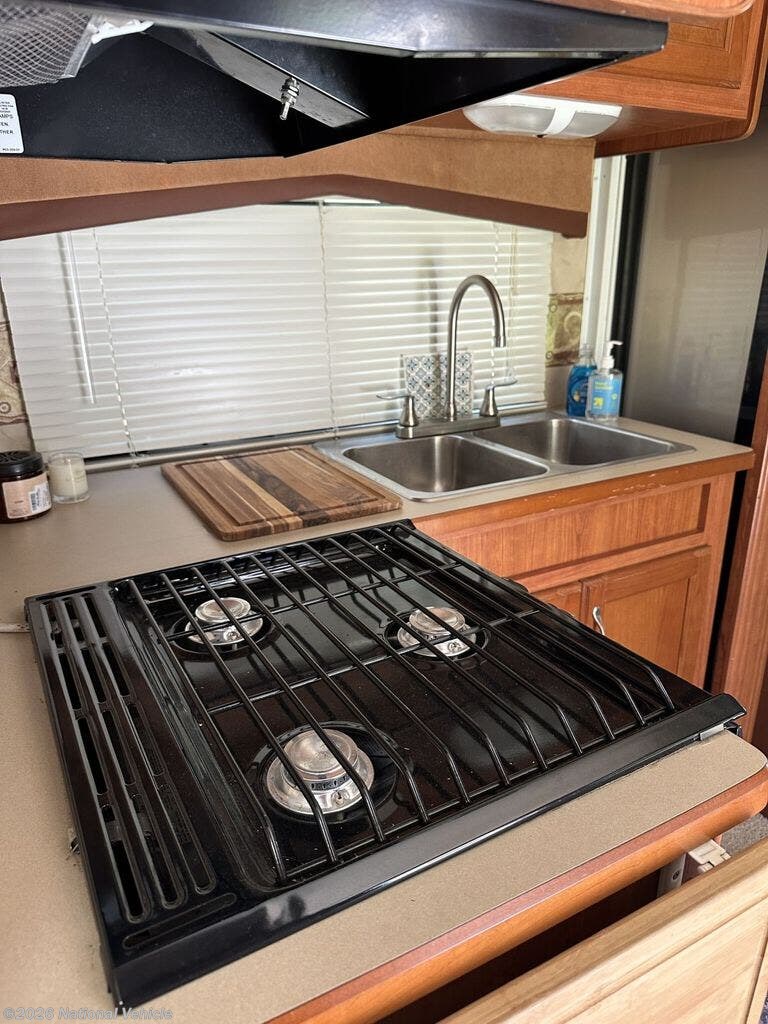 The kitchen is built for real use, featuring solid surface countertops, a large double-door refrigerator, microwave, and 3-burner range. Brushed nickel fixtures add a modern touch, and a 15,000 BTU A/C keeps the coach comfortable even in the heat.