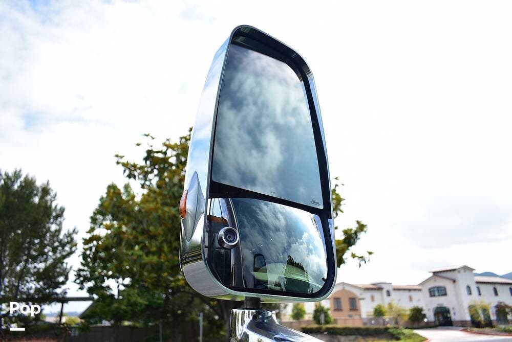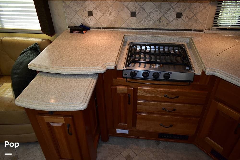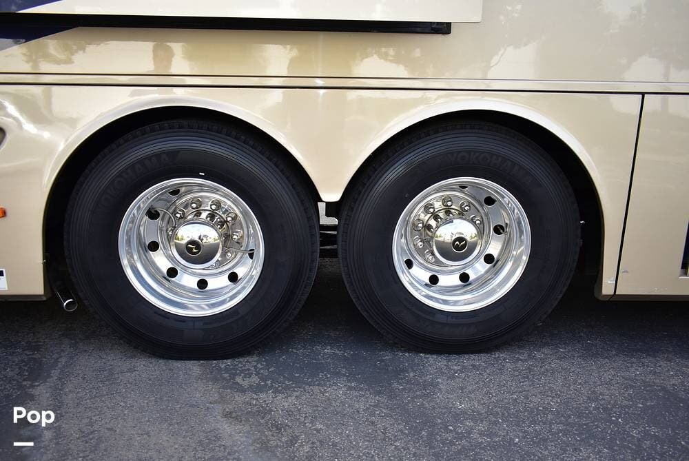 Inside, you'll find a beautifully appointed interior with four spacious slide-outs, high-end hardwood cabinetry, solid surface countertops, tile flooring, and premium leather seating.