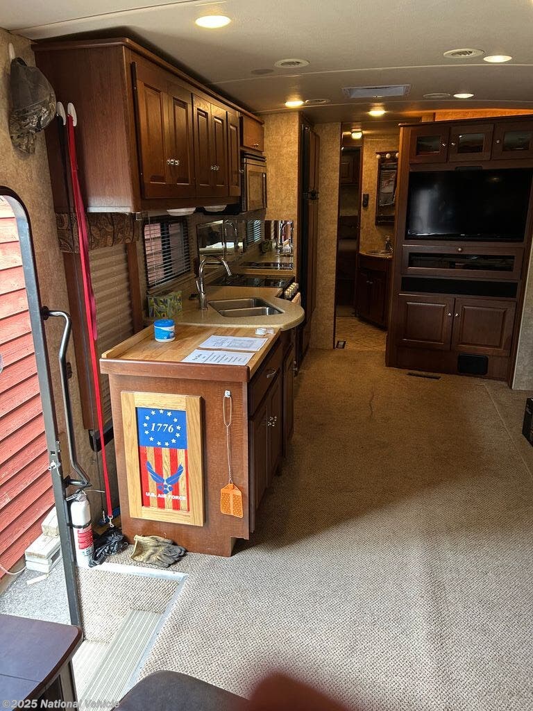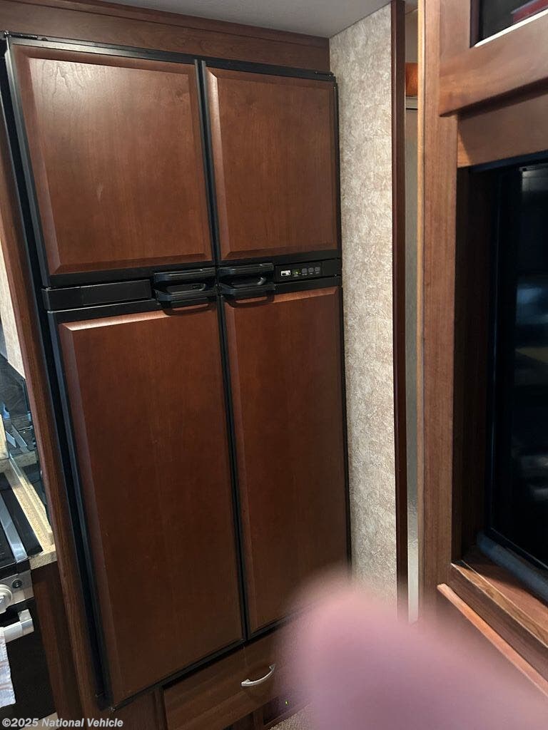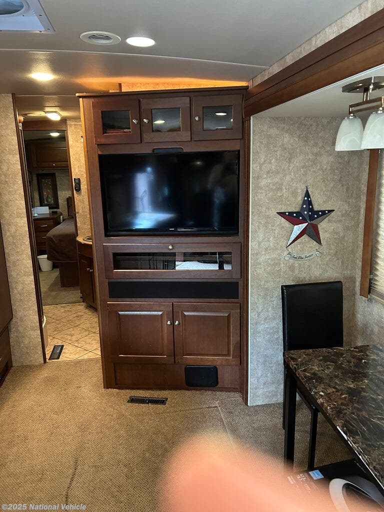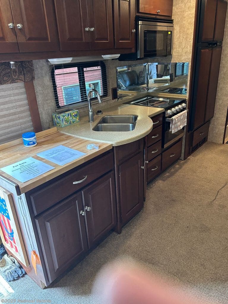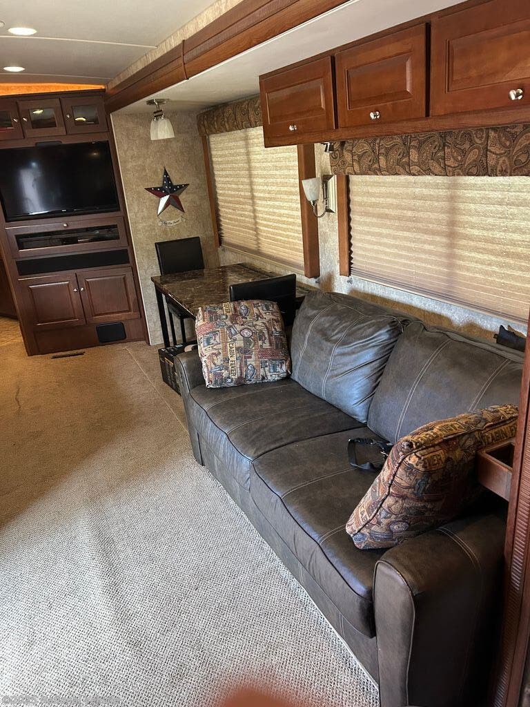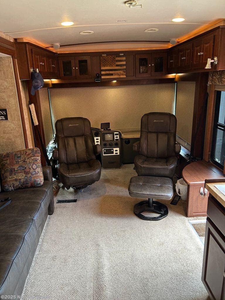 Inside, the Destination 37G features a dual-slide layout that maximizes living space and creates a bright, open atmosphere. The comfortable living area includes a sofa, and a full entertainment center, perfect for relaxing or entertaining guests. The well-appointed kitchen offers solid-surface countertops, a refrigerator, three-burner cooktop, oven, microwave, and ample cabinetry, making meal preparation convenient and enjoyable on the road.