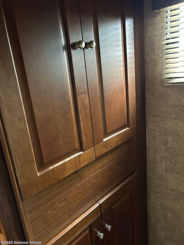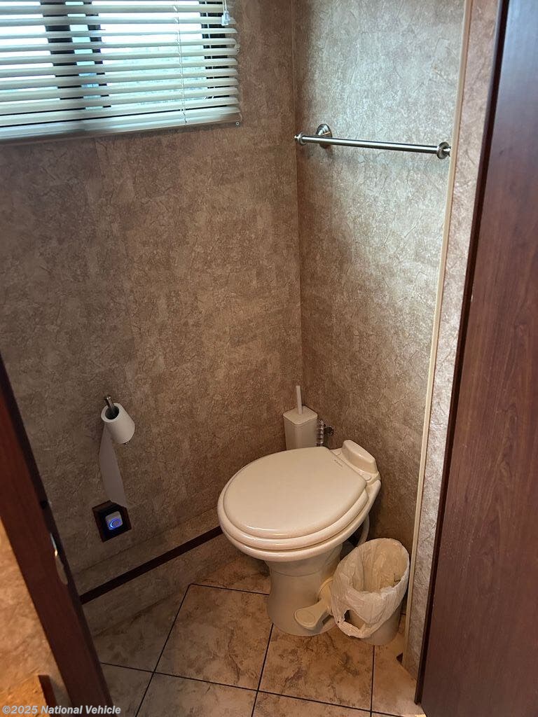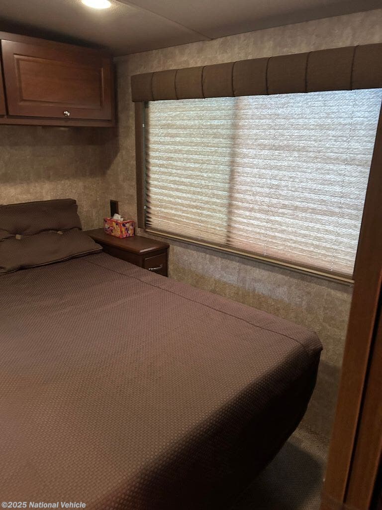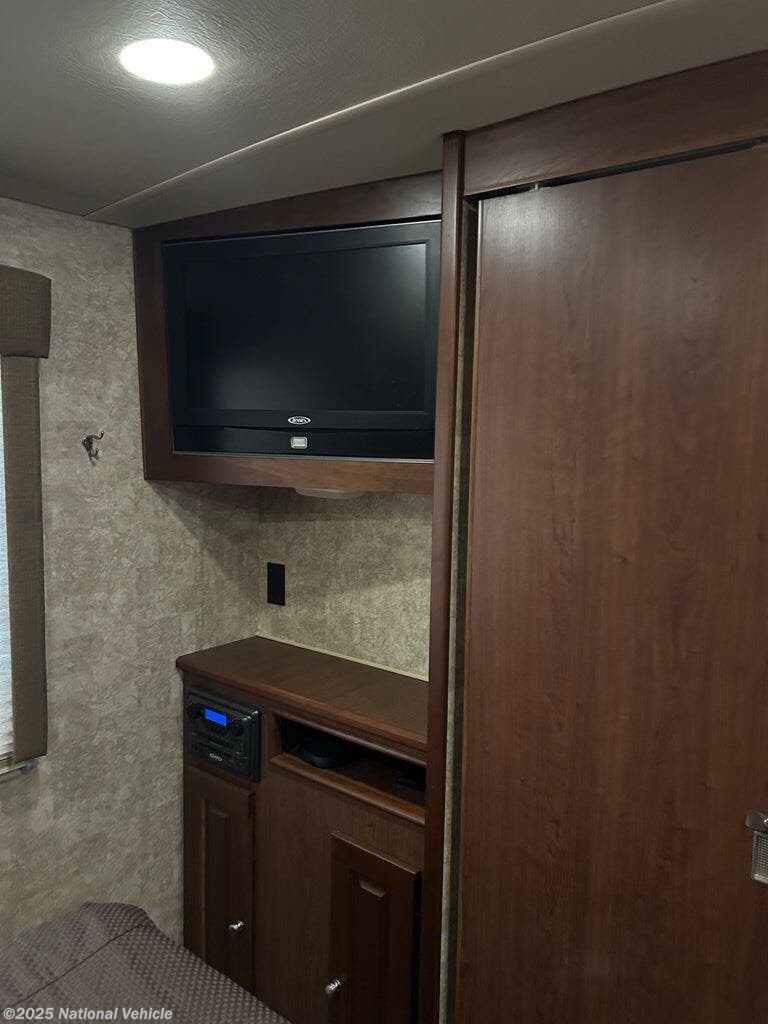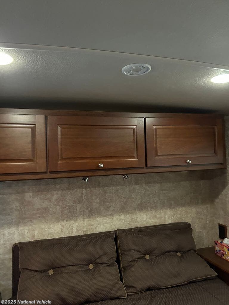 The rear master suite provides a queen-size bed, spacious wardrobe storage, and direct access to the full bathroom with a large shower and quality fixtures. Additional highlights include exterior storage compartments, a power awning, and outdoor entertainment options, providing convenience and fun for all your adventures.