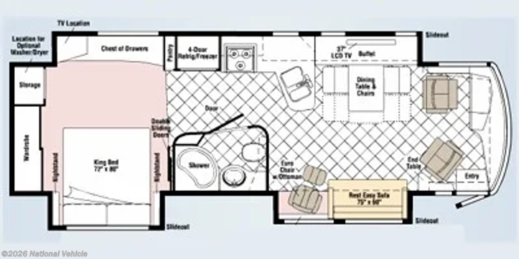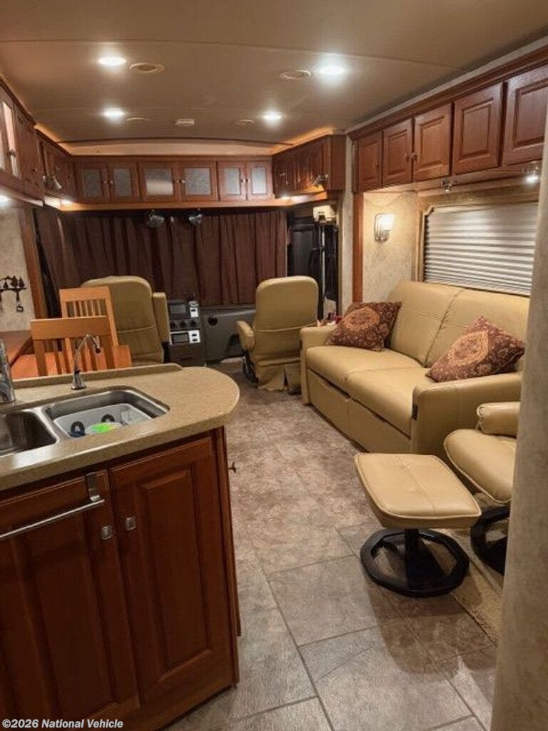 The 34Y floorplan features three slide-outs, including a full wall slide, creating an open and highly livable interior. The layout is designed for comfort and extended stays.