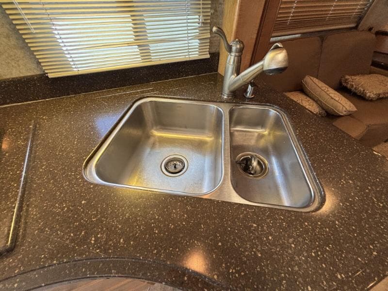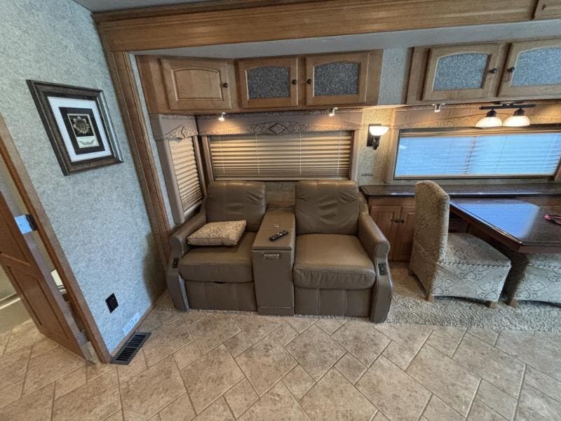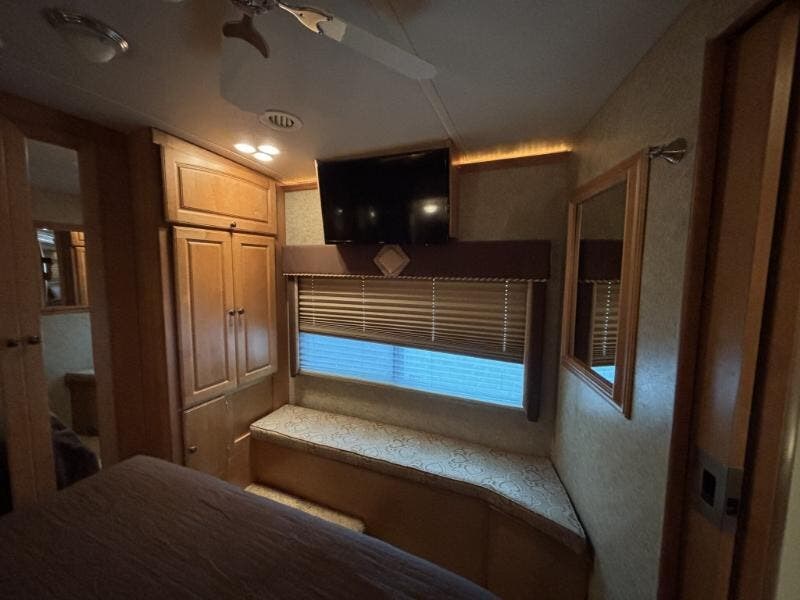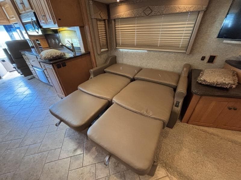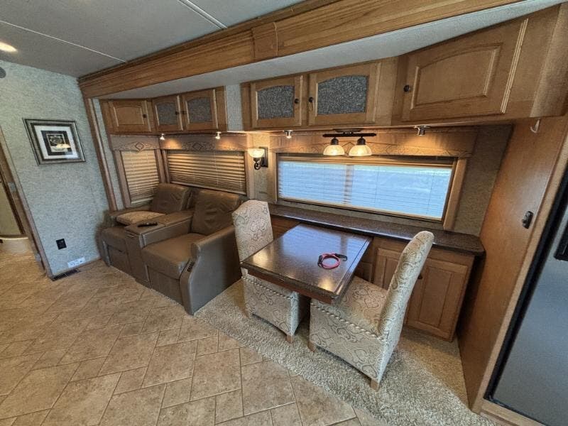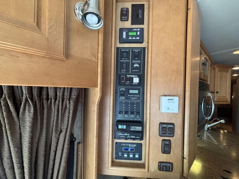 The 2009 Winnebago Vectra 40TD is a luxurious Class A RV designed for those who seek comfort and style on the road. This used vehicle is built on a custom Freightliner Maxum chassis and is powered by a robust Cummins ISL 8.9L Clean-Air Turbo Diesel Engine, delivering an impressive 425 horsepower. The vehicle features a 160-amp alternator and an Allison 3000 MH electronic 6-speed transmission, ensuring a smooth and powerful drive. The ZF-IFS front air suspension and NeWay rear air suspension, along with 4-wheel ABS anti-lock braking and engine compression braking, provide excellent handling and safety. The exterior of the Vectra is adorned with full-body paint and a lower front protective mask, giving it a sleek and polished look. It rides on stylized aluminum wheels with Michelin tires and includes features like an air horn, full-width mud guard, and a 10,000-pound hitch with a 7-pin plug. The HWH hydraulic leveling jacks make setting up camp a breeze. Inside the cab, you'll find a range of features designed for comfort and convenience: - Power sunvisors - 6-way power pedestal driver seat with adjustable lumbar support - Seats that slide, swivel, and recline - Passenger footrest - Auxiliary start switch - Defroster fans - Rearview monitor with 1-way audio - AM/FM/CD weather radio with remotes - Tilt/telescoping SmartWheel - Touchpad shifter - Cruise control - Wrap-around curtain The living spaces are designed to feel like home, with a 7-foot 2-inch high ceiling, carpeted and ceramic tile floors, and dual-glazed windows with day/night pleated shades. The entertainment center includes an UltraLeather RestEasy lounge, overhead cabinets, and full-extension drawer guides. Dining in the Vectra is a pleasure with options for a table and chairs or a booth dinette, a pantry, galley mini blinds, Corian solid surface countertops, and a designer backsplash. The kitchen is equipped with a stainless steel sink with Corian covers, stainless steel appliances, a 4-door refrigerator with an icemaker, a recessed cooktop with a Corian cover, and a vented convection microwave. For entertainment, the RV is cable TV and satellite ready, with an amplified TV antenna, LCD TV, CD/DVD receiver, and a home theater sound system with five speakers and a subwoofer. An exterior entertainment center is also included. Sleeping accommodations are comfortable and well-appointed, featuring: - Overbed storage - Reading lights - Ideal Rest memory foam mattress - Bedspread and pillows - Nightstands - 26-inch LCD TV - AM/FM/CD/DVD alarm clock stereo - Cedar-lined hamper - Drawers and wardrobe - Ceiling fan - Washer/dryer prep The bathroom is equipped with a medicine cabinet, vanity with Corian countertop, linen storage, a curved glass shower door, shower surround with built-in seat, Moen-Posi-Temp control, and a flexible showerhead. A power roof vent ensures proper ventilation. Mechanically, the Vectra is outfitted with a 30-gallon LP tank, four deep-cycle Group 31 house batteries, a battery disconnect switch, a 10-watt solar panel battery charger, and a 50-amp service with a power cord reel. It also includes an 8.0 Onan Quiet Diesel Generator with an automatic changeover switch, a PowerLine energy management system, a 2000-watt converter/inverter/charger, and a ground fault interrupter. The TrueAir residential AC heat pump system, primary and secondary furnaces, and a 10-gallon hot water heater ensure comfort in any climate. The coach is built with an aluminum framework, thermo-panel sidewalls, high-density block-foam insulation, a high-gloss fiberglass exterior, and a seamless crowned fiberglass roof. High-mount brake lights and pass-through storage with storage containers add to the practicality and safety of this impressive RV. ???