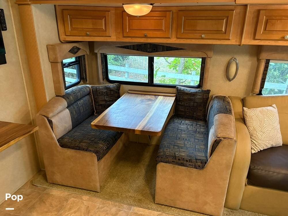 The living area has a fabric sleeper sofa and booth dinette, turning into a spot for meals or downtime after a day of exploring.