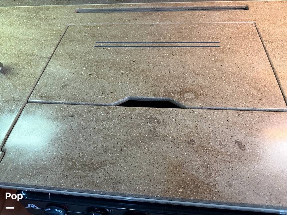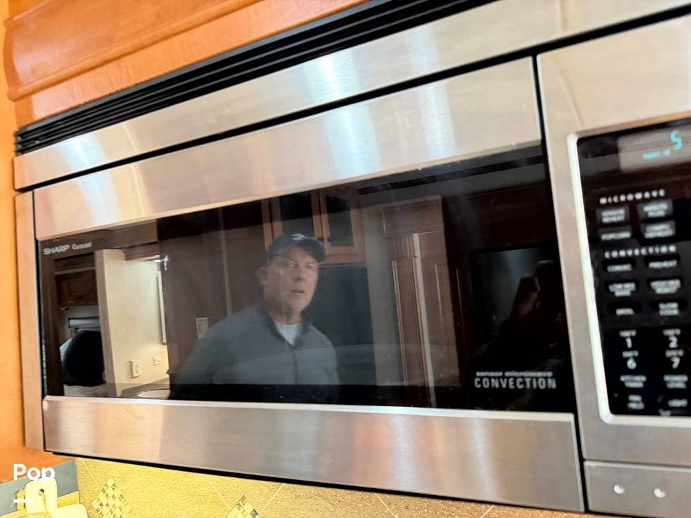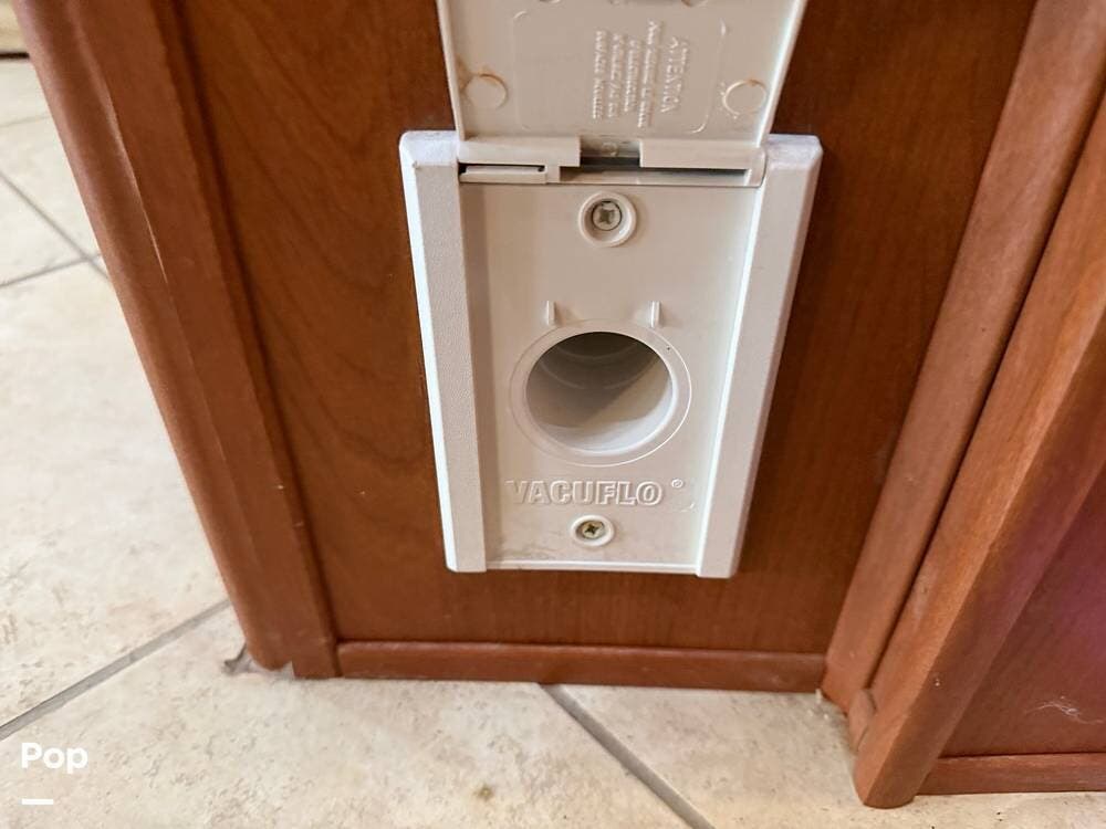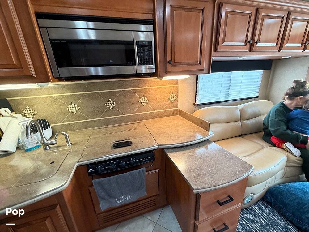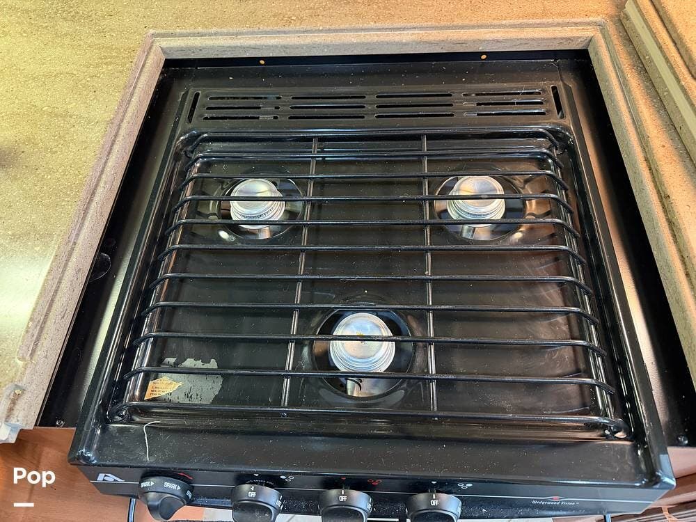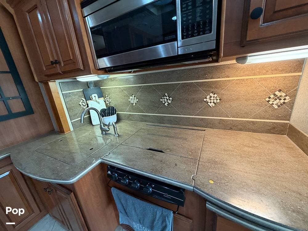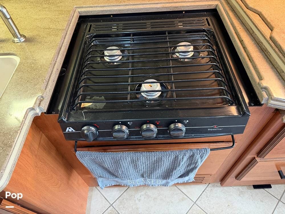 The galley is equipped with a convection microwave, a 3-burner gas cooktop, and a central vacuum system to make life on the road as easy as home.