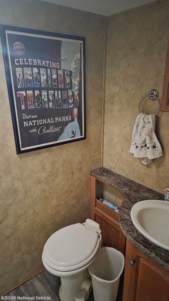 The private bedroom offers a comfortable retreat with a queen size bed, wardrobe storage, and overhead cabinets, while the full bathroom with shower, vanity, and toilet brings everyday convenience on the road.