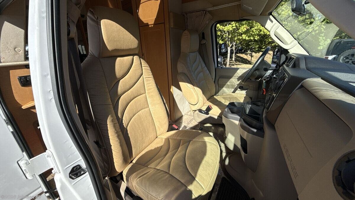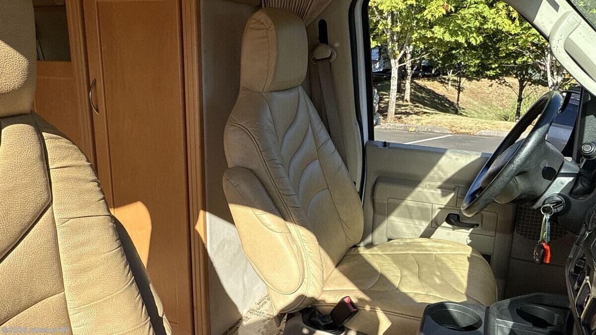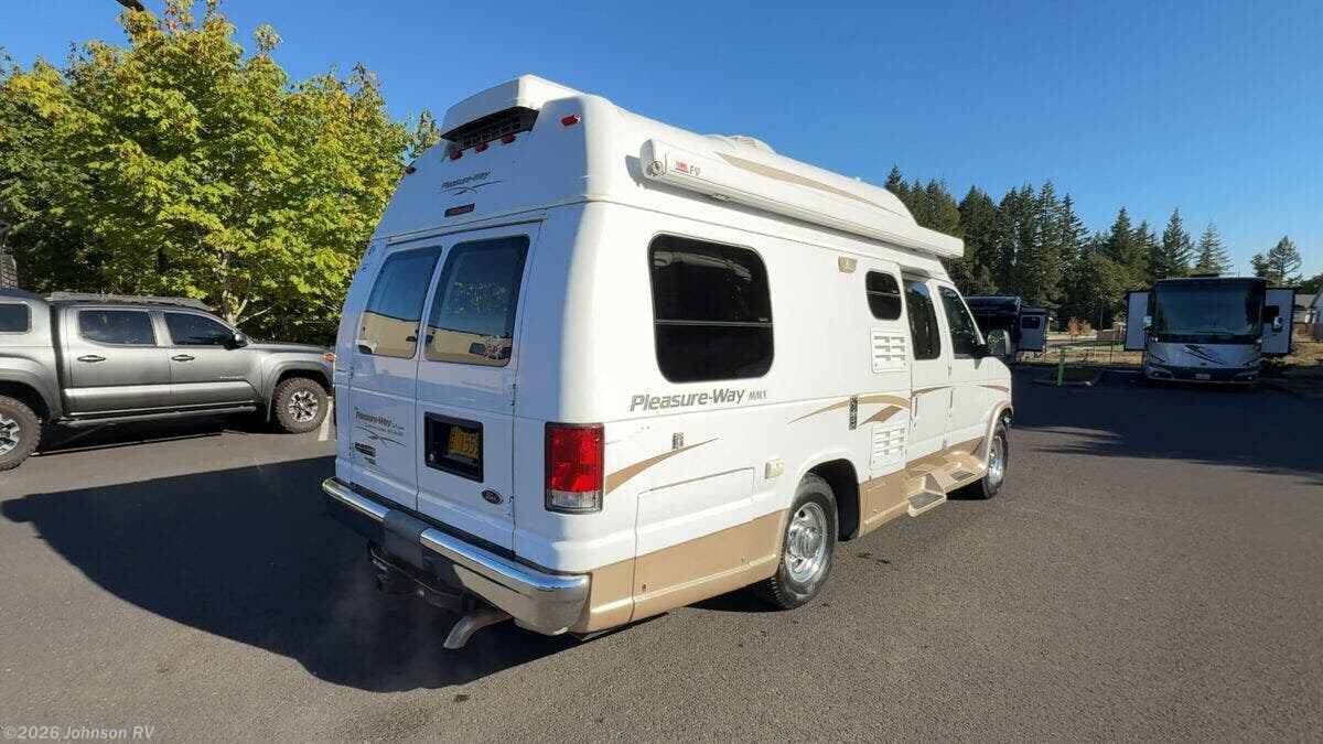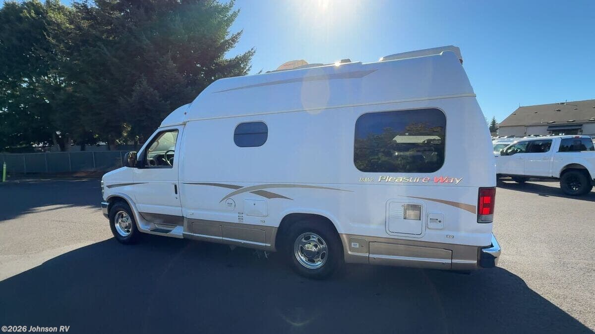 The 2010 Pleasure-Way Excel TS is a versatile and compact Class B RV, perfect for those seeking adventure on the open road. Built on a sturdy Ford E350 chassis with a 138-inch wheelbase, this vehicle combines the reliability of a Triton 5.4L V8 gas engine with 255 horsepower and 350 ft-lb of torque. The 4-speed automatic transmission ensures smooth driving, while the Ride Rite Air Helper Springs and RCS Roll Stability Control provide enhanced stability and comfort. Safety and convenience are prioritized with features such as 4-wheel ABS disc brakes, a tire pressure monitoring system, and a 3500-pound tow capacity. The aluminum wheels and steel wheel spare tire add to the vehicle's durability, while the LT 245/75/R16 all-season tires ensure a reliable grip on various terrains. Cab features include: - Remote keyless entry - Power door locks and windows - Power side-mirrors - Swivel cab seats - Cab air conditioning - Cruise control - Driver and passenger airbags The living space inside the Pleasure-Way Excel TS is designed for comfort and functionality. An 11-foot Fiamma awning provides shade and shelter outside, while LED interior lights create a warm ambiance. The built-in TV cabinet and power rear sofa, upholstered in ultra-leather fabric, offer relaxation and entertainment options. The maple cabinetry adds a touch of elegance to the interior. Dining amenities include: - Corian countertops with a flip-up counter extension - Stainless steel sink - 3-way 3.8 cubic foot Dometic refrigerator - 2-burner cooktop - Microwave oven For electronics, the RV is equipped with a systems center, LP CO and smoke detectors, cable TV hookup, Winegard directional TV antenna, and an antenna signal booster. Sleeping arrangements are made comfortable with a power rear sofa that converts into a bed with memory foam cushions, ensuring a restful night's sleep. The bathroom is well-appointed with: - A medicine cabinet - Vanity stainless steel sink - Linen storage - Shower - Thetford porcelain toilet Mechanical features include a slide-out coach battery, 8-gallon LP tank, 45-amp converter, Charge Wizard, generator prep, 11k Penguin roof AC, 16k furnace, 6-gallon hot water heater, and a water heater bypass. An outdoor shower adds to the convenience for those who enjoy outdoor activities. The coach build features pass-through rear storage and rear loose lay carpet, providing ample space for storing gear and personal items. Overall, the 2010 Pleasure-Way Excel TS is a well-equipped and comfortable RV, ideal for both short getaways and extended road trips. With its combination of practicality and luxury, it offers a delightful travel experience for adventurers and explorers alike. ???