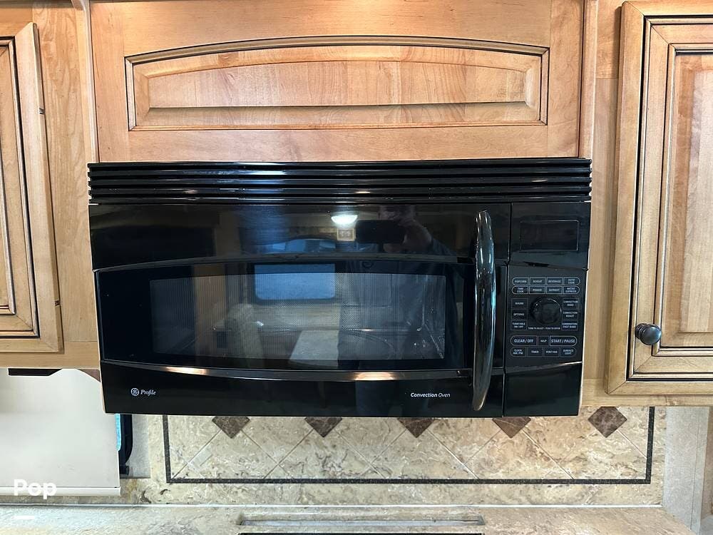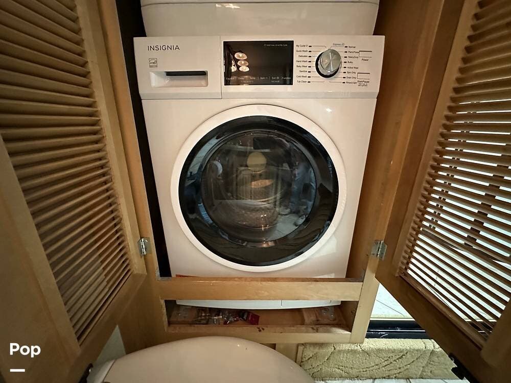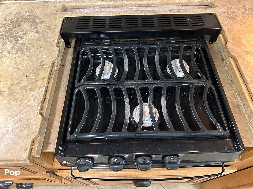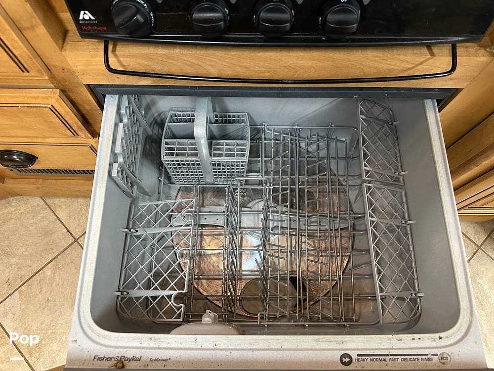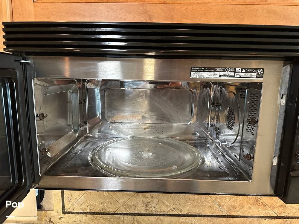 The kitchen is fully equipped with solid surface countertops, stainless steel appliances, and ample storage, making meal prep on the road a pleasure.