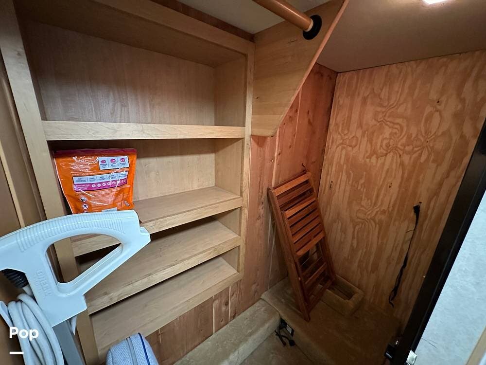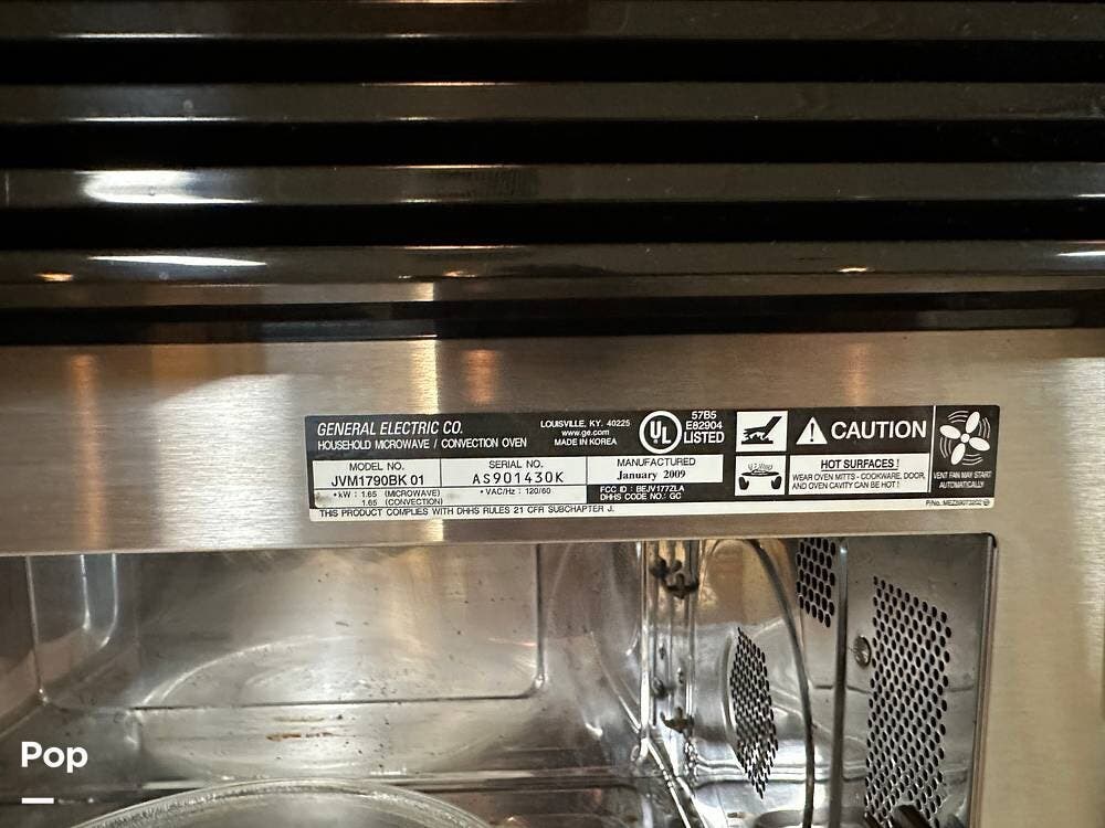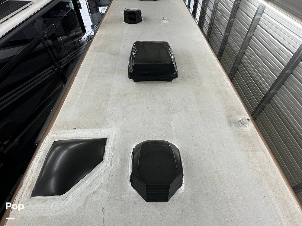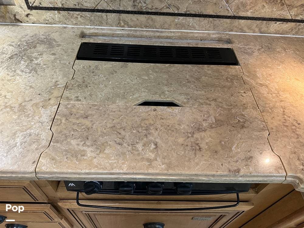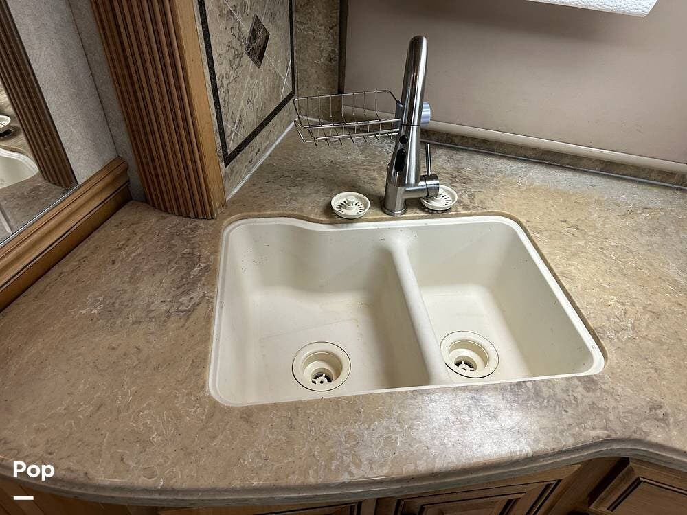 The kitchen is fully equipped with solid surface countertops, stainless steel appliances, and ample storage, making meal prep on the road a pleasure.