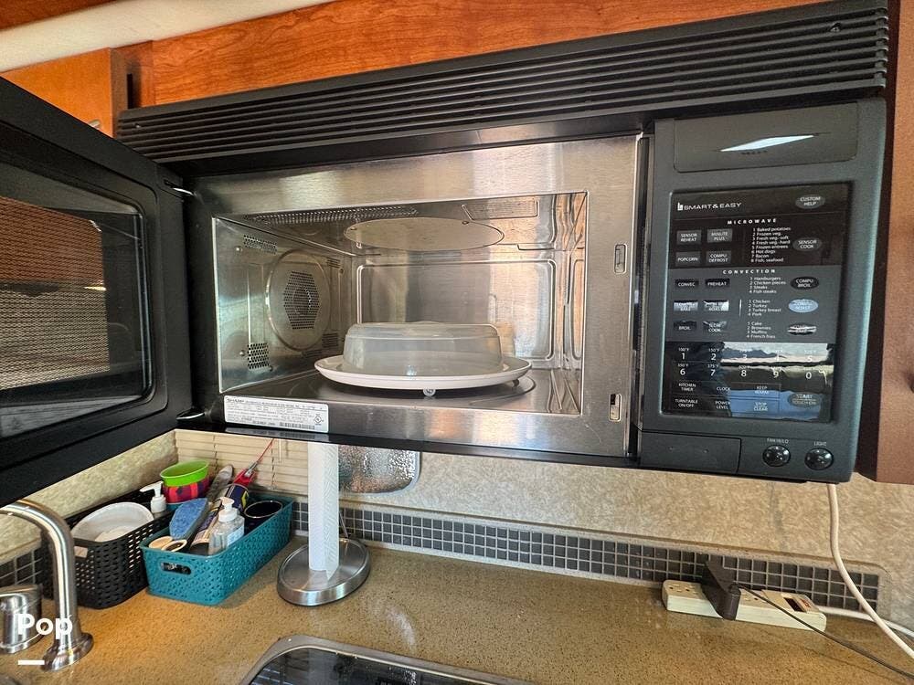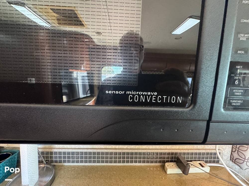The galley/kitchen is mid‑coach, just past the driver's cockpit. It includes a convection/microwave oven combo, a two-burner cooktop, and an 8 cu ft double‑door refrigerator.