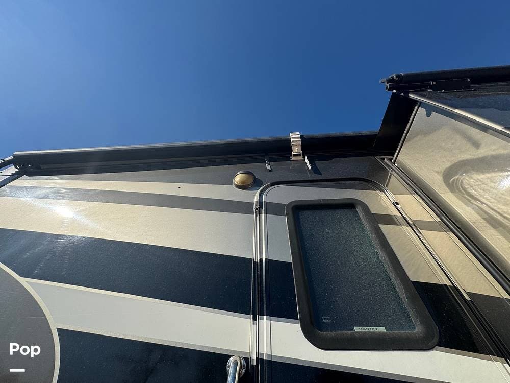 Exterior amenities include hydraulic leveling jacks, an awning, a roof ladder, a backup camera, and tinted windows.