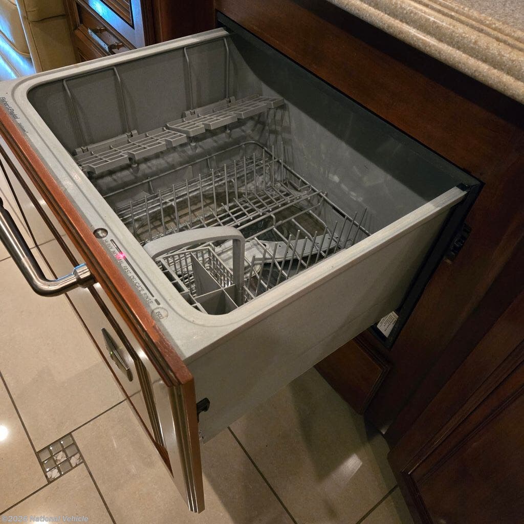 Inside, you?ll find a beautifully appointed interior with Corian countertops, real wood cabinetry, a residential refrigerator with ice maker, propane cooktop, convection microwave, dishwasher, central vacuum, and a stacked washer/dryer. The living area features a sofa bed, dual recliners, and a table with chairs, while the bedroom offers a queen bed and ample storage.