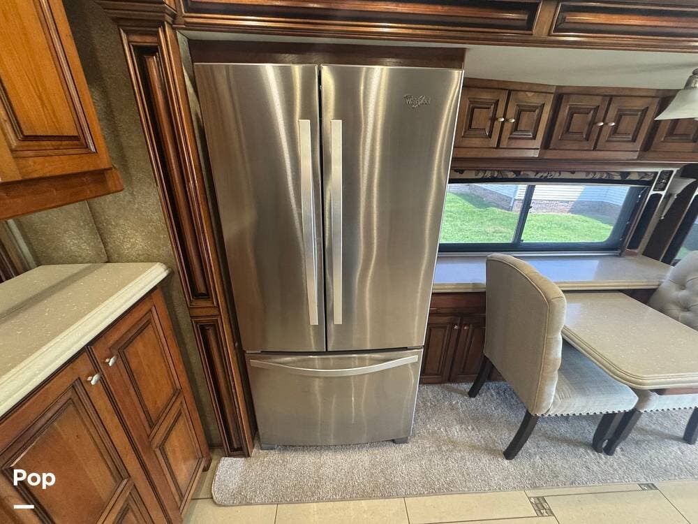 This Tiffin Allegro Bus has a full-size refrigerator and freezer, a queen-size bed, a leather sofa, and a dinette with chairs.