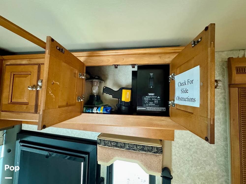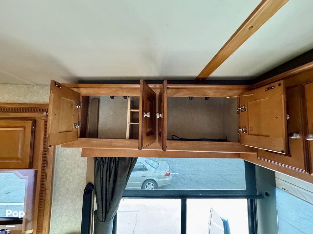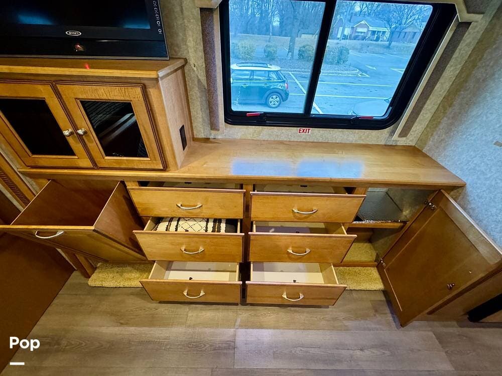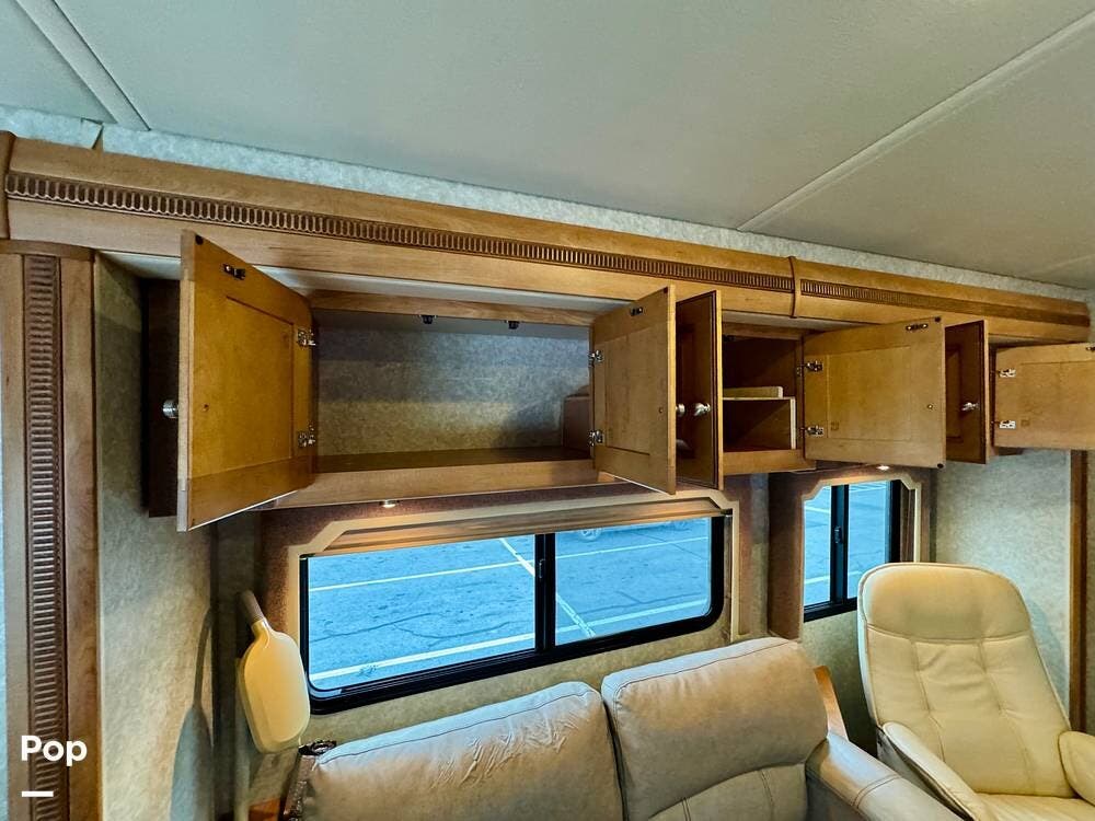 Inside, the main living area opens up nicely thanks to the slide-outs that expand the coach and create a spacious feel once parked. The seating area provides a comfortable place to relax after a day of travel, and large windows allow natural light into the space while giving passengers a great view of the surroundings. Overhead cabinetry and built-in storage throughout the coach help keep belongings organized for life on the road.