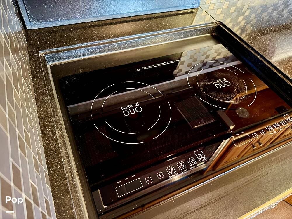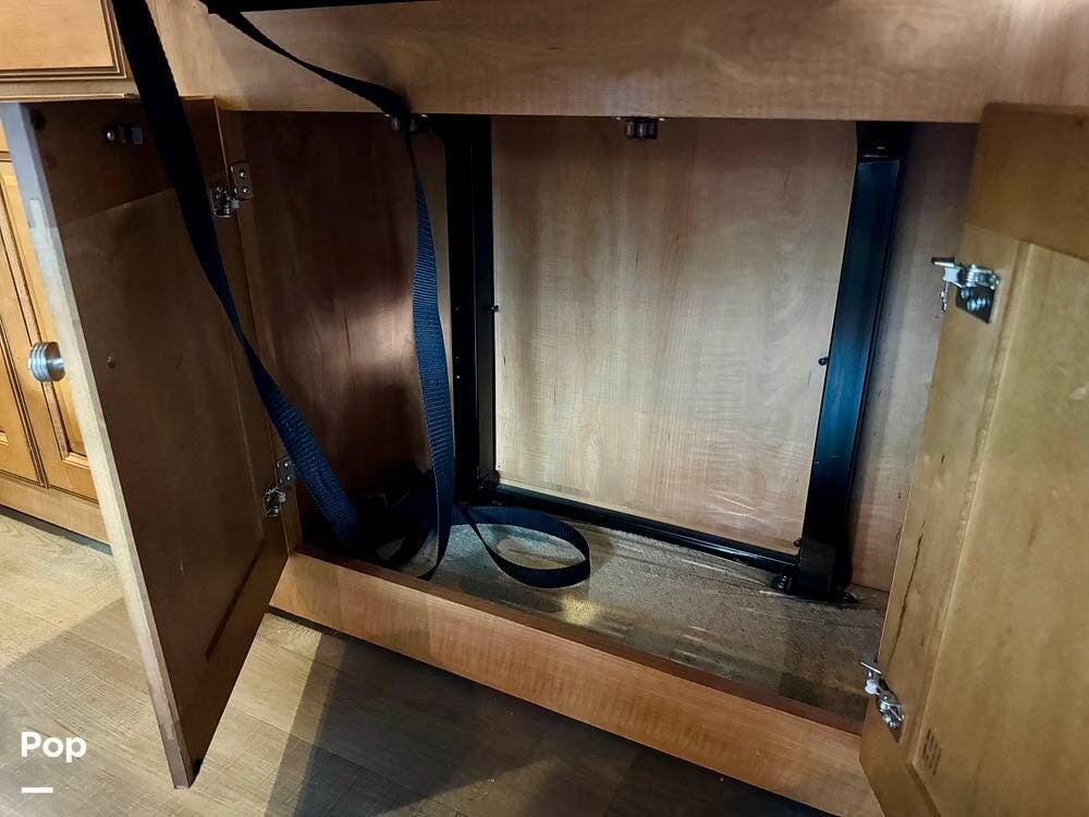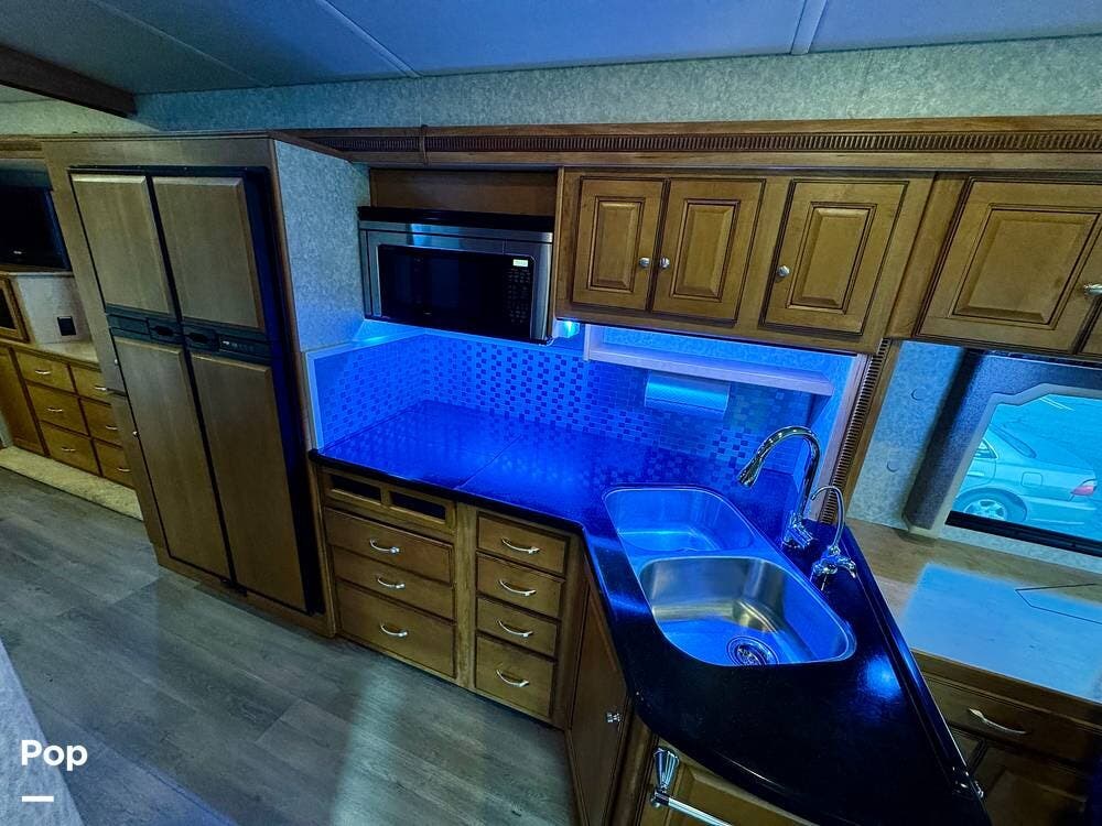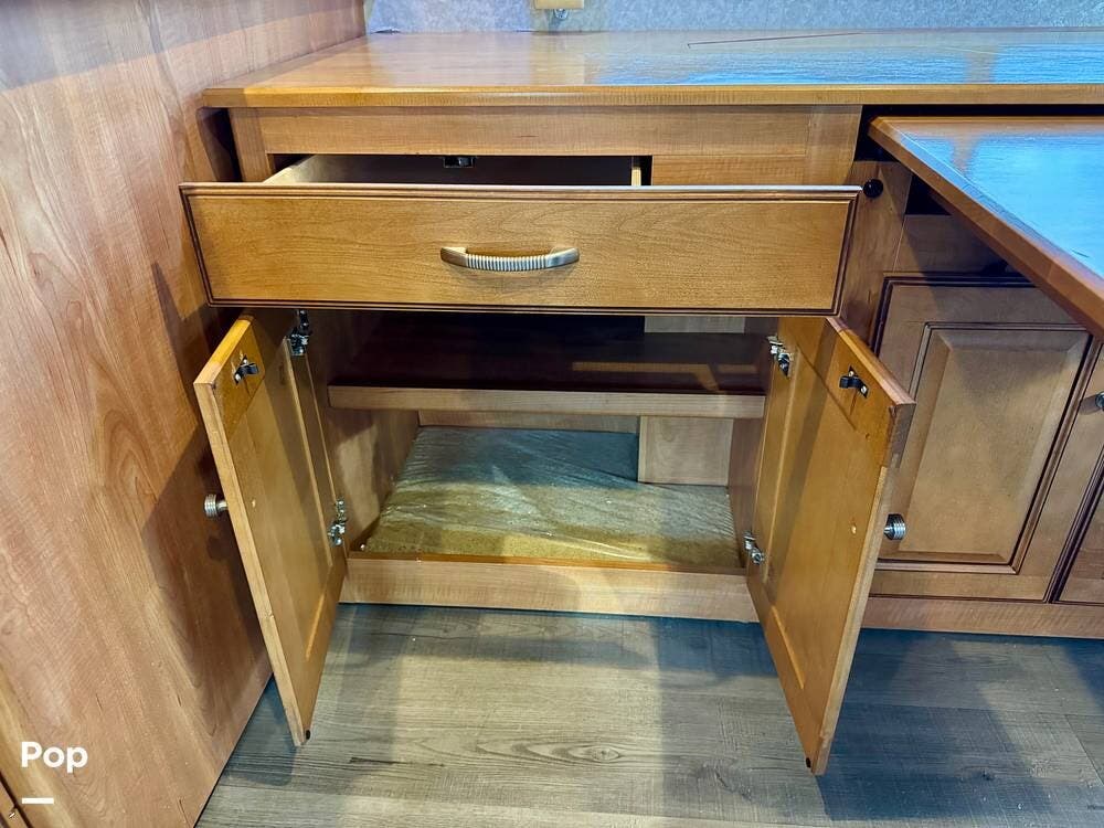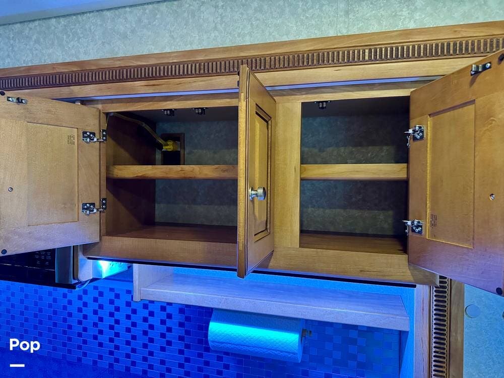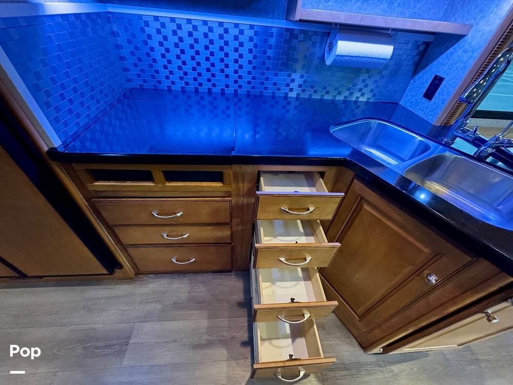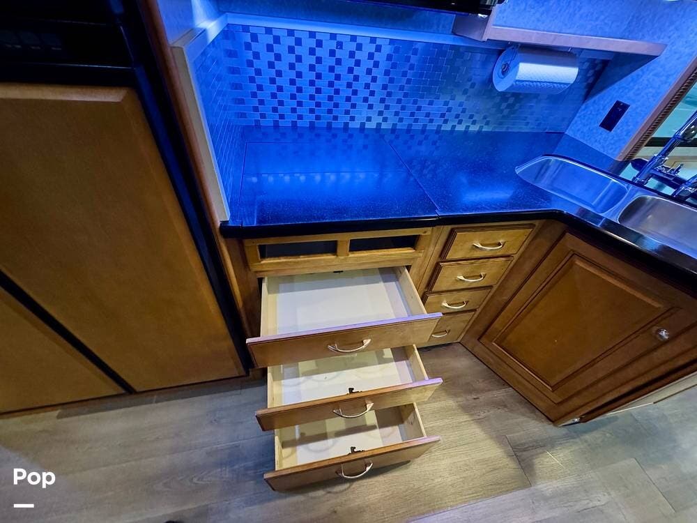 The galley kitchen is arranged to make meal preparation convenient while traveling. It offers generous counter space, cabinet storage, and the appliances needed to prepare meals comfortably inside the coach. The layout keeps everything within easy reach and makes it simple to cook while still remaining part of the living area conversation.