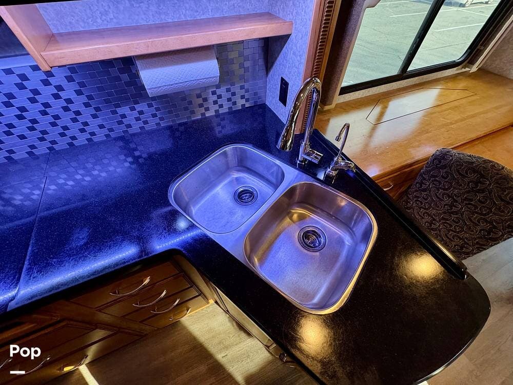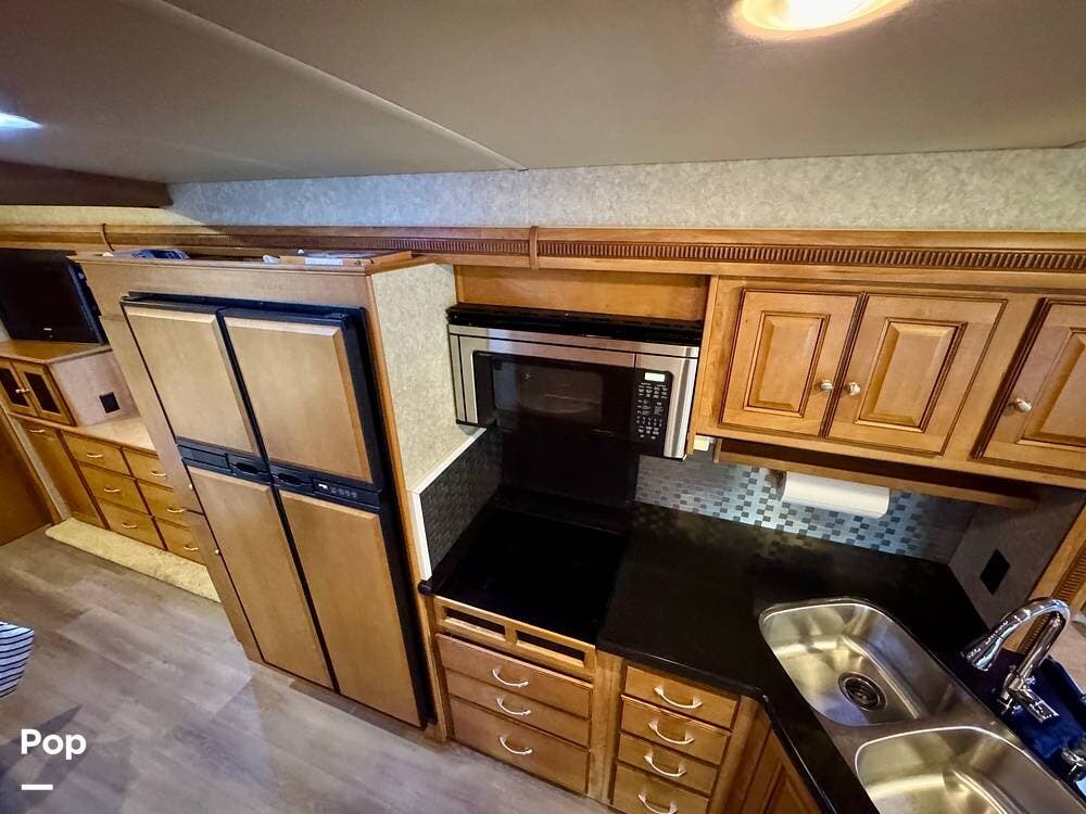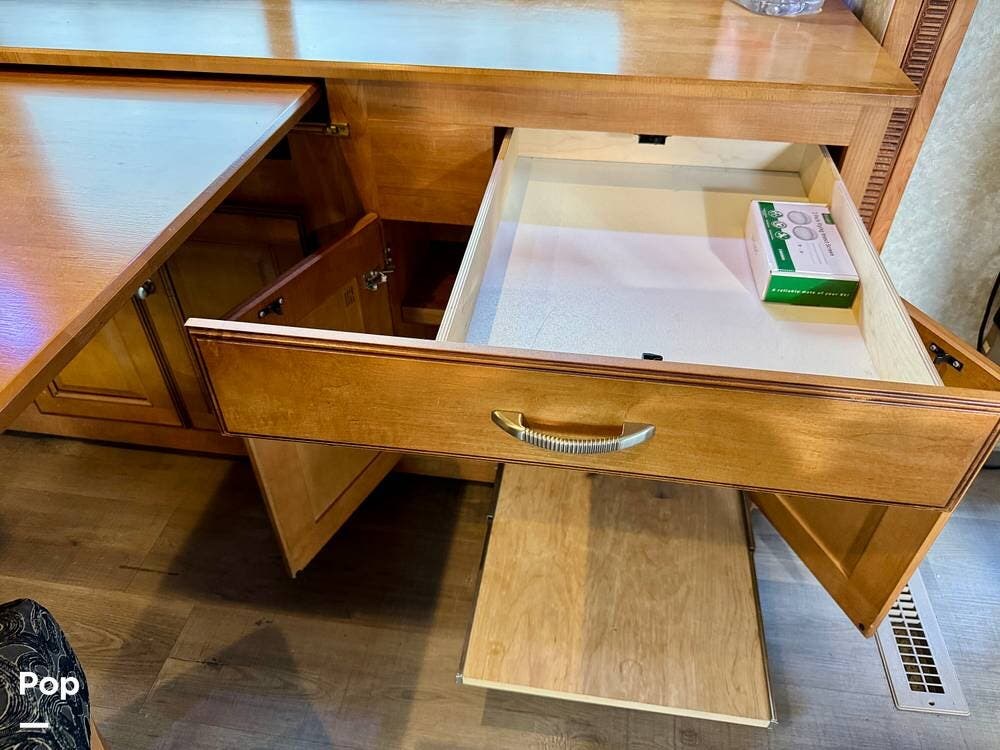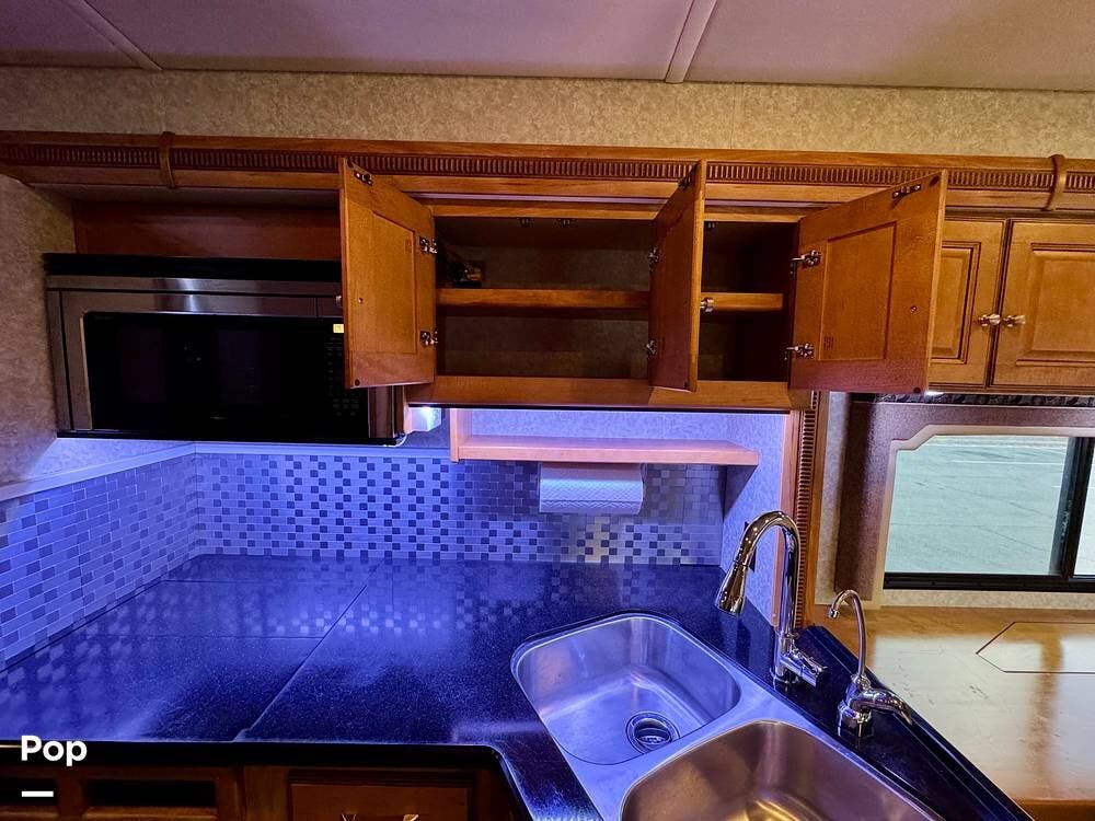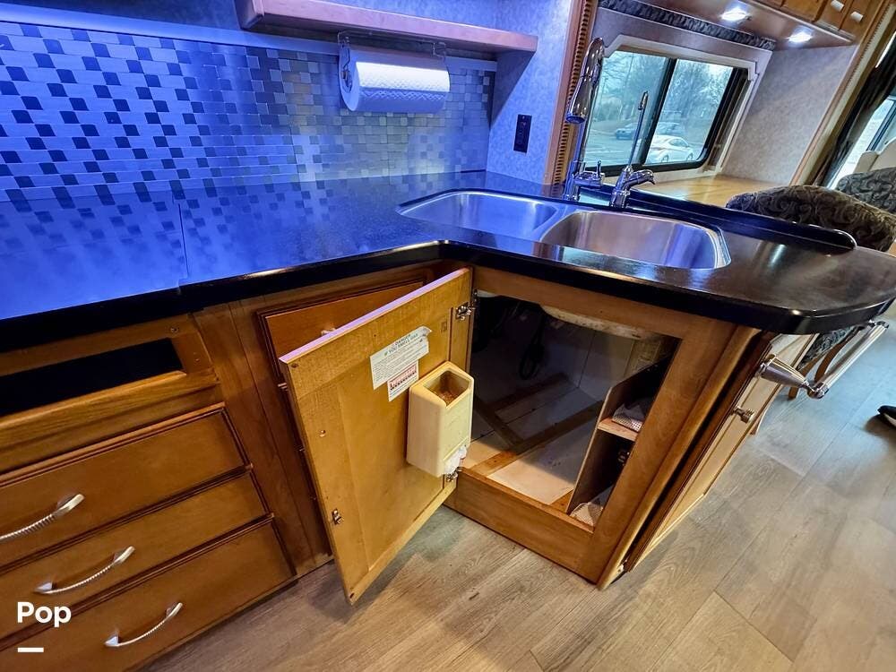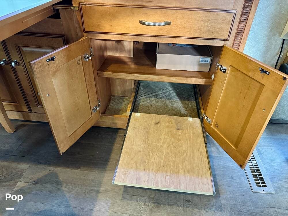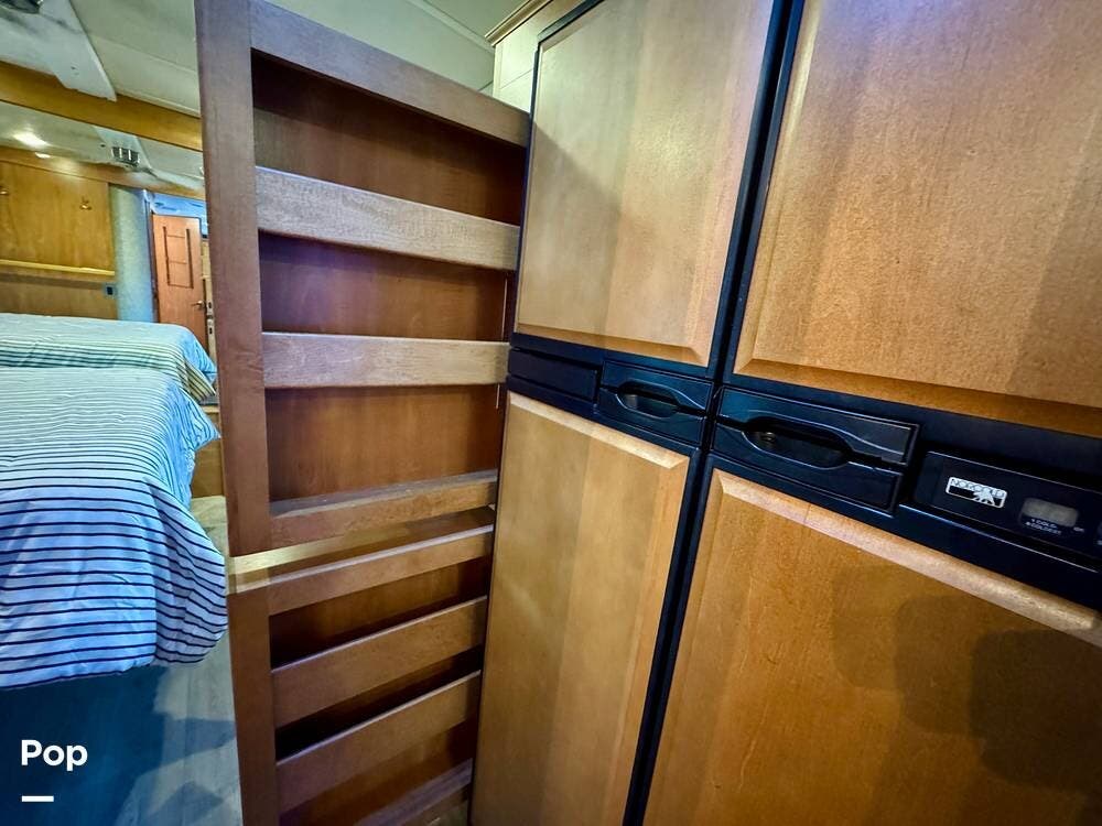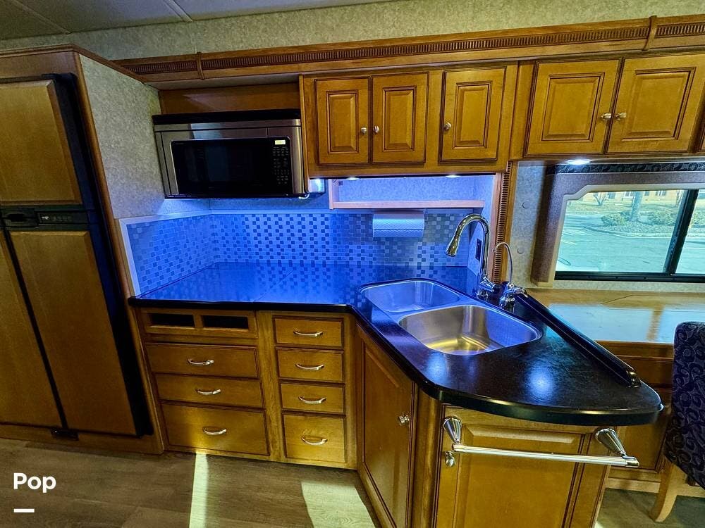 The galley kitchen is arranged to make meal preparation convenient while traveling. It offers generous counter space, cabinet storage, and the appliances needed to prepare meals comfortably inside the coach. The layout keeps everything within easy reach and makes it simple to cook while still remaining part of the living area conversation.