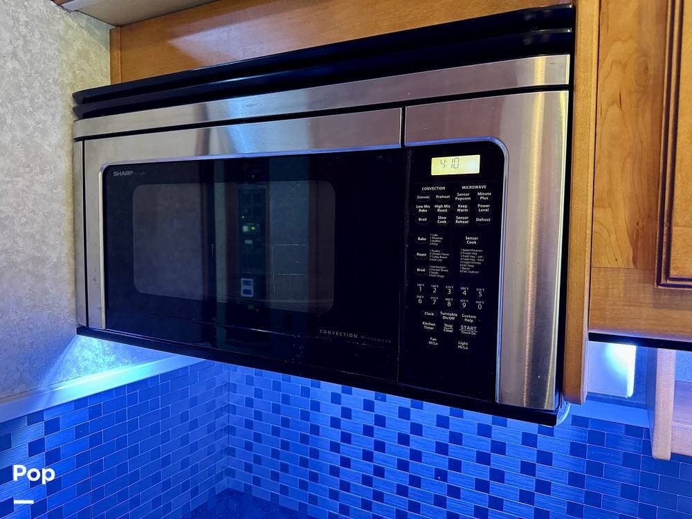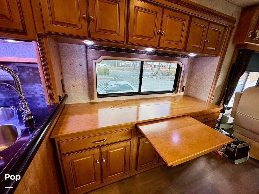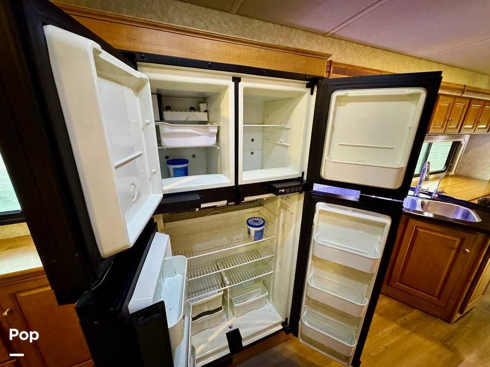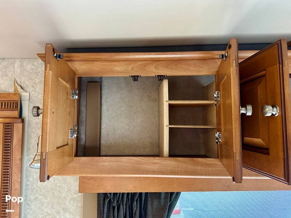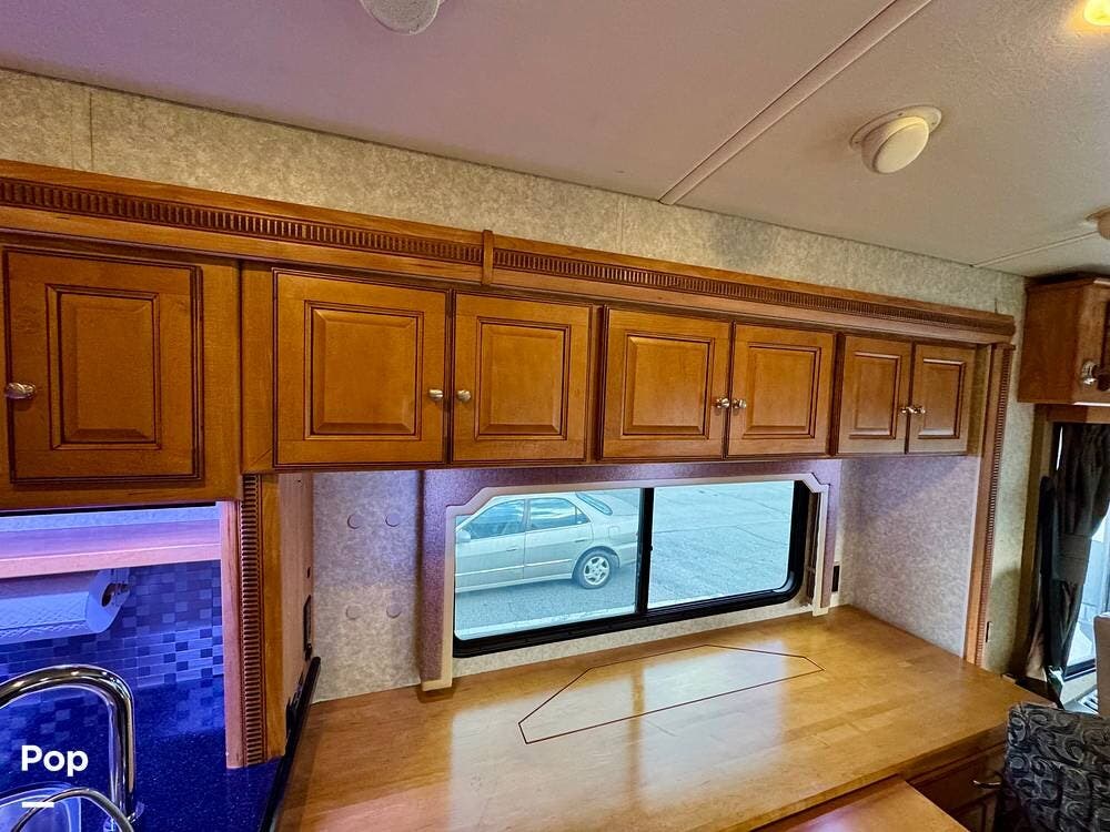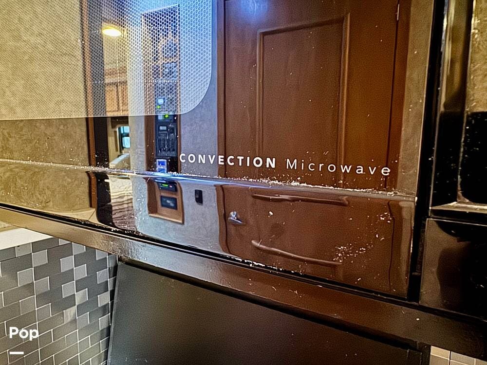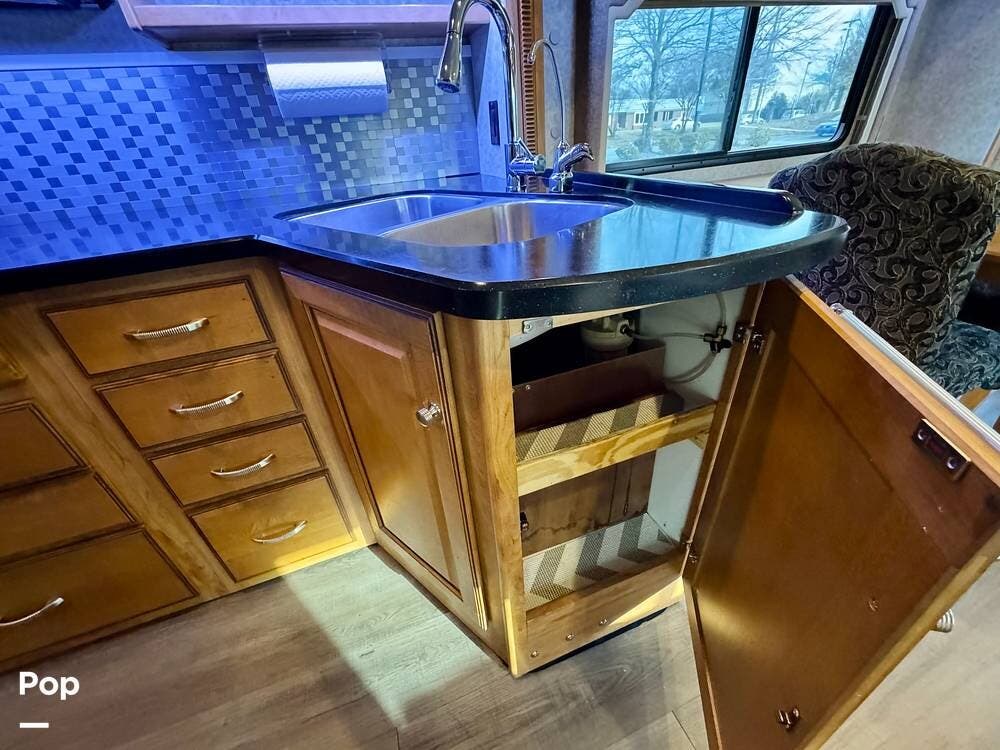 The galley kitchen is arranged to make meal preparation convenient while traveling. It offers generous counter space, cabinet storage, and the appliances needed to prepare meals comfortably inside the coach. The layout keeps everything within easy reach and makes it simple to cook while still remaining part of the living area conversation.