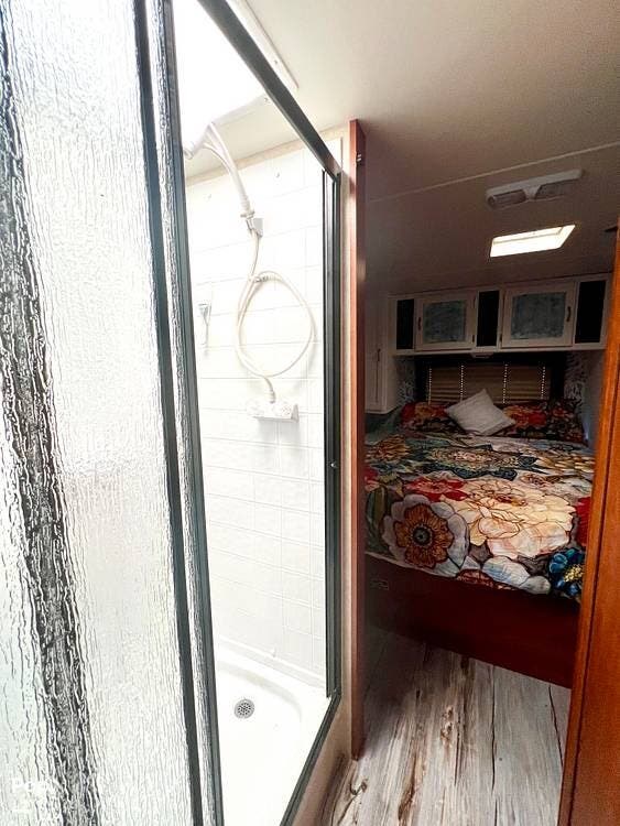 The spacious full-size bathroom is conveniently located at the center of the unit, featuring a split shower and separate bathroom access. Behind it, you'll find a queen-size bed with easy access to both sides and ample storage space.