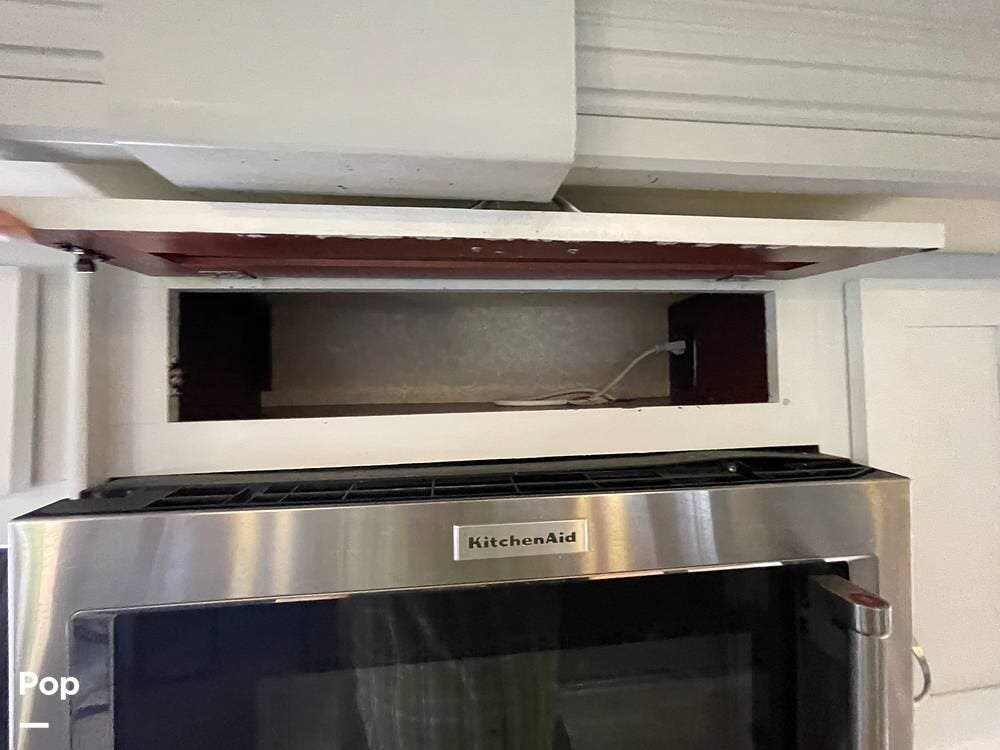 The kitchen is equipped with solid surface countertops, a microwave, a three-burner cooktop, and a residential-style refrigerator, suitable for extended stays or travel.