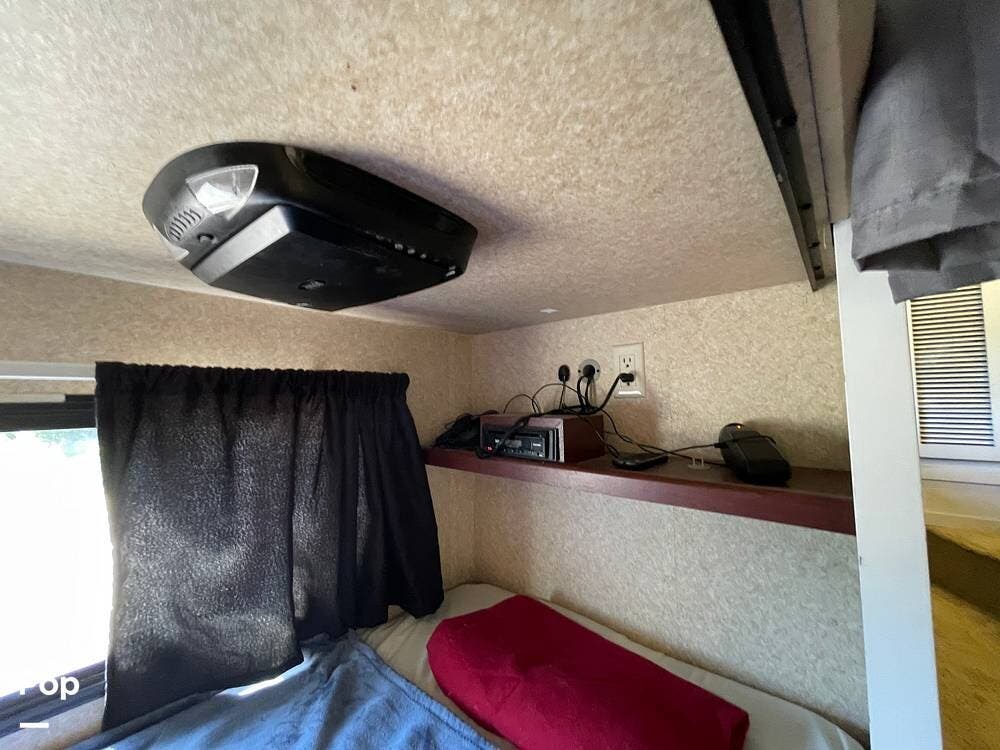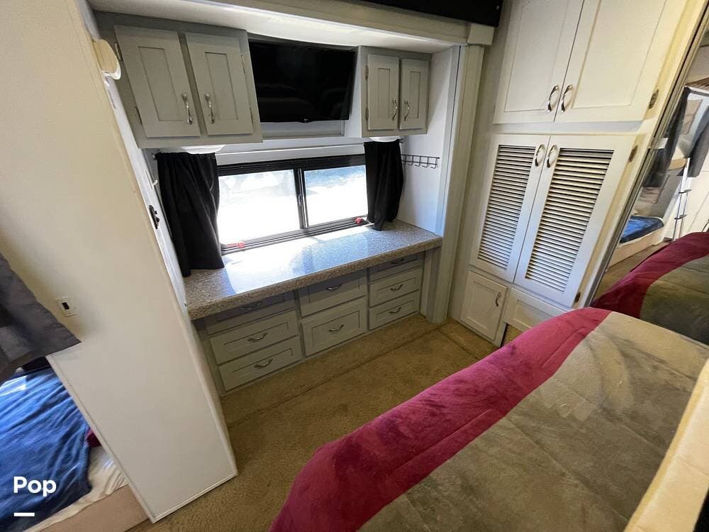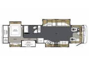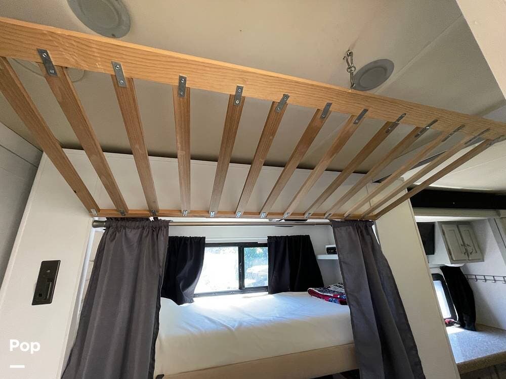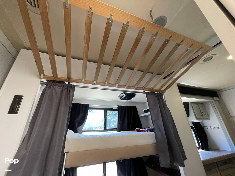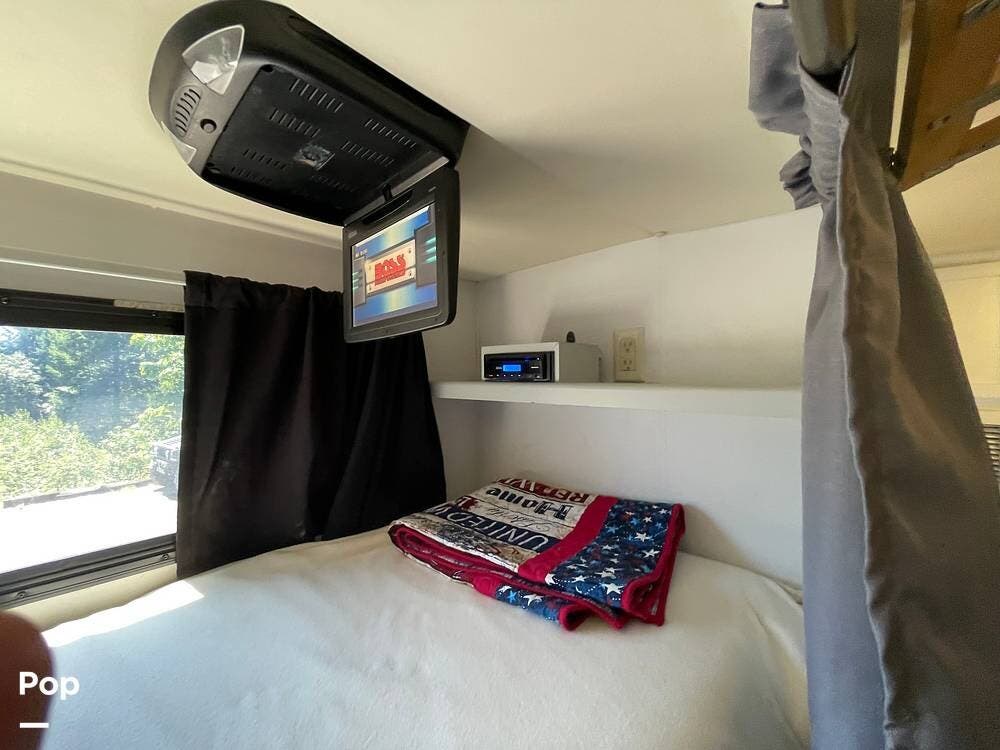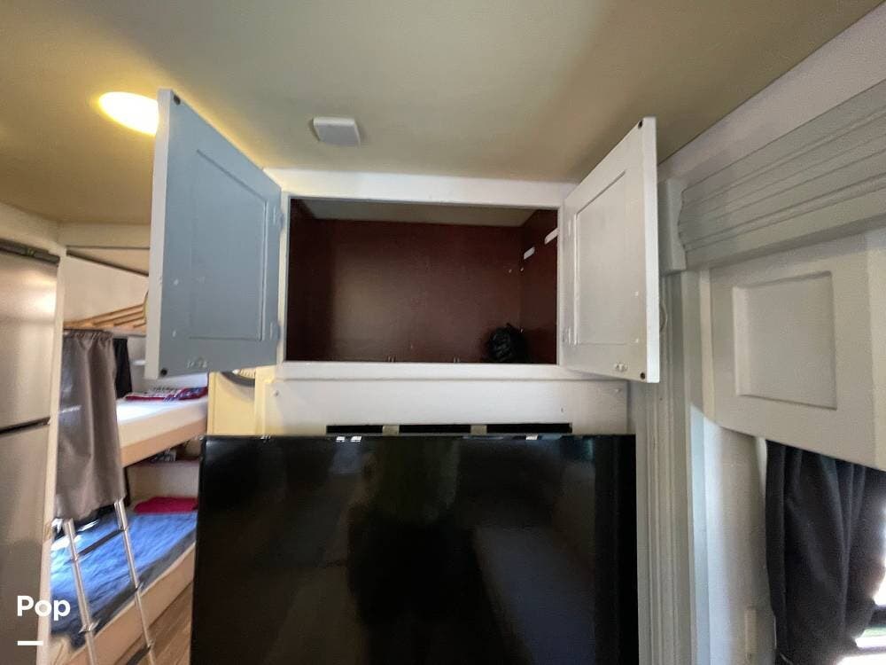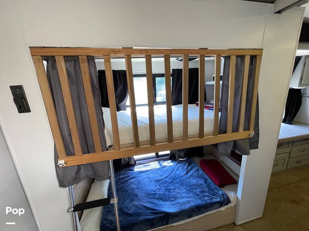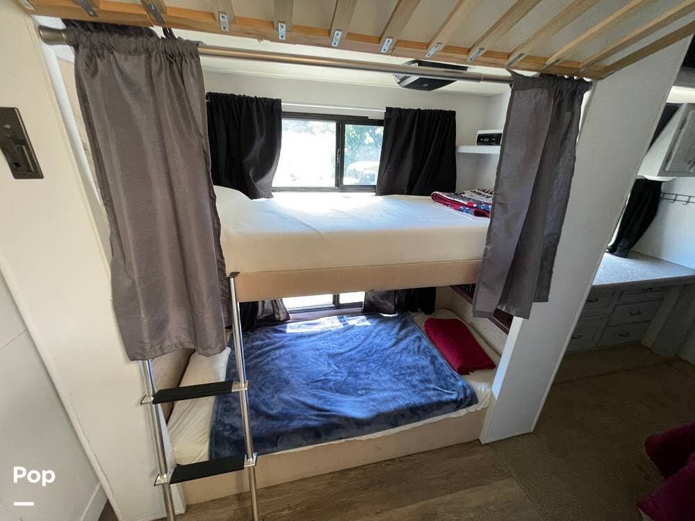 Inside, you'll find a layout designed with both comfort and practicality in mind. The bunkhouse configuration provides sleeping options for families or groups, and the living area includes a sofa, a dinette, and a television for entertainment.