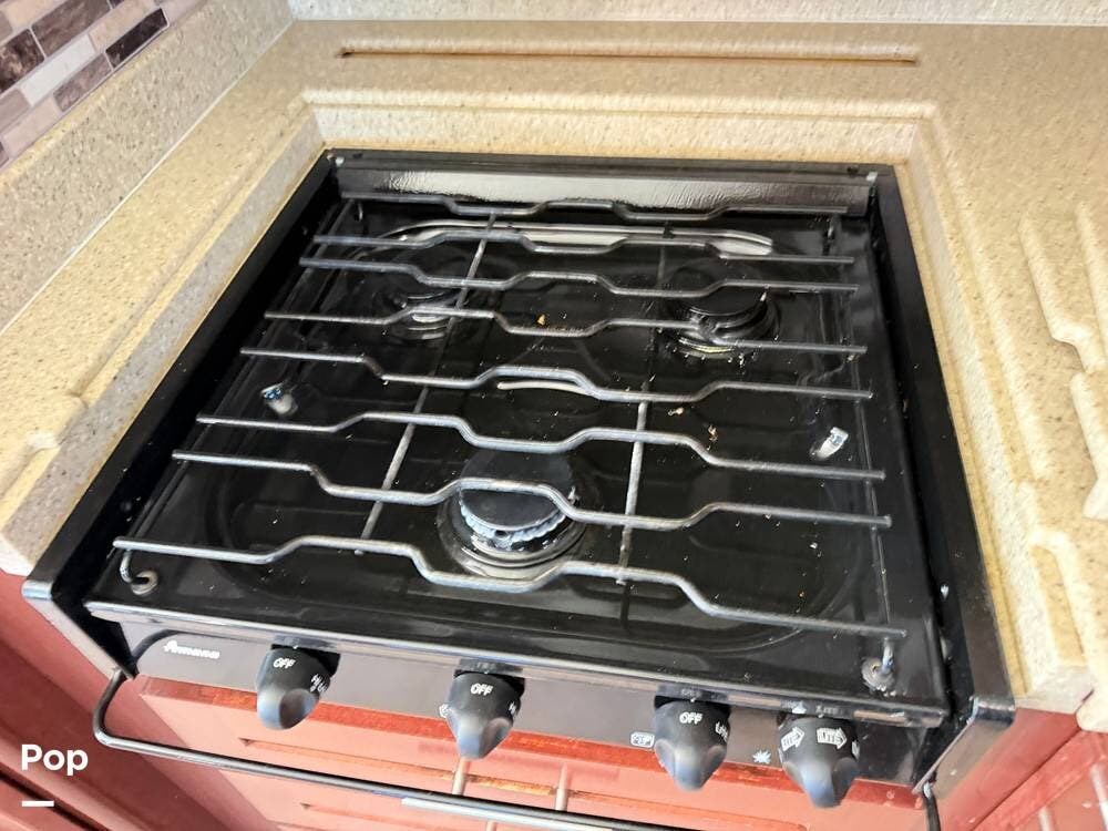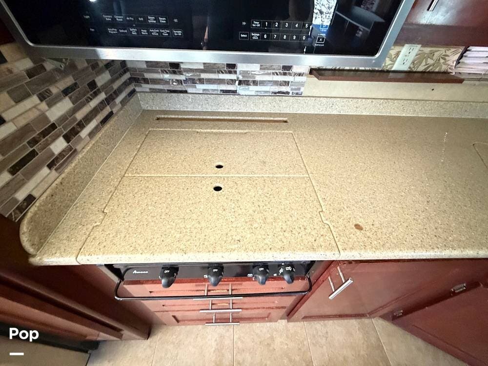 The kitchen is fully equipped for life on the road, featuring generous counter space, modern appliances, and ample storage.