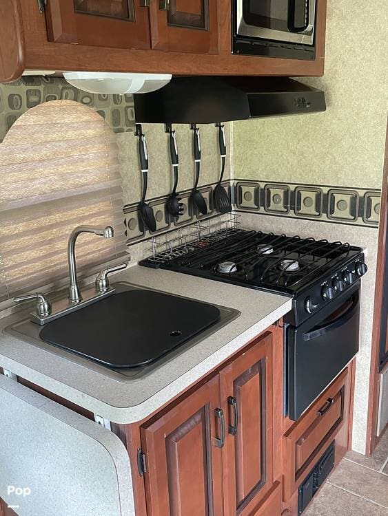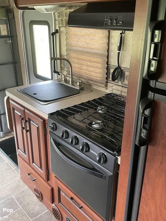 Inside, this unit features a cozy rear bedroom for privacy, a slide-out that opens up the living space, and a kitchen with a three-burner stove, oven, microwave, and refrigerator so you can cook up your favorite meals on the road.