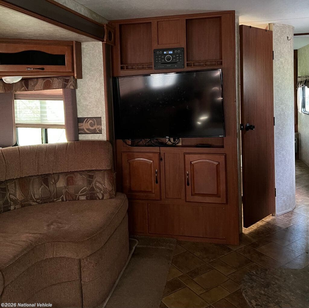 With a spacious layout and multiple slide-outs, this unit opens up to create a bright, inviting living area perfect for family trips or entertaining. The interior features comfortable seating, a dinette, and plenty of storage, giving it a welcoming, residential feel.