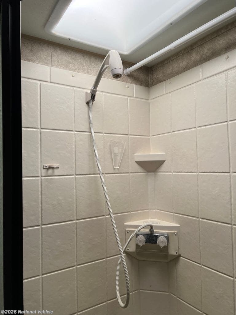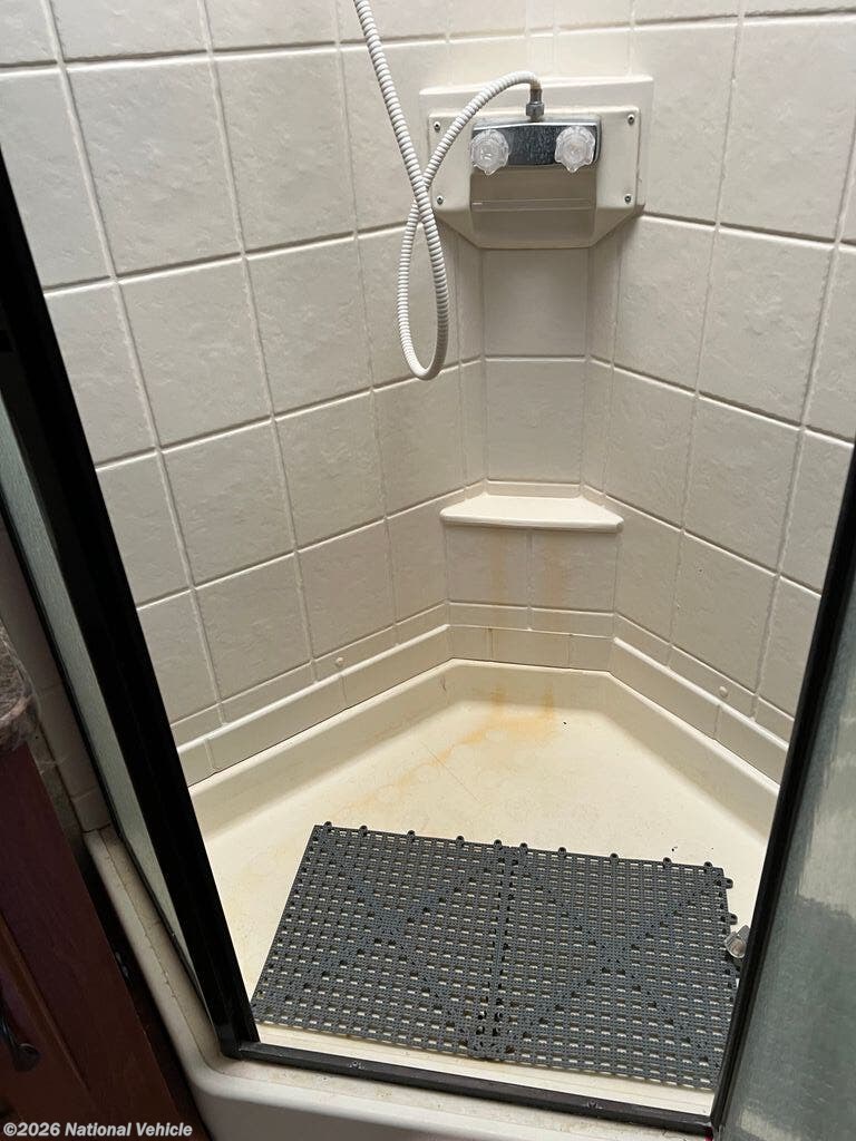 The kitchen is fully equipped with a stove, oven, microwave, and refrigerator, along with ample counter space for meal prep. Toward the front, the private bedroom offers a walk-around bed and wardrobe storage, while the bathroom provides a convenient layout with a shower and all the essentials.