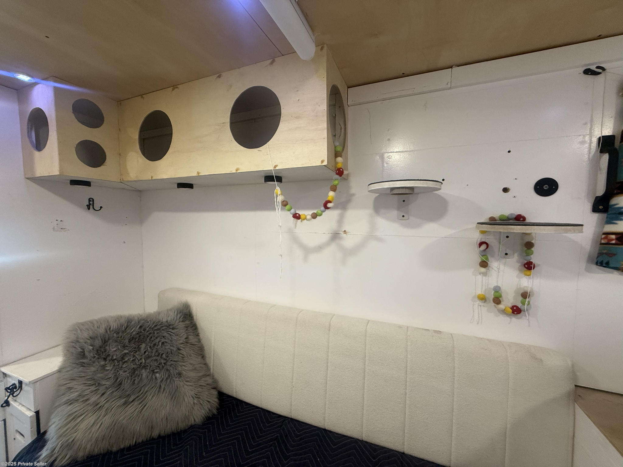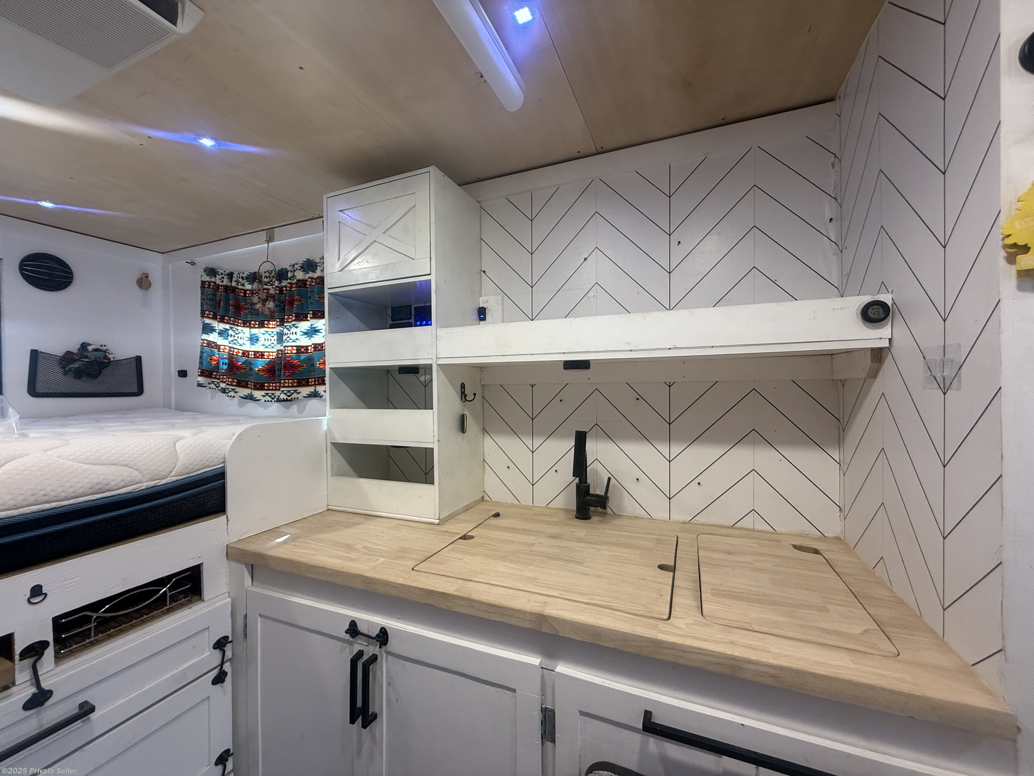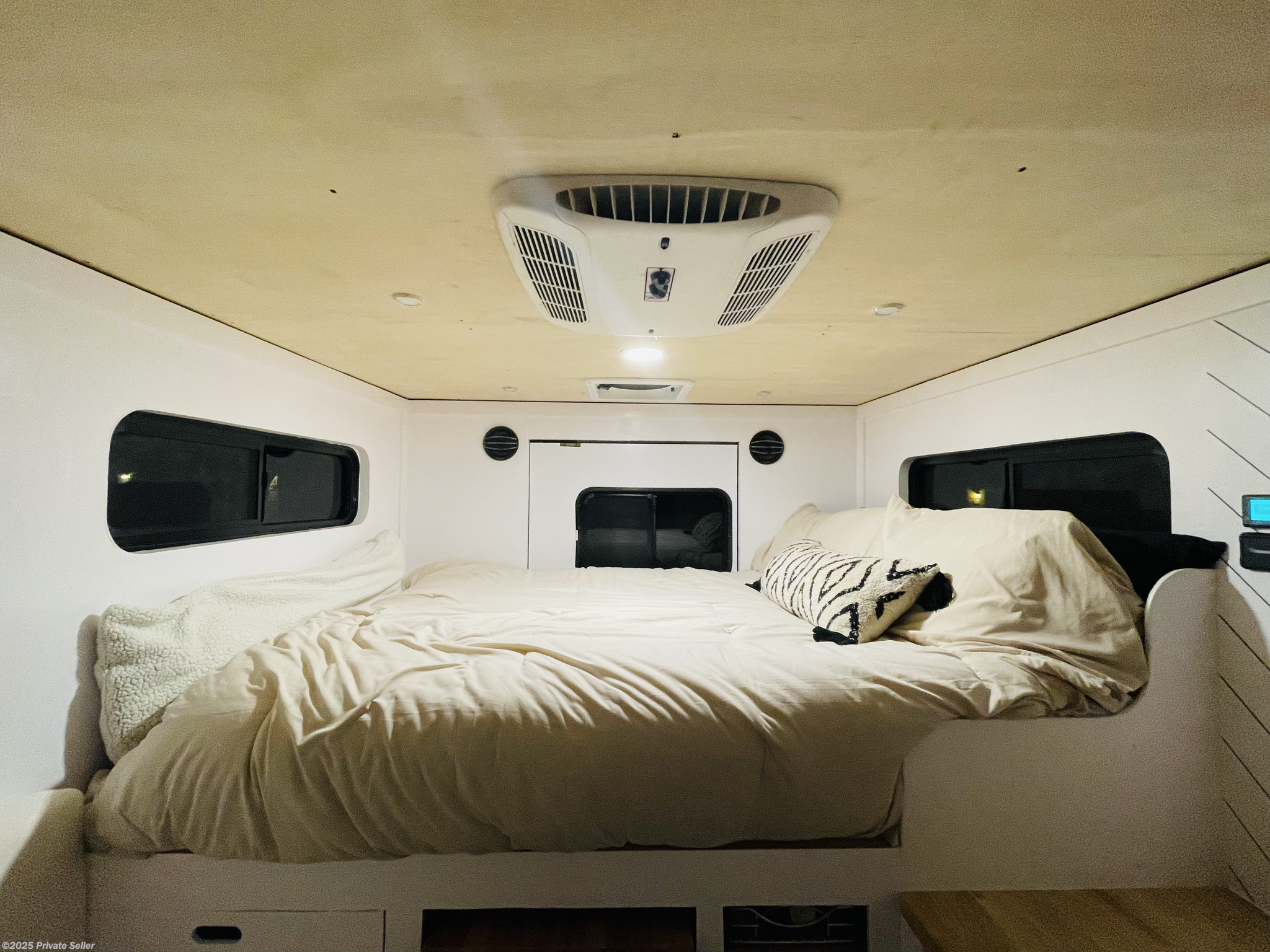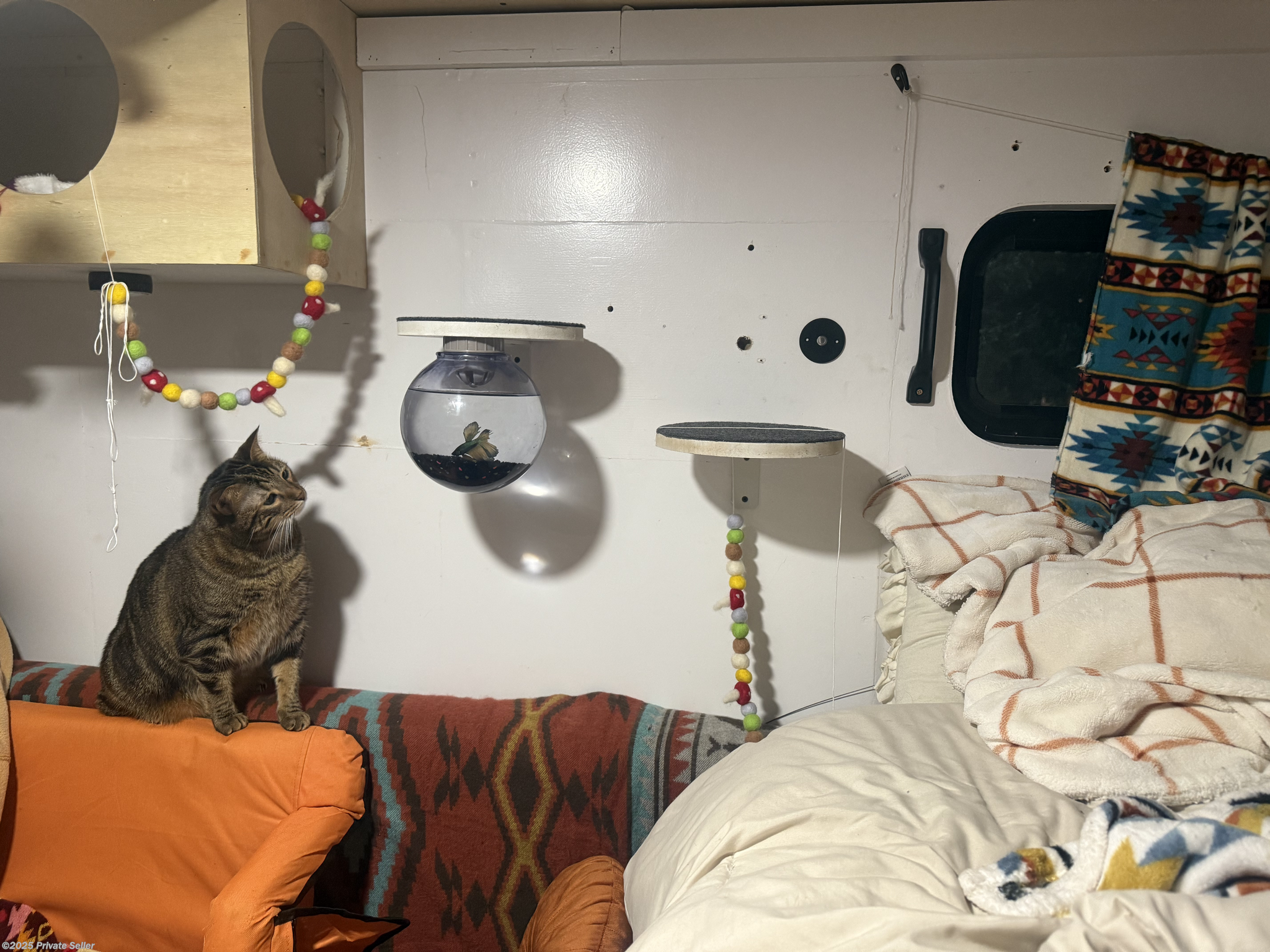 Step inside and you’ll feel like you’ve entered a modern city studio — stylish, spacious, and loaded with thoughtful details. There’s a queen-size bed, kitchen, couch, pull-out fridge/freezer, and even a custom cat wall (convertible to storage). Comfort comes standard with AC/heat, plus a diesel heater for quiet, efficient warmth.