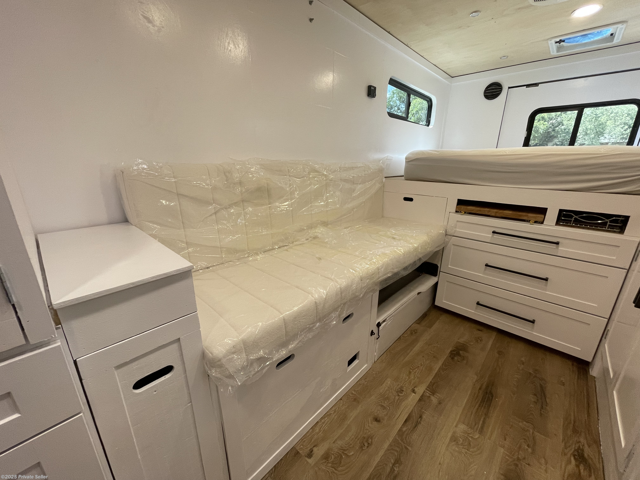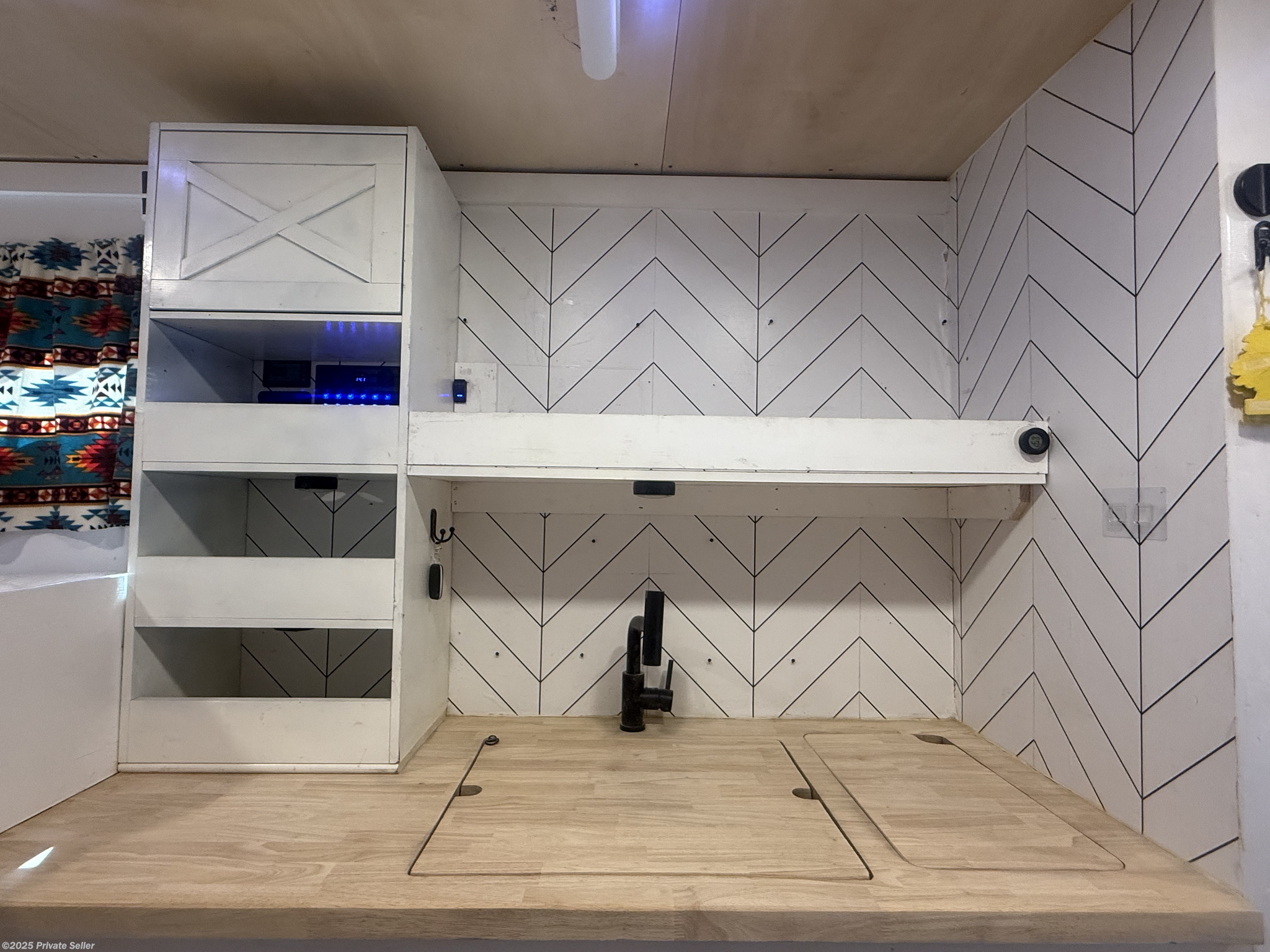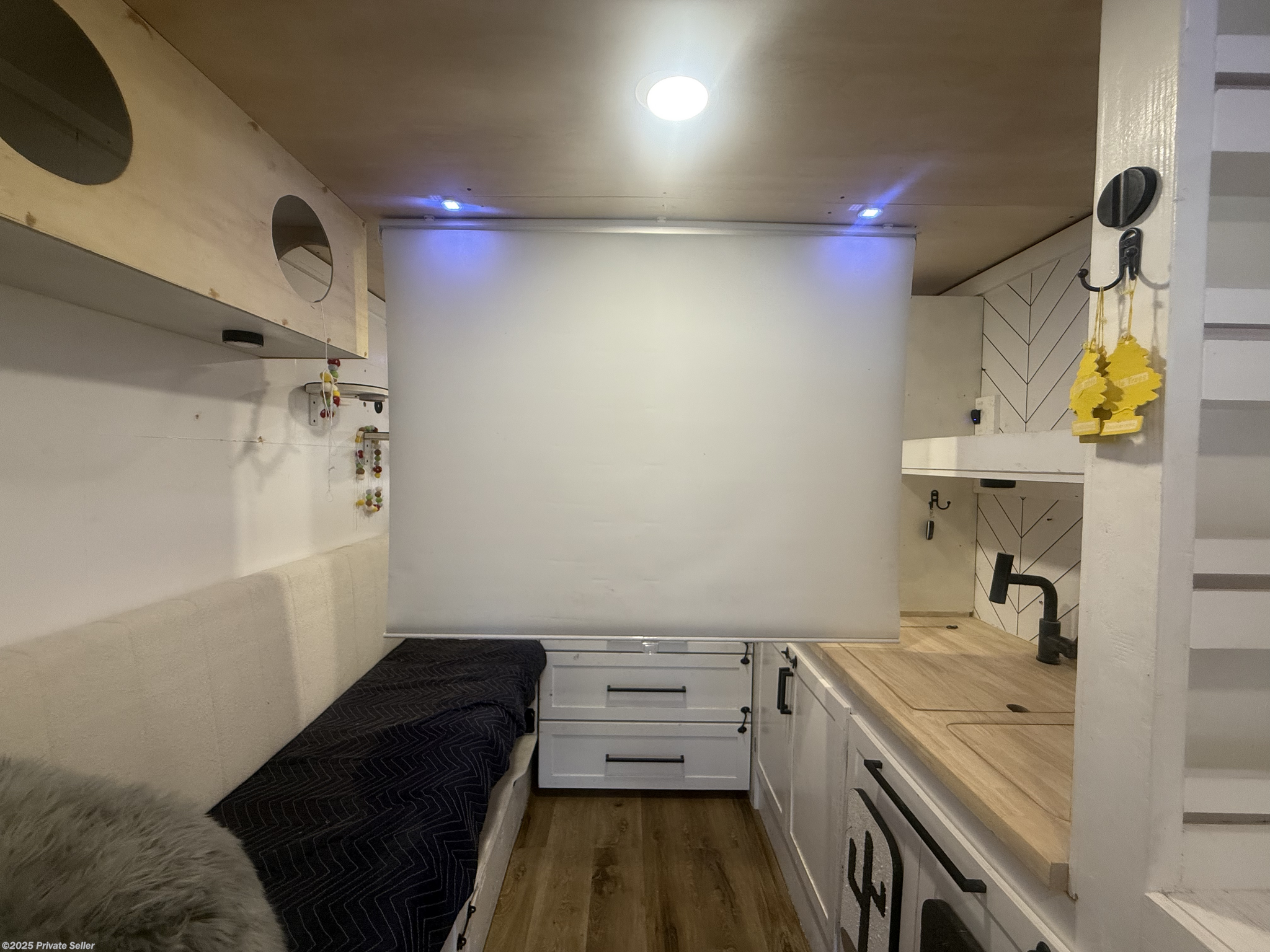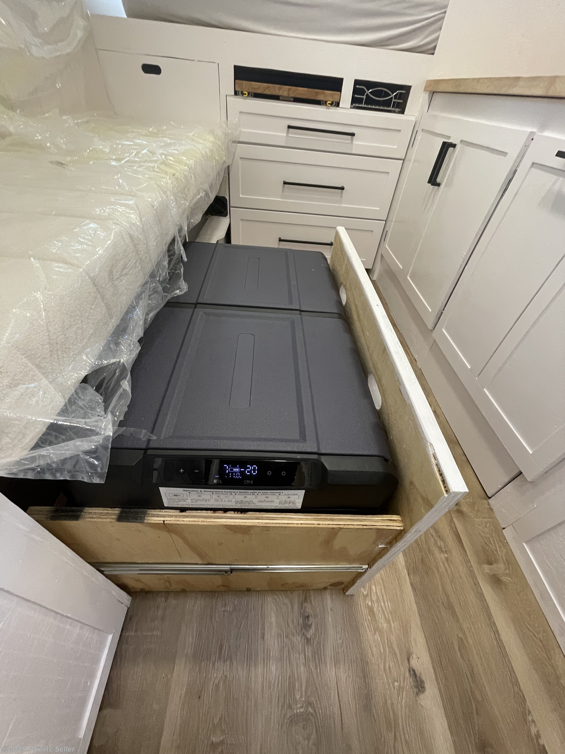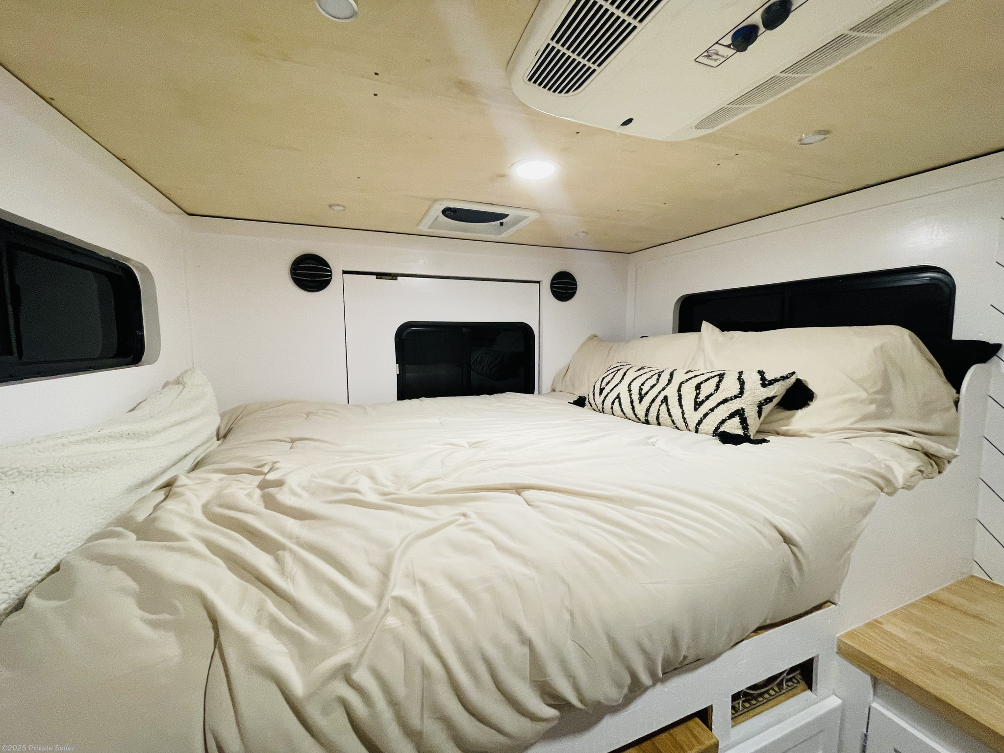 Step inside and you’ll feel like you’ve entered a modern city studio — stylish, spacious, and loaded with thoughtful details. There’s a queen-size bed, kitchen, couch, pull-out fridge/freezer, and even a custom cat wall (convertible to storage). Comfort comes standard with AC/heat, plus a diesel heater for quiet, efficient warmth.