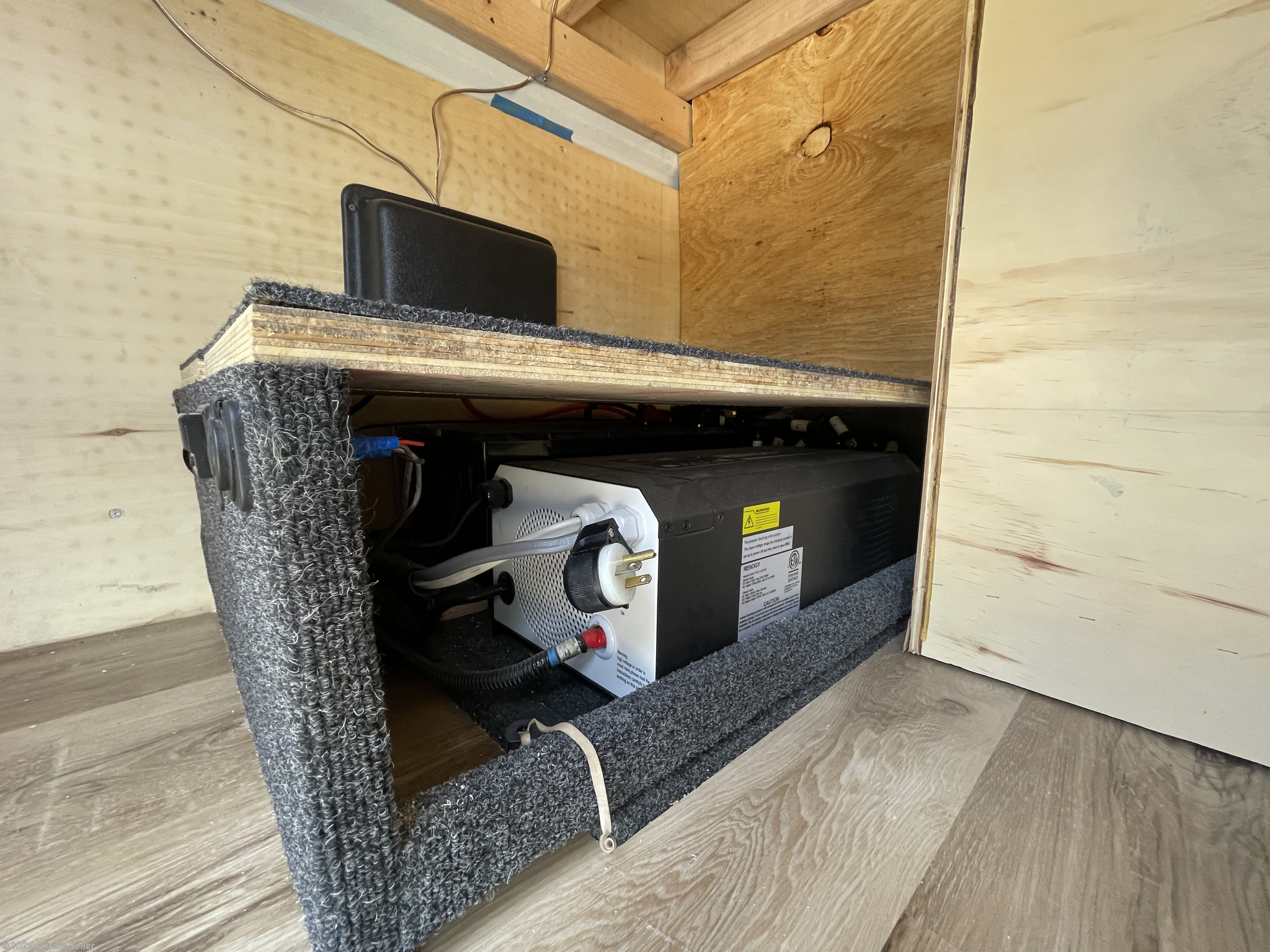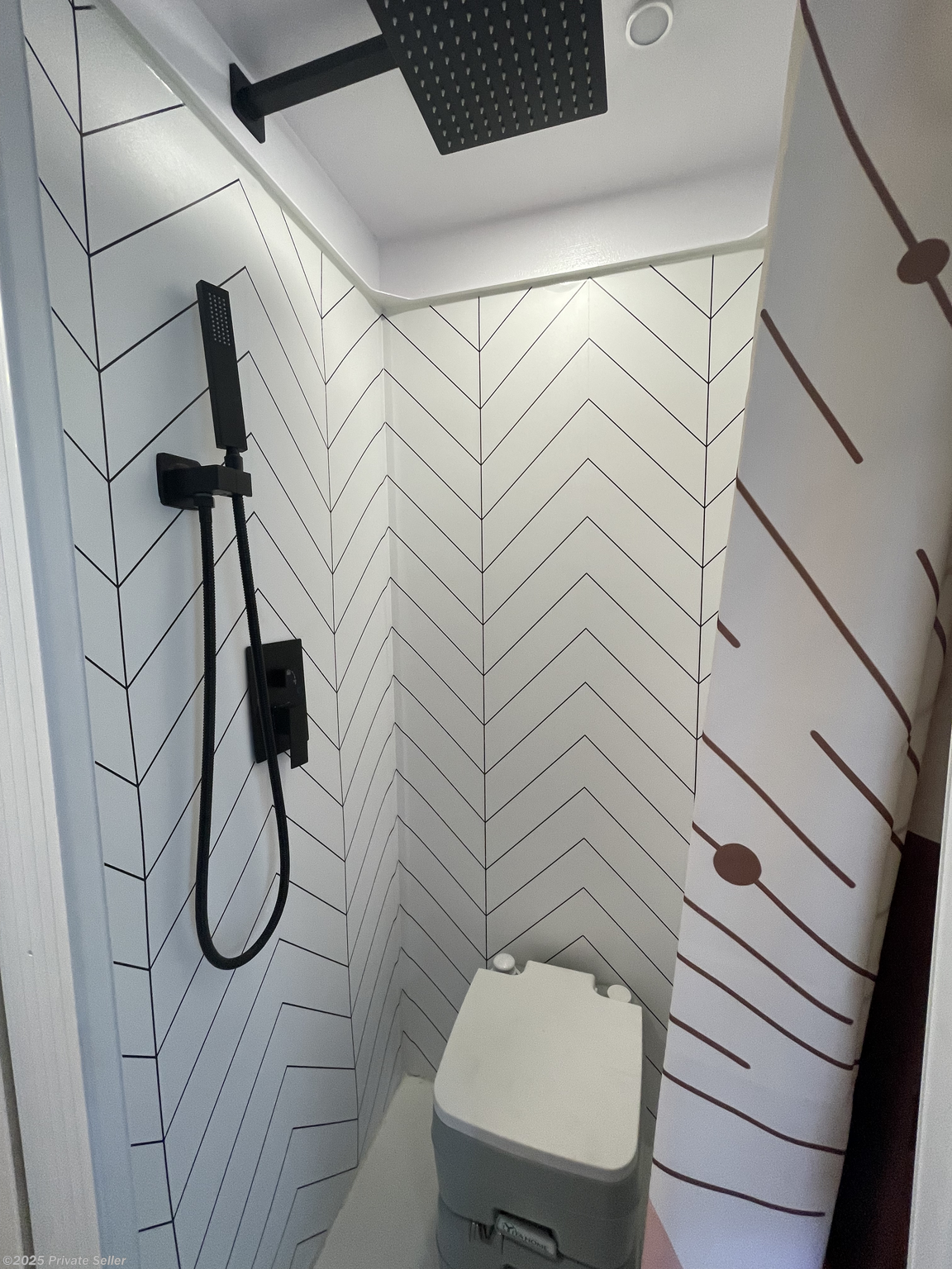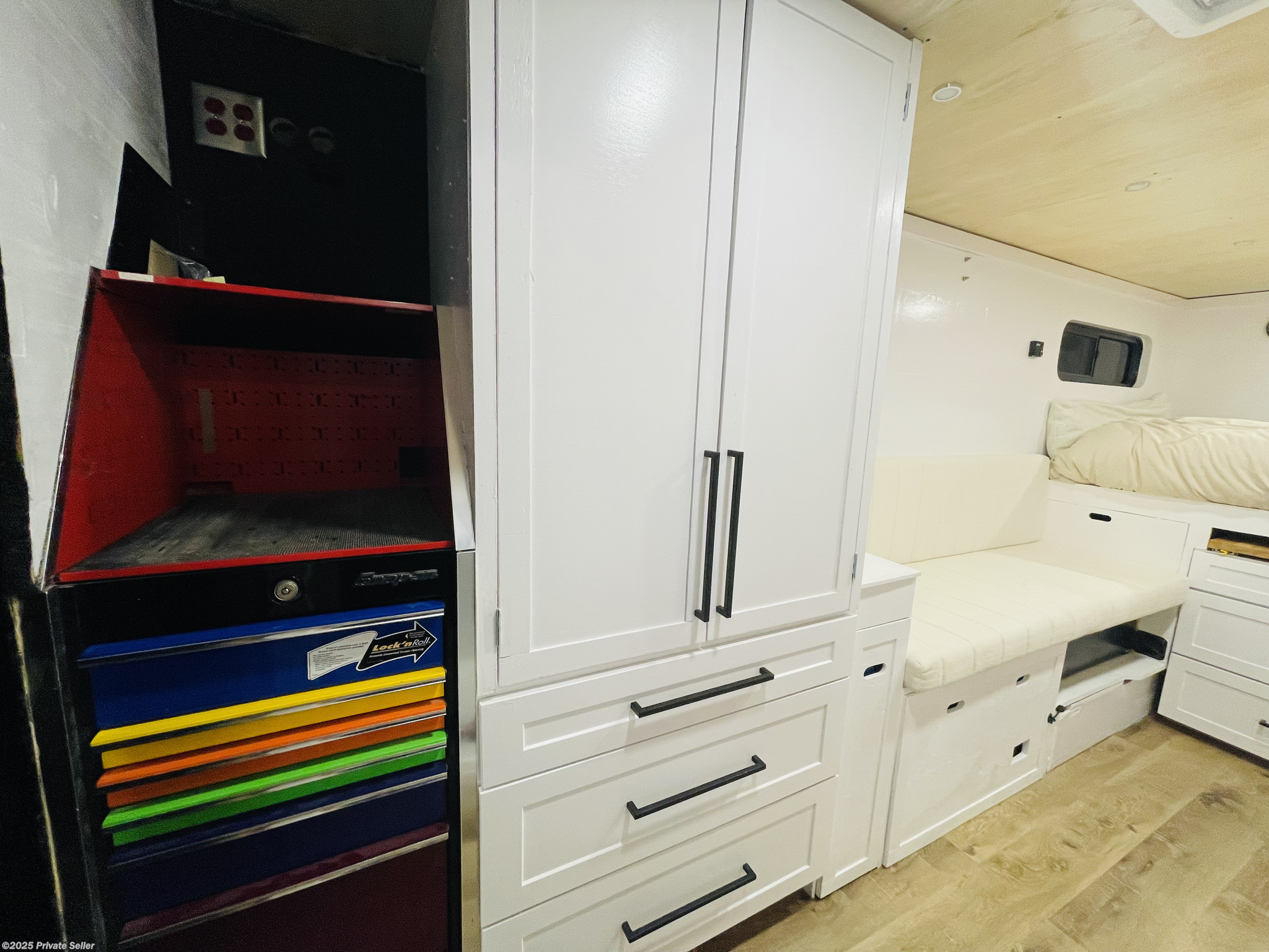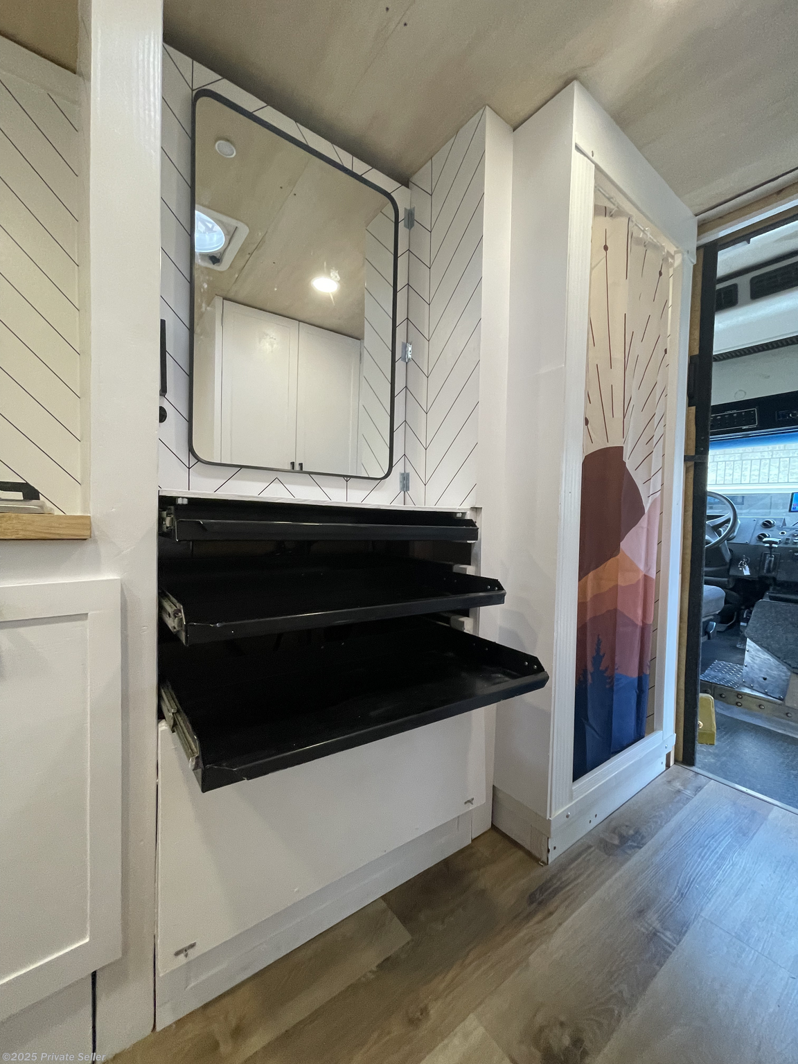 Step inside and you’ll feel like you’ve entered a modern city studio — stylish, spacious, and loaded with thoughtful details. There’s a queen-size bed, kitchen, couch, pull-out fridge/freezer, and even a custom cat wall (convertible to storage). Comfort comes standard with AC/heat, plus a diesel heater for quiet, efficient warmth.