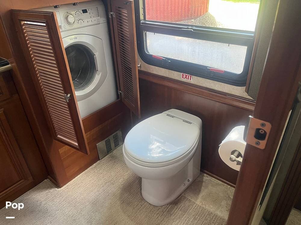 This luxury coach is also equipped with a queen-sized, power-adjustable, ultra-comfortable bed, a stacked washer & dryer, and even features an additional half-bath.