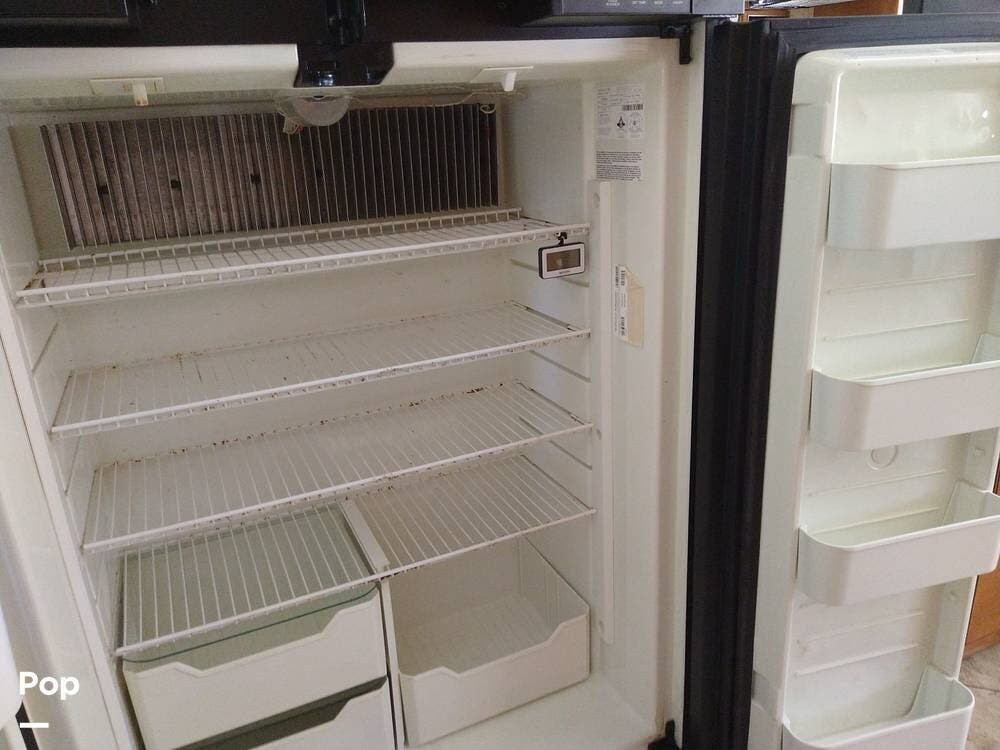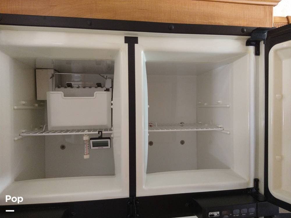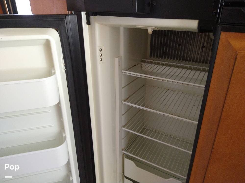 The spacious living area is opened up by a full-wall slide, creating room for a sofa sleeper, recliner, and free-standing dinette. Rich hardwood cabinetry throughout provides ample storage.