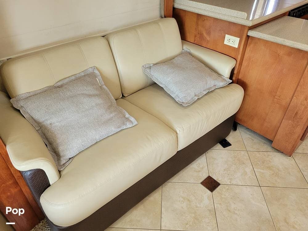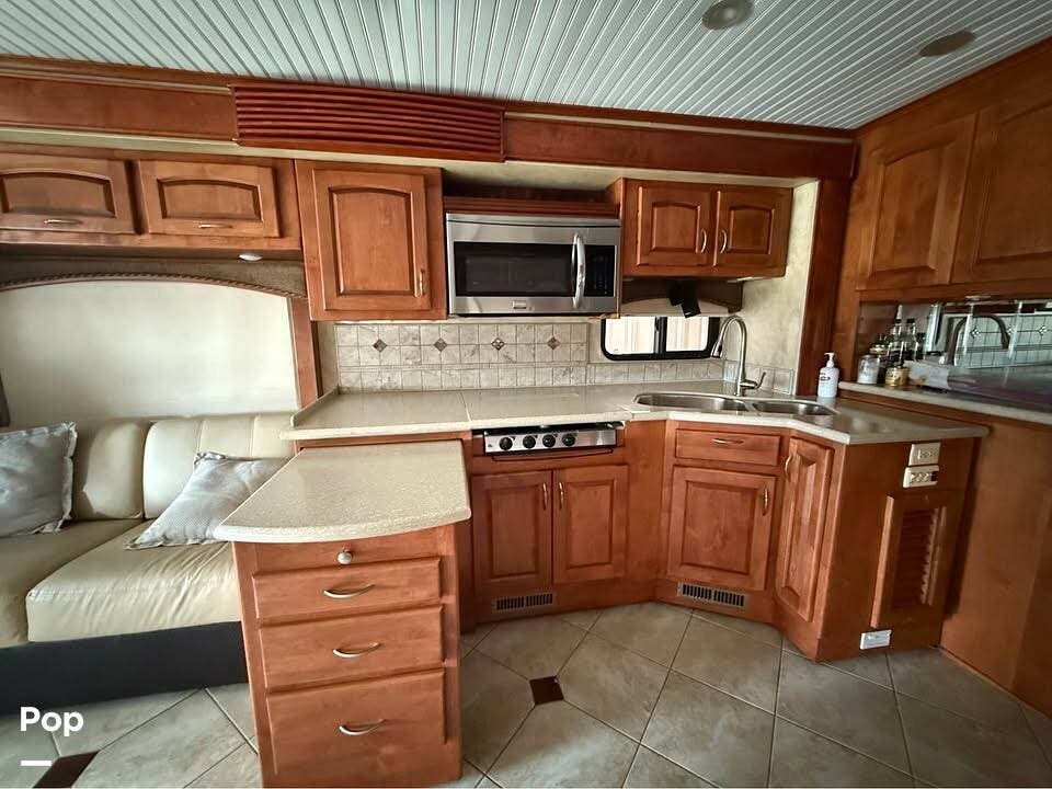 The living area includes two leather sleeper sofas, a dinette, and a well-equipped kitchen with a double sink, stovetop, oven, microwave, refrigerator/freezer, and plenty of cabinet and countertop space.