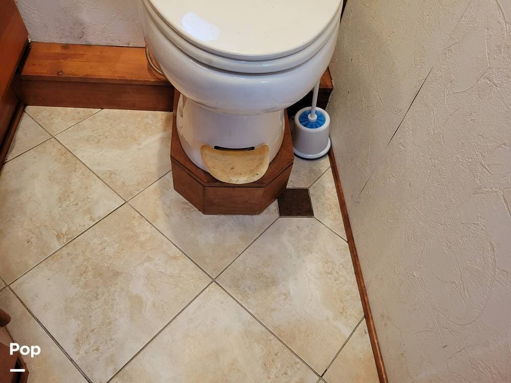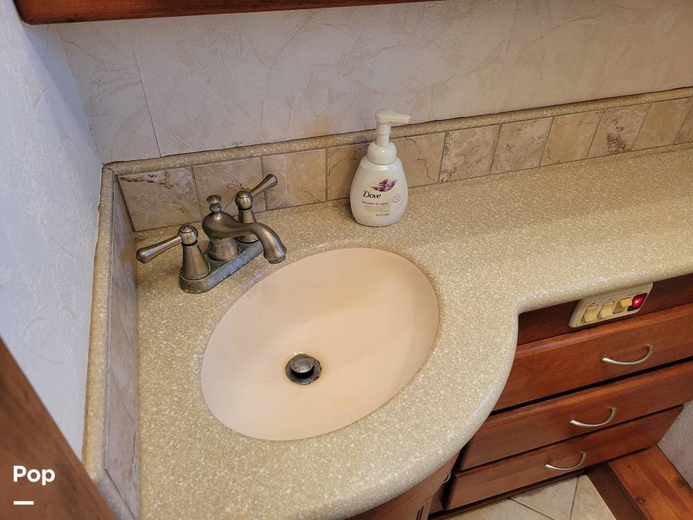 A half bath is located just past the living area before the bedroom suite and features all the expected amenities, including a sink and a toilet.