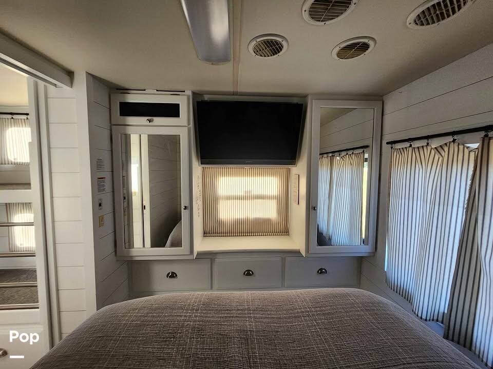 This beautiful coach has plenty of room for sleeping and storing your items. There's also a TV for your entertainment needs.