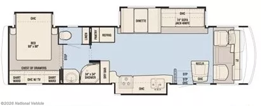 In the rear, the master suite offers a walk-around queen bed, ample wardrobe storage, and direct access to the full rear bathroom with a corner shower, linen cabinet, and washer/dryer prep. Additional features include dual air conditioners, hydraulic leveling jacks, a power awning, and abundant basement storage?making this coach ready for life on the road.