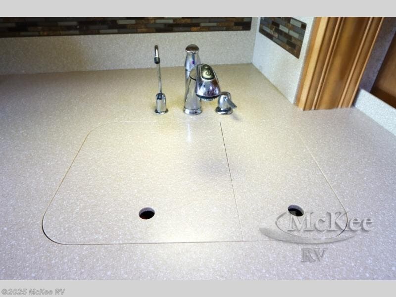 Bathroom: Large shower, vanity, and porcelain toilet for at-home convenience on the road.