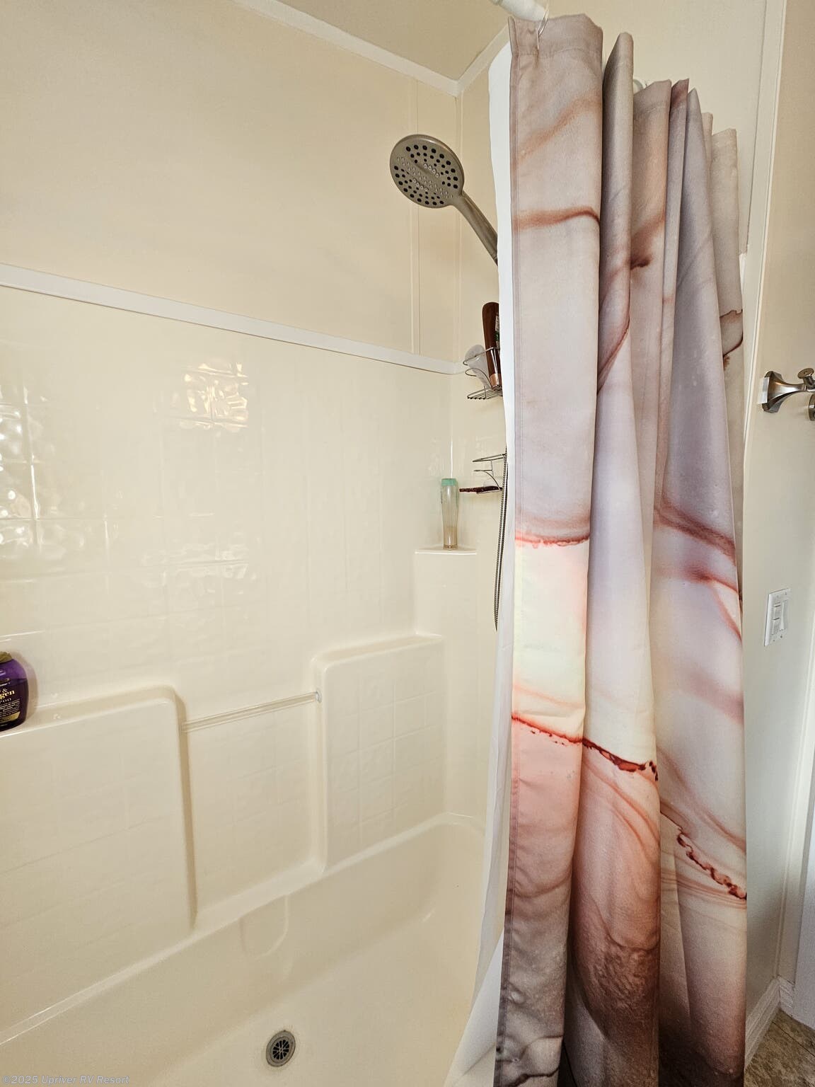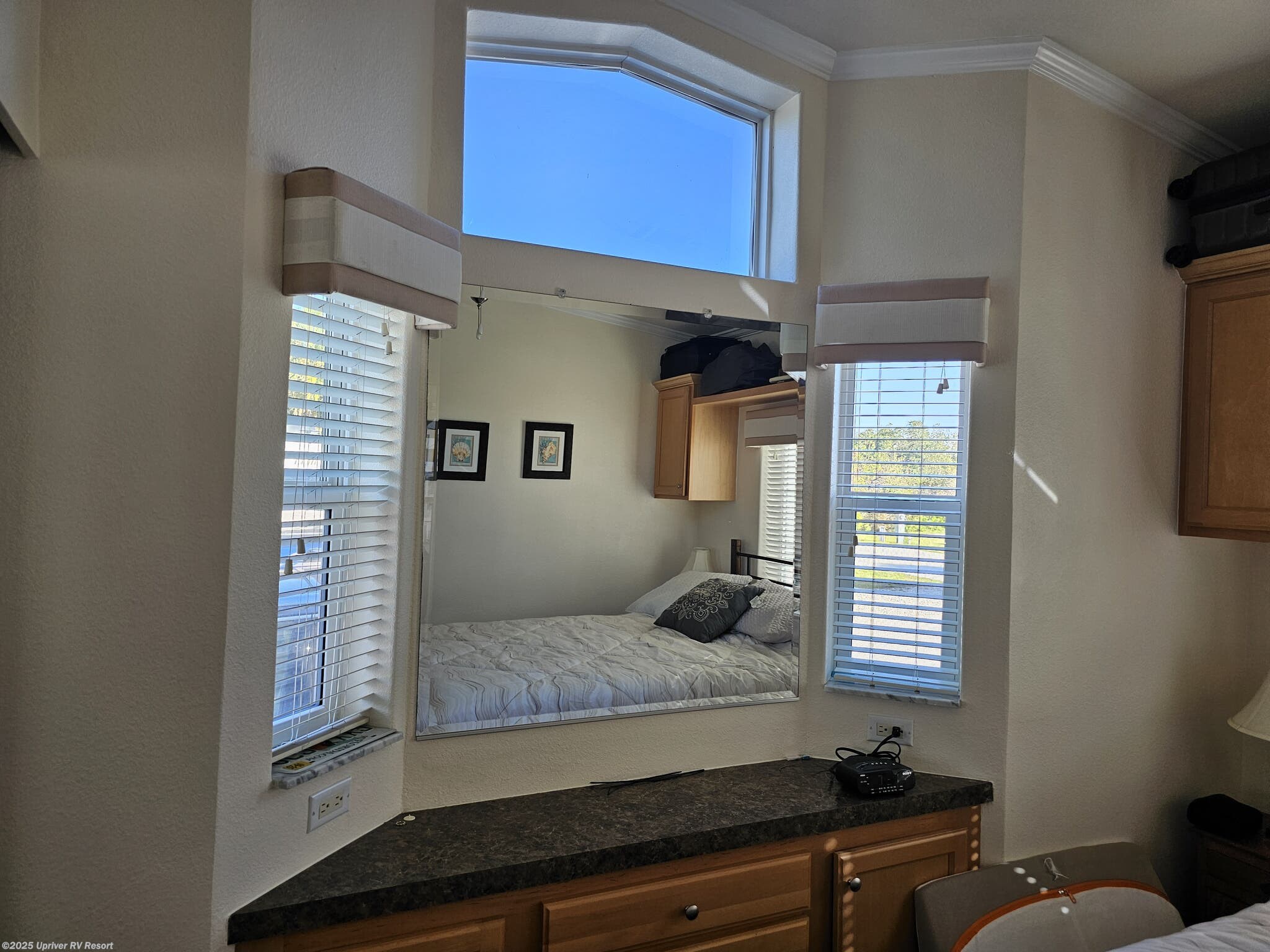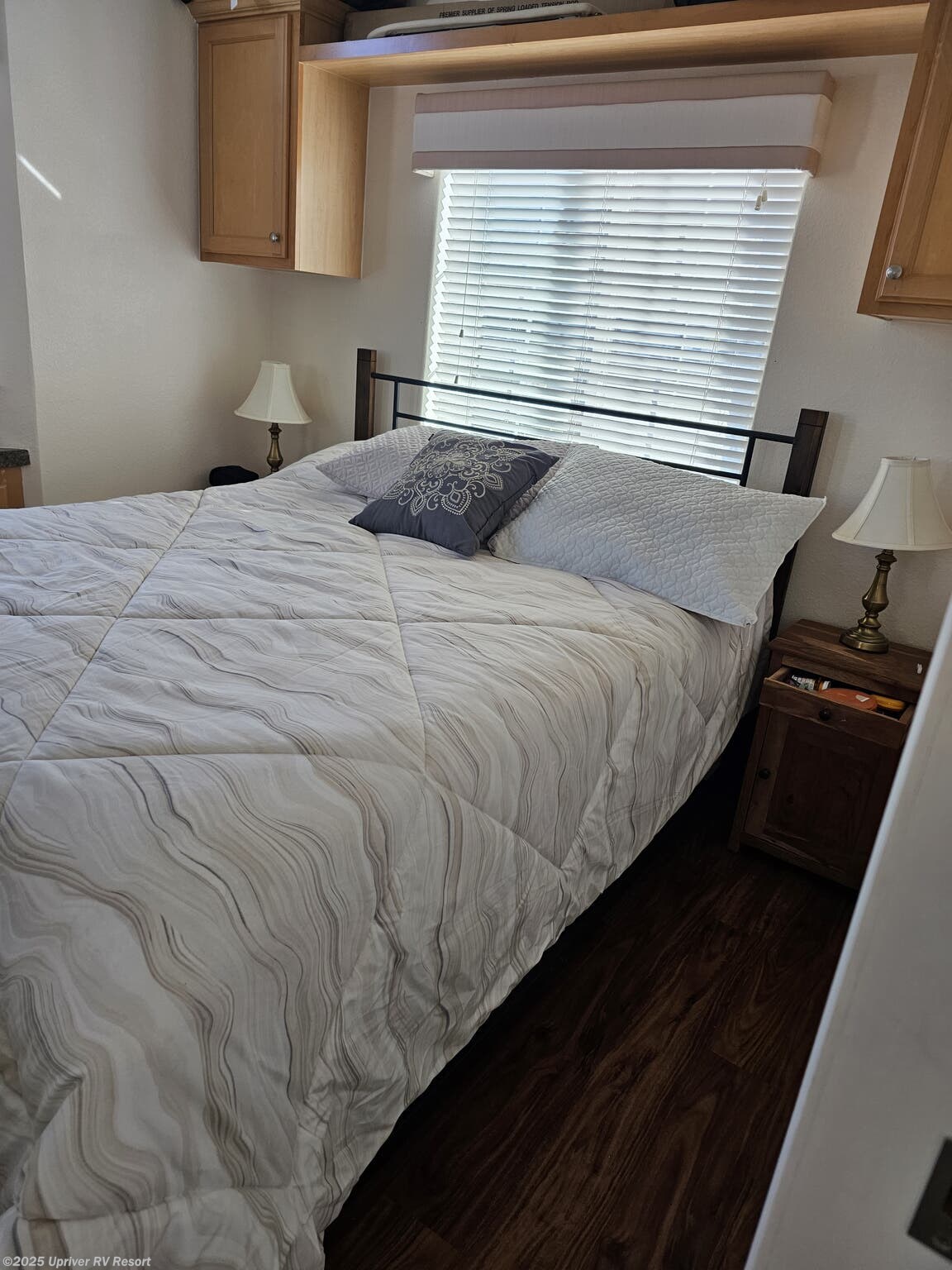 Leaving two ground deck boxes, stand up shed and metal storage cabinet. Bedroom with queen, two end tables with lamps, ceiling fan and tv.