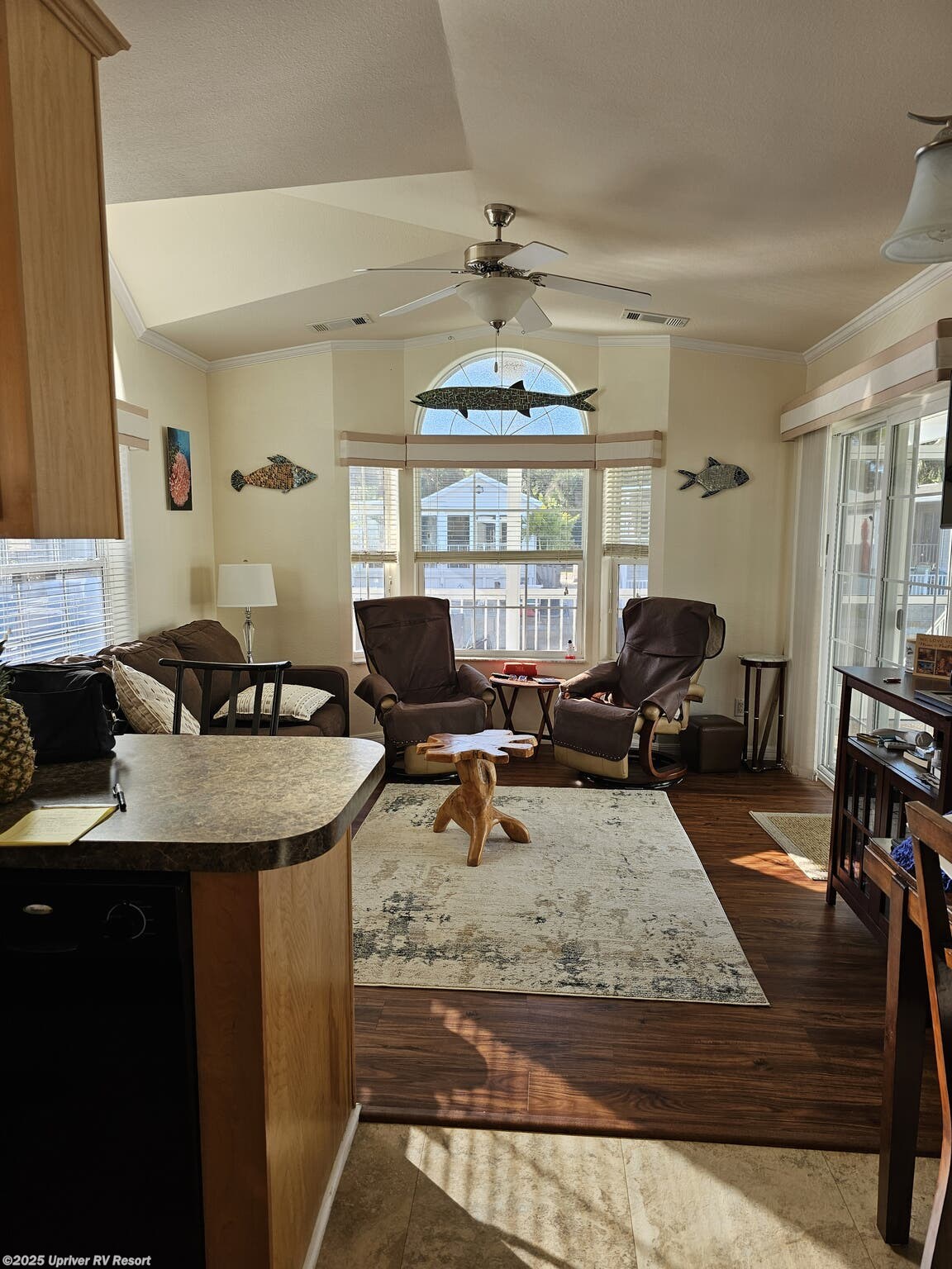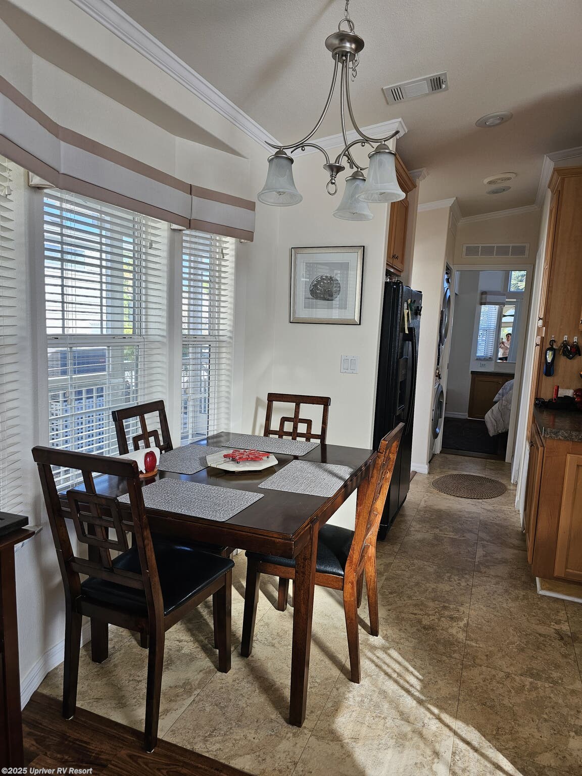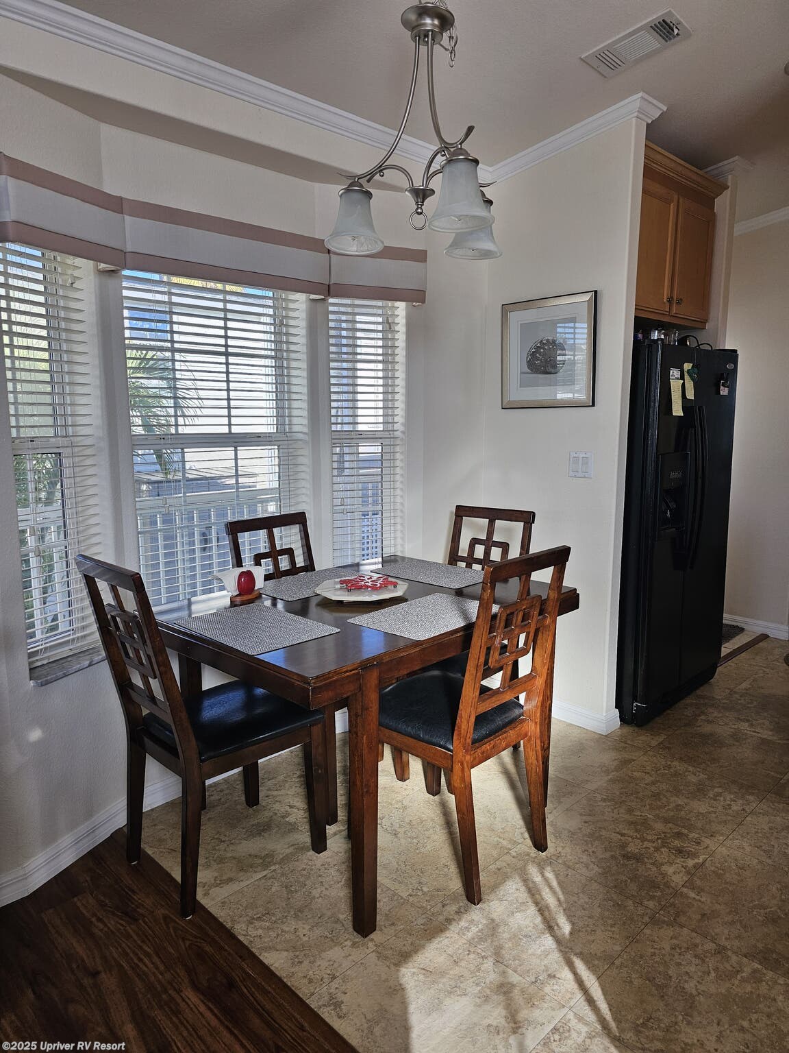 small coffee table, pillows, ceiling fan, dvd player. Eat in bump out area off kitchen with table and 4 chairs.
