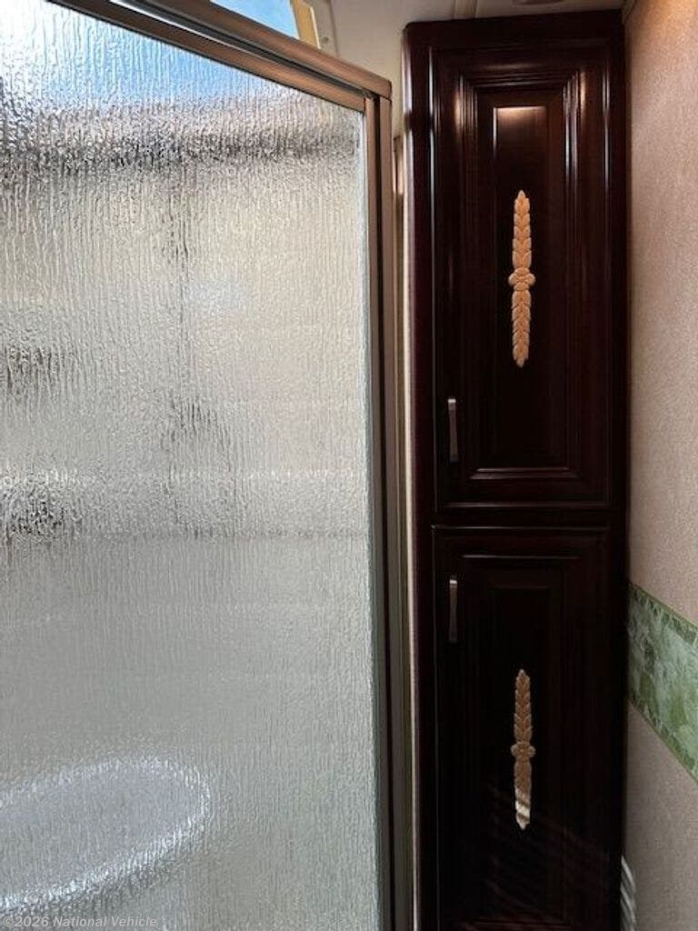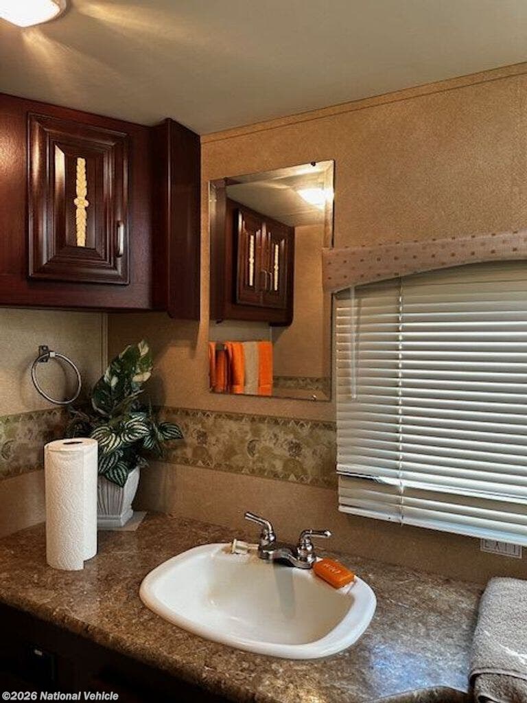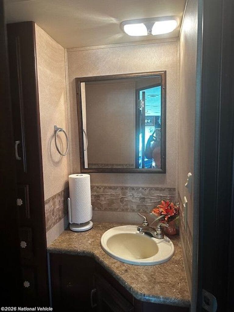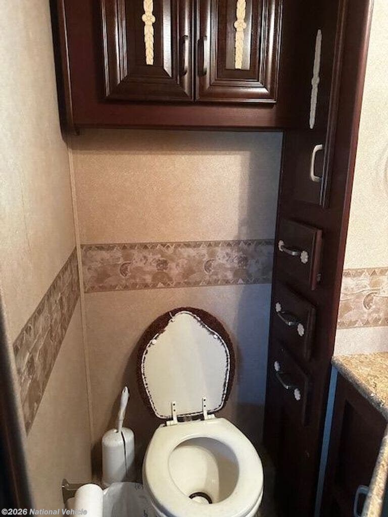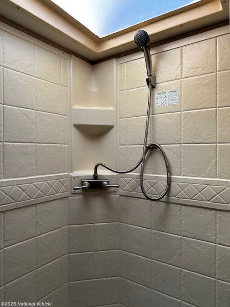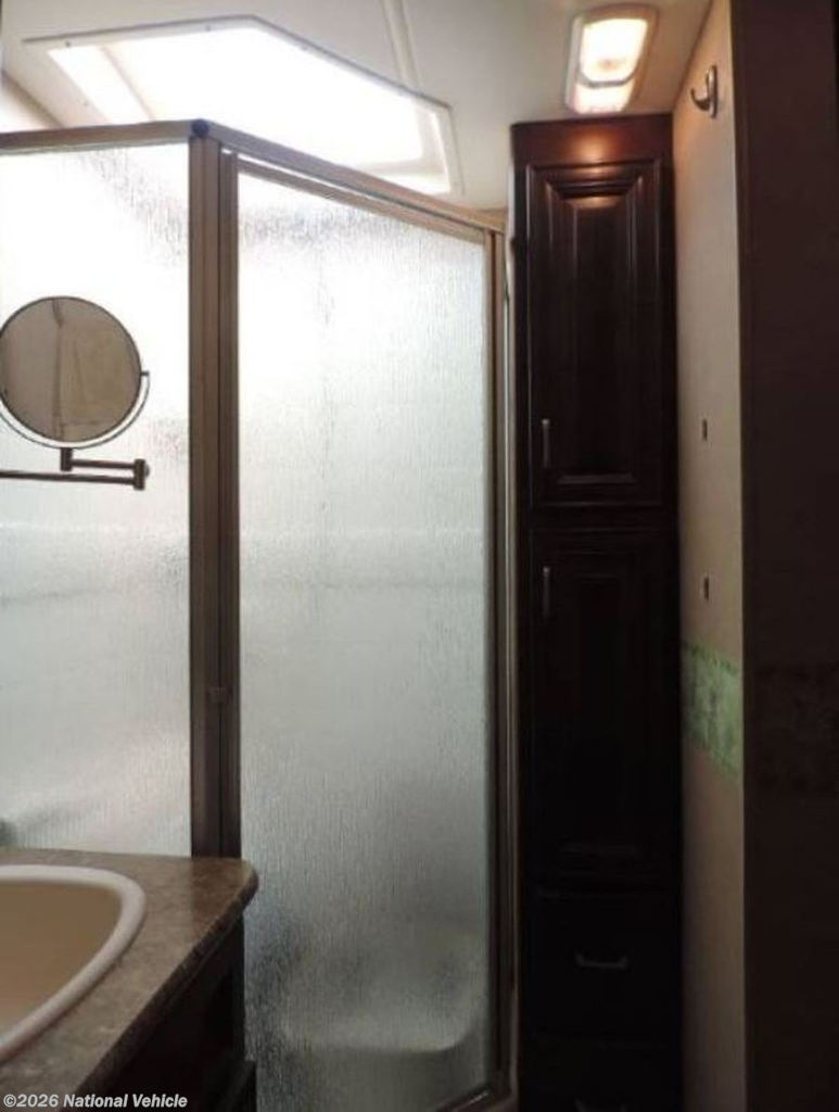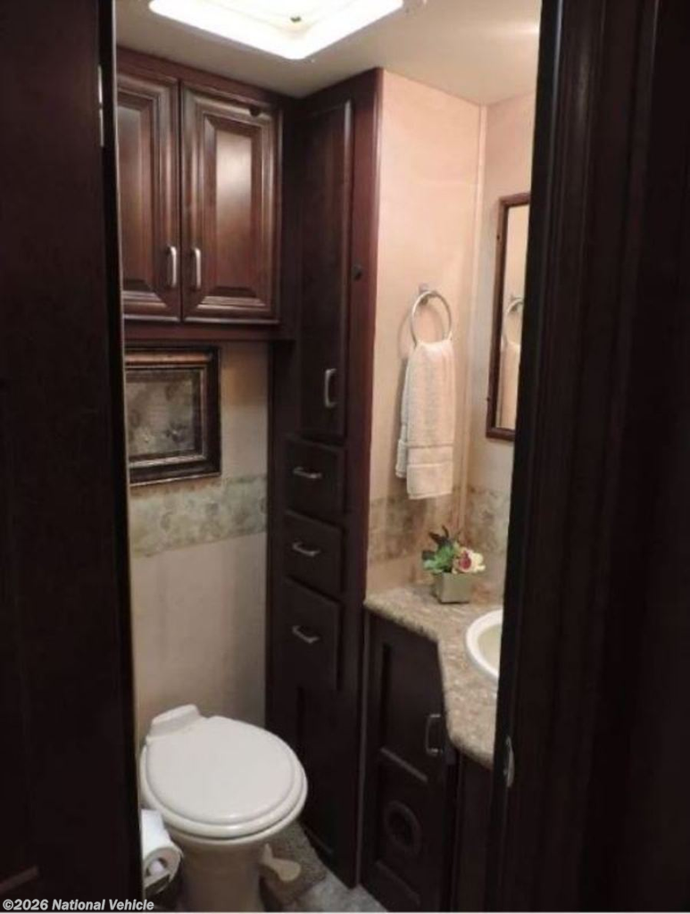 This coach features a bathroom complete with shower, toilet, and a sink with a medicine cabinet above for your convenience.