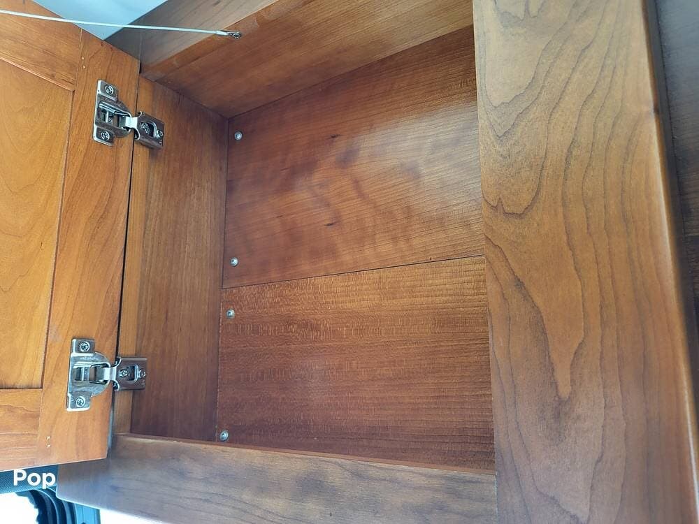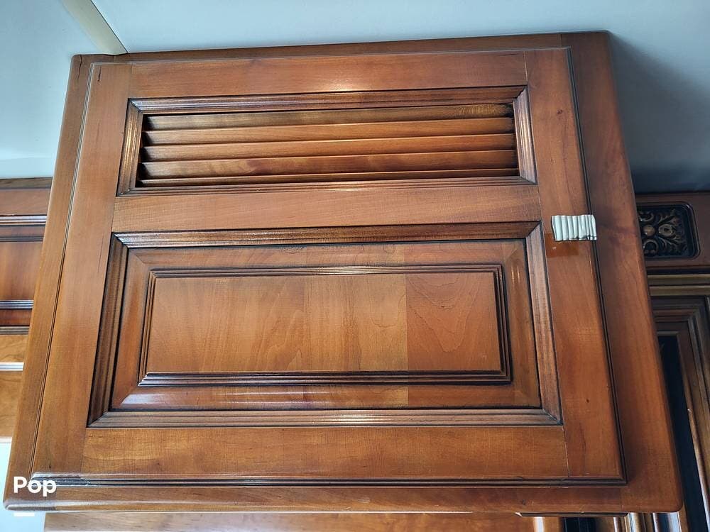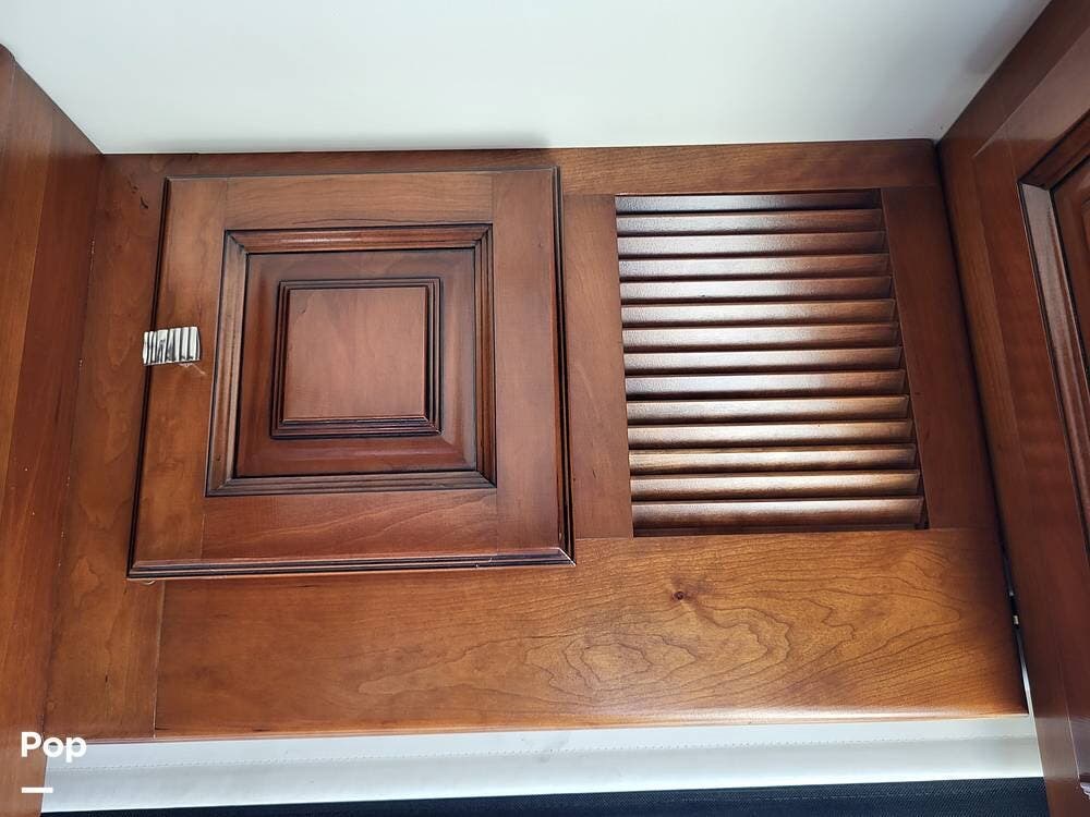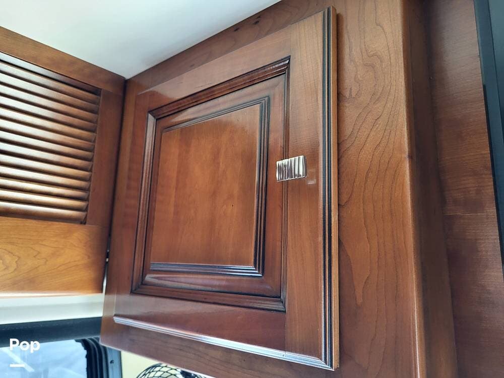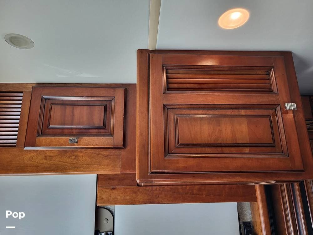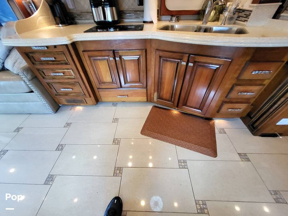 The luxurious interior showcases porcelain tile flooring with intricate inlays, glazed cherry solid wood cabinetry, and power shades that add to the refined ambiance.