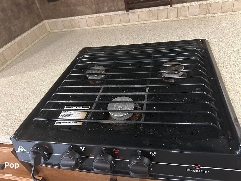 Slide-out galley with double sink, 3-burner range, overhead cabinets, residential refrigerator, and ample counter space for meal prep on the go.