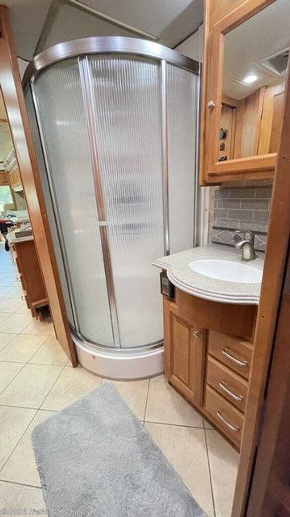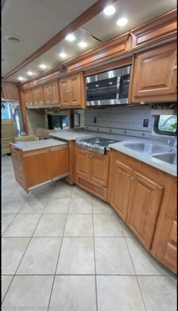 Inside, the Phaeton 40QTH impresses with a spacious quad-slide layout that maximizes comfort and living space. The elegant interior features high-end hardwood cabinetry, solid surface countertops, and premium furnishings that create a warm, residential feel. The well-equipped kitchen includes a residential refrigerator, convection microwave, and three-burner cooktop?making meal preparation effortless on the road. The master suite offers a walk-around queen bed, generous wardrobe storage, and a private TV, while the luxurious rear bathroom features a glass shower and solid surface vanity.