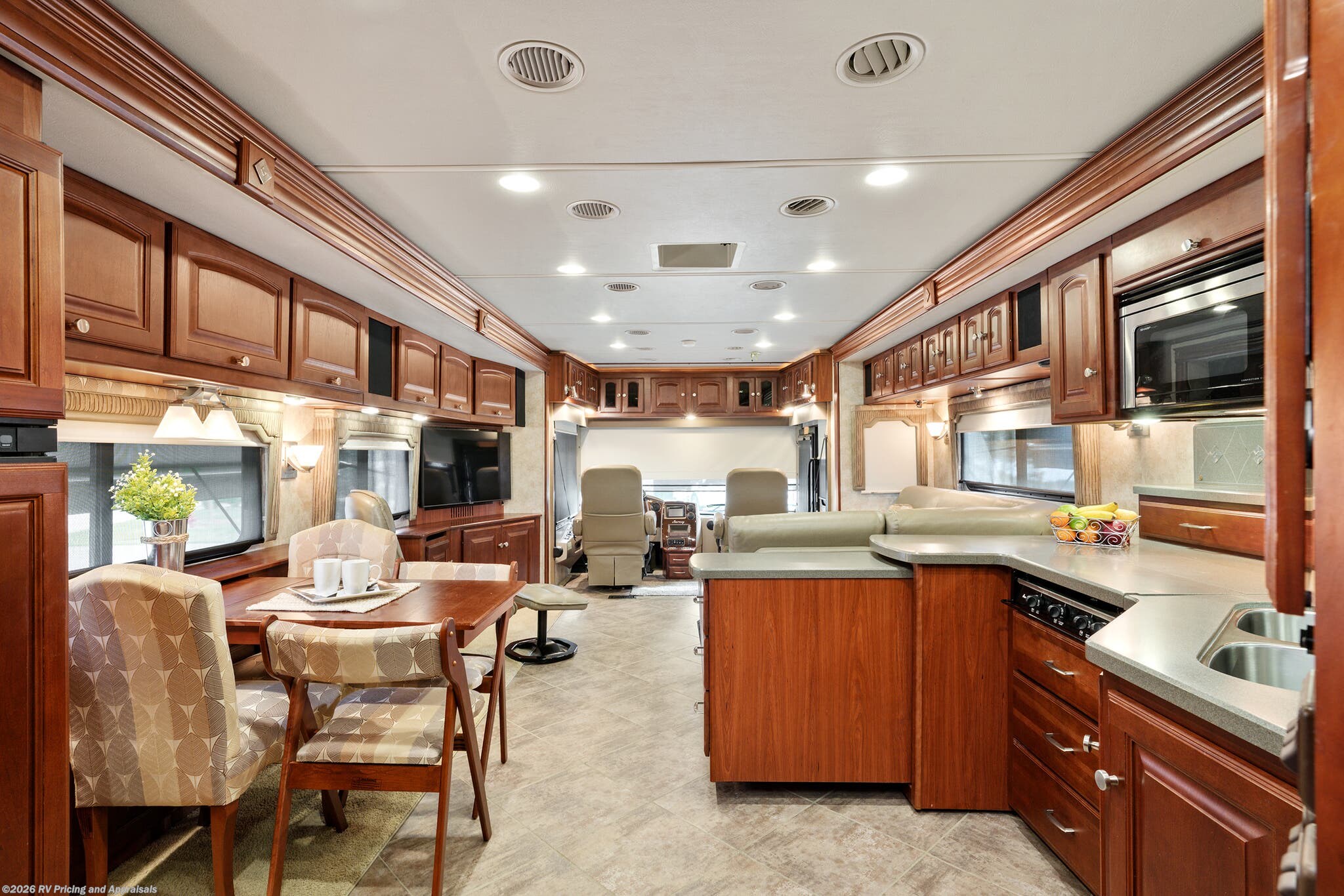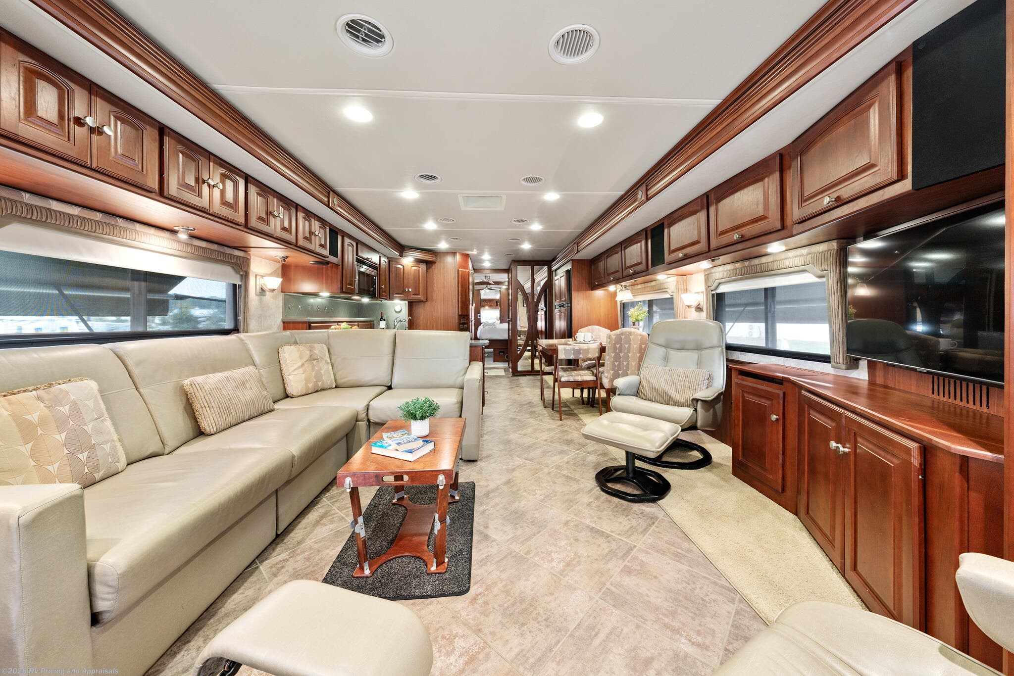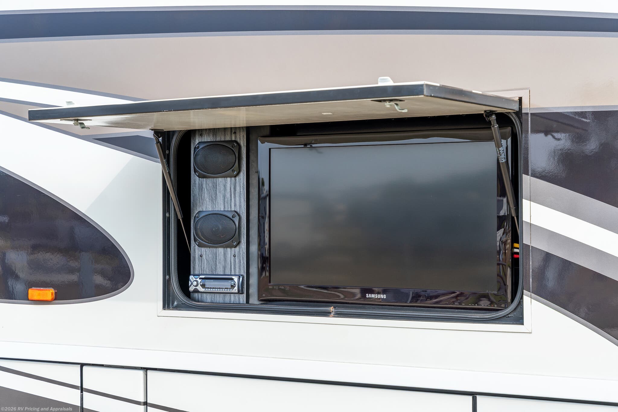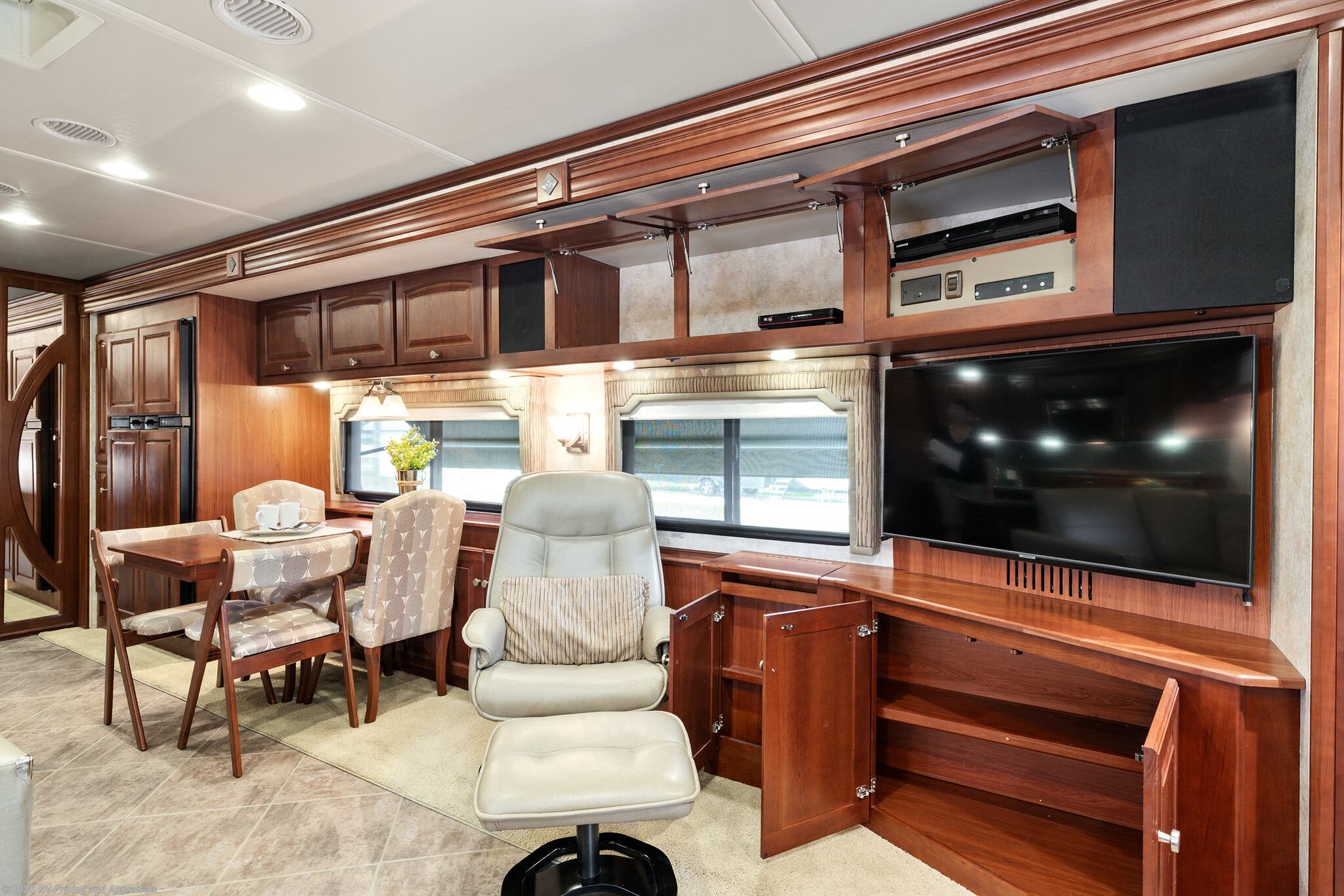 •Entertainment: Exterior TV/DVD/radio combo plus two interior upgraded 4K Smart TVs with Blu-Ray and home theater surround sound for cinematic experiences. Satellite radio capable.