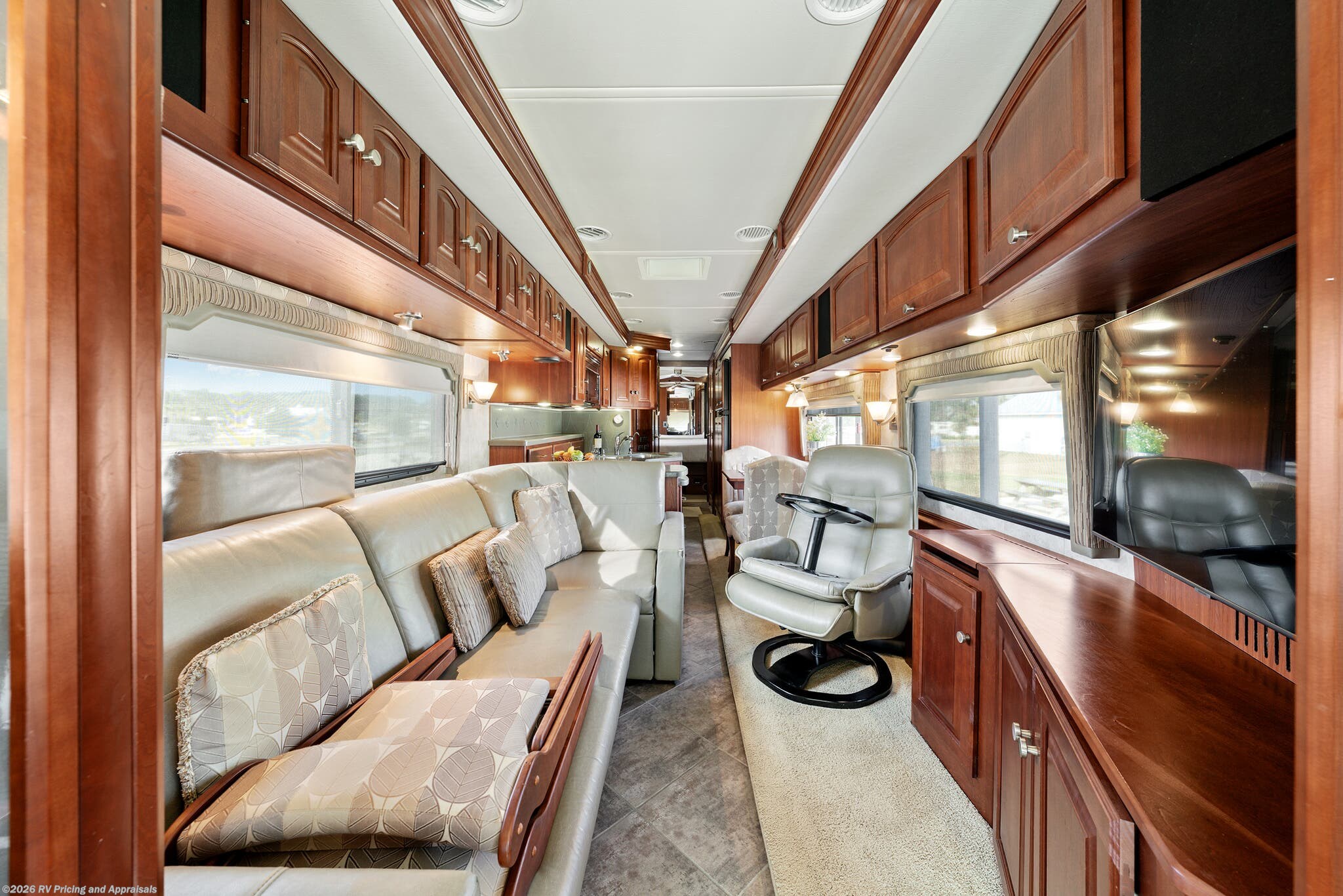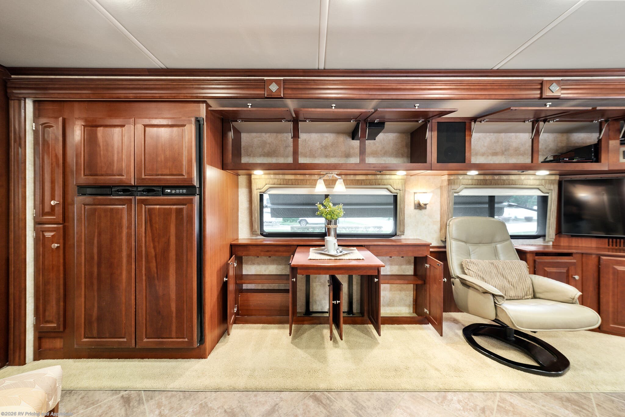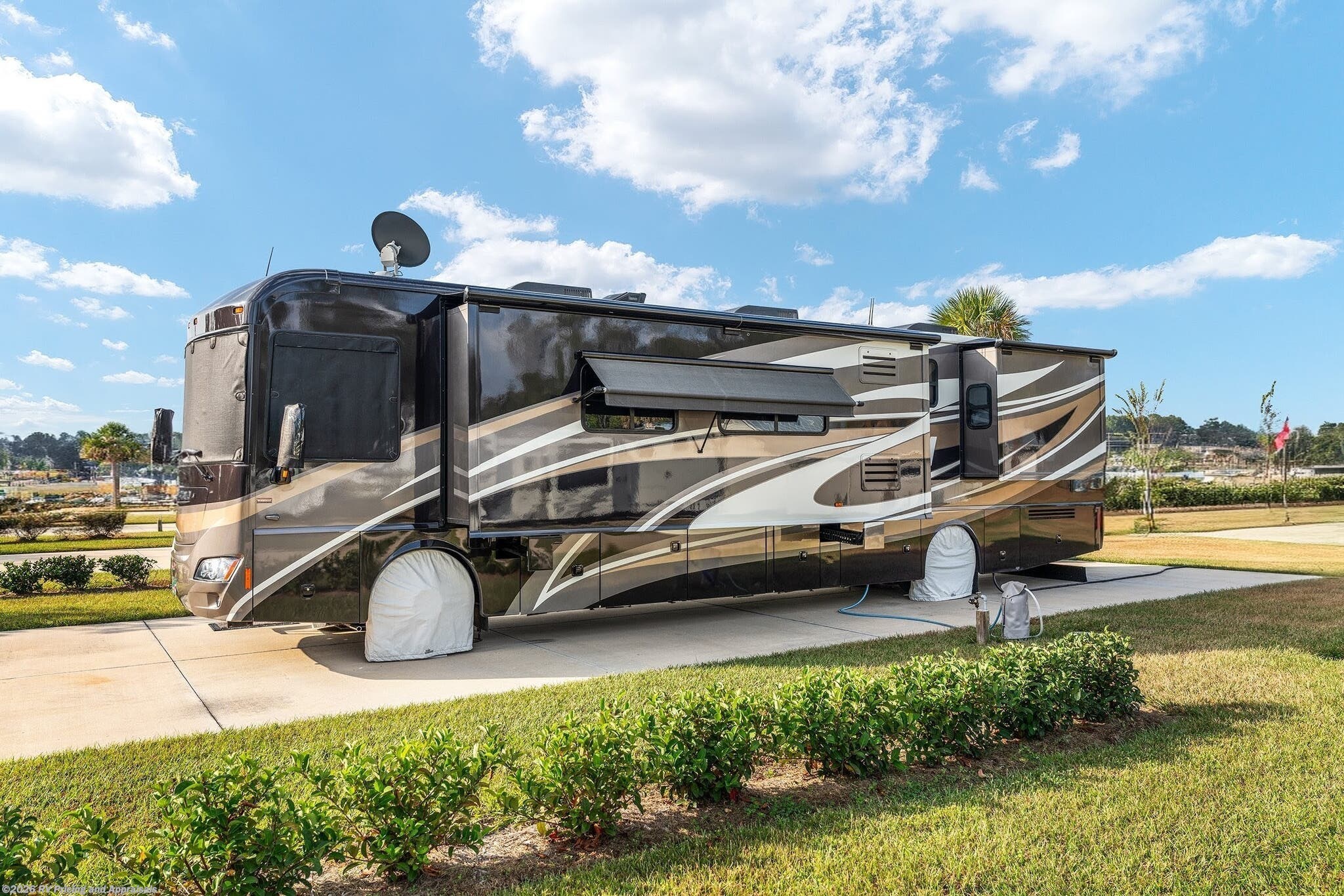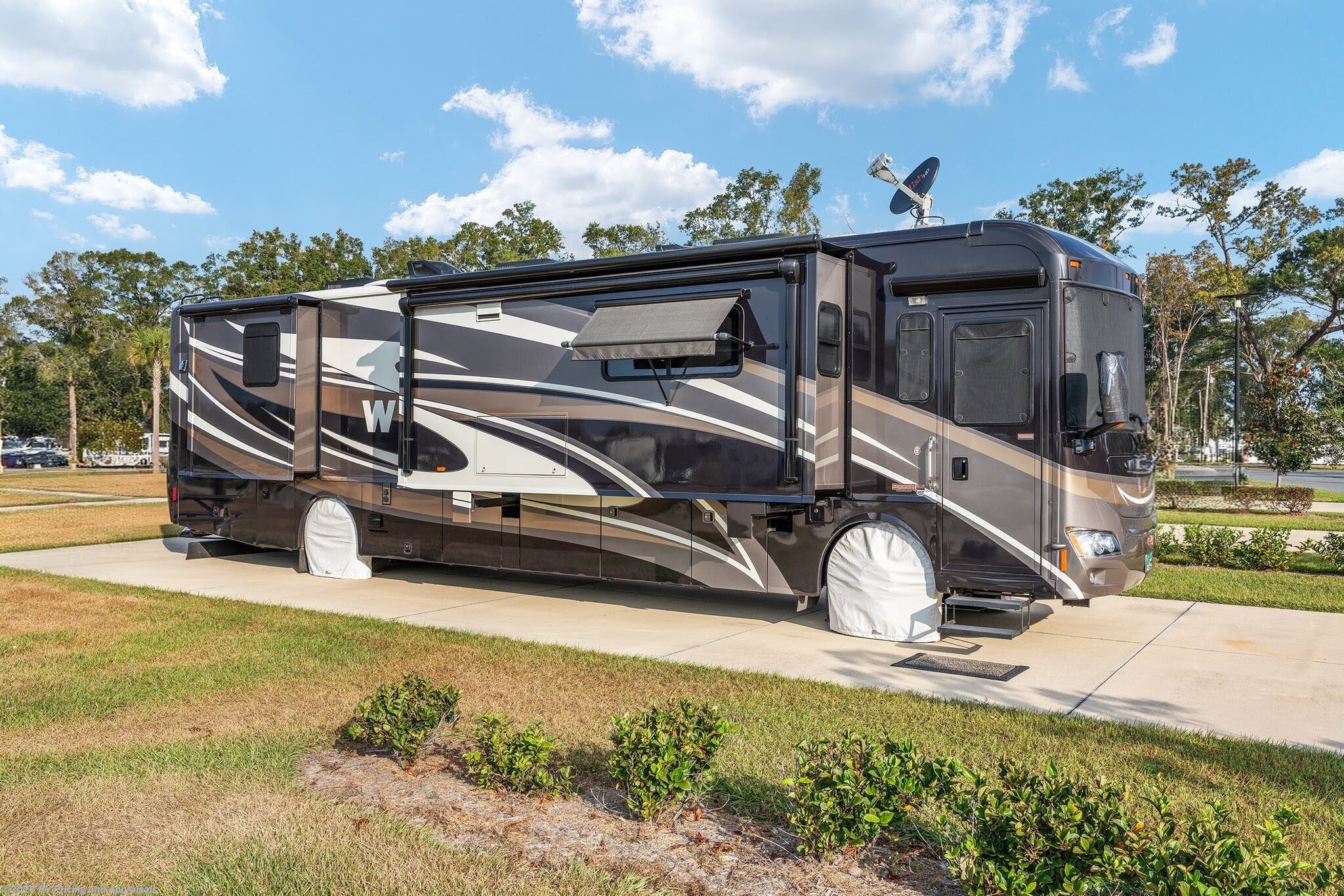 •Entertainment: Exterior TV/DVD/radio combo plus two interior upgraded 4K Smart TVs with Blu-Ray and home theater surround sound for cinematic experiences. Satellite radio capable.